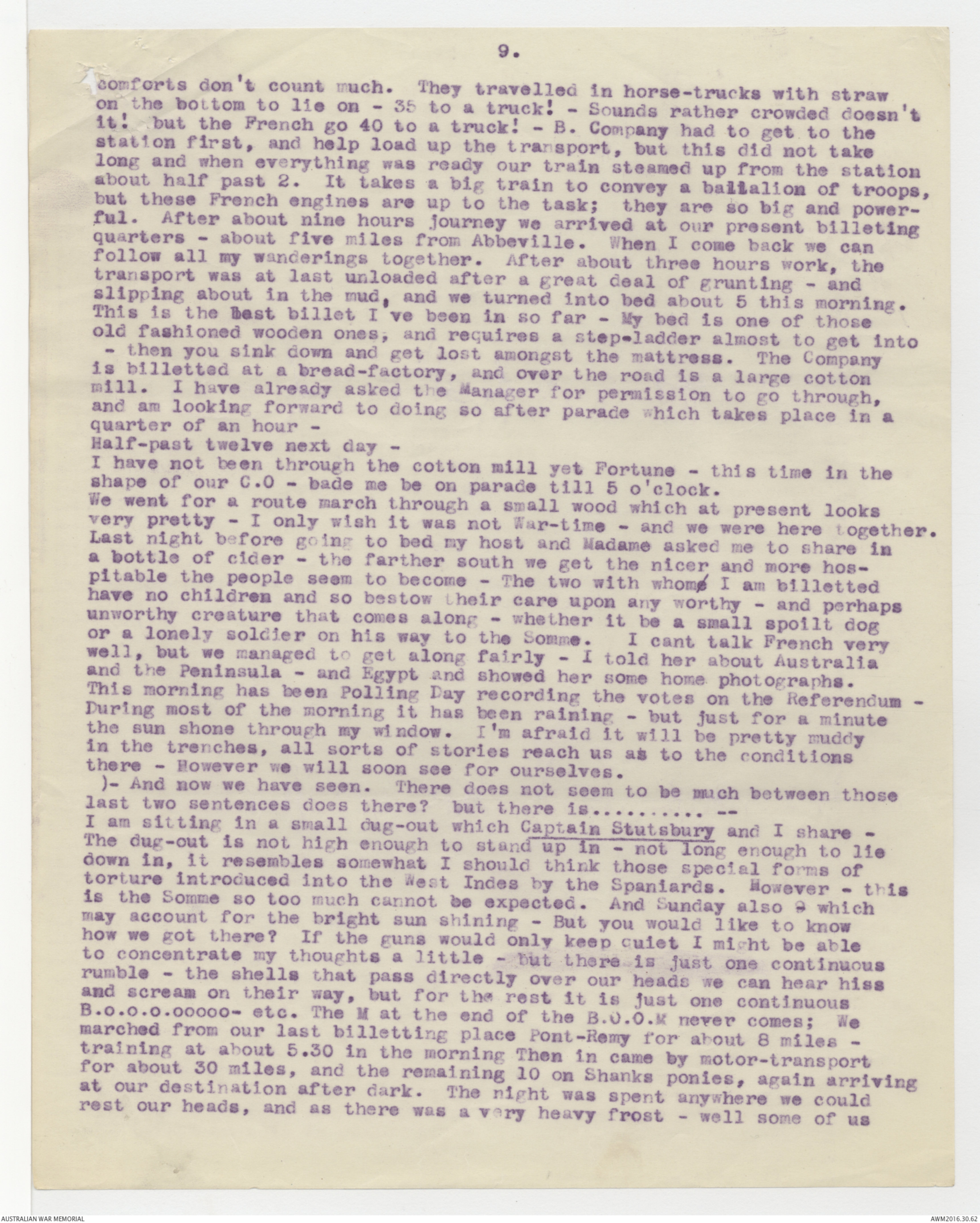I am sitting in a small dug-out which Captain Stutsbury and I share -