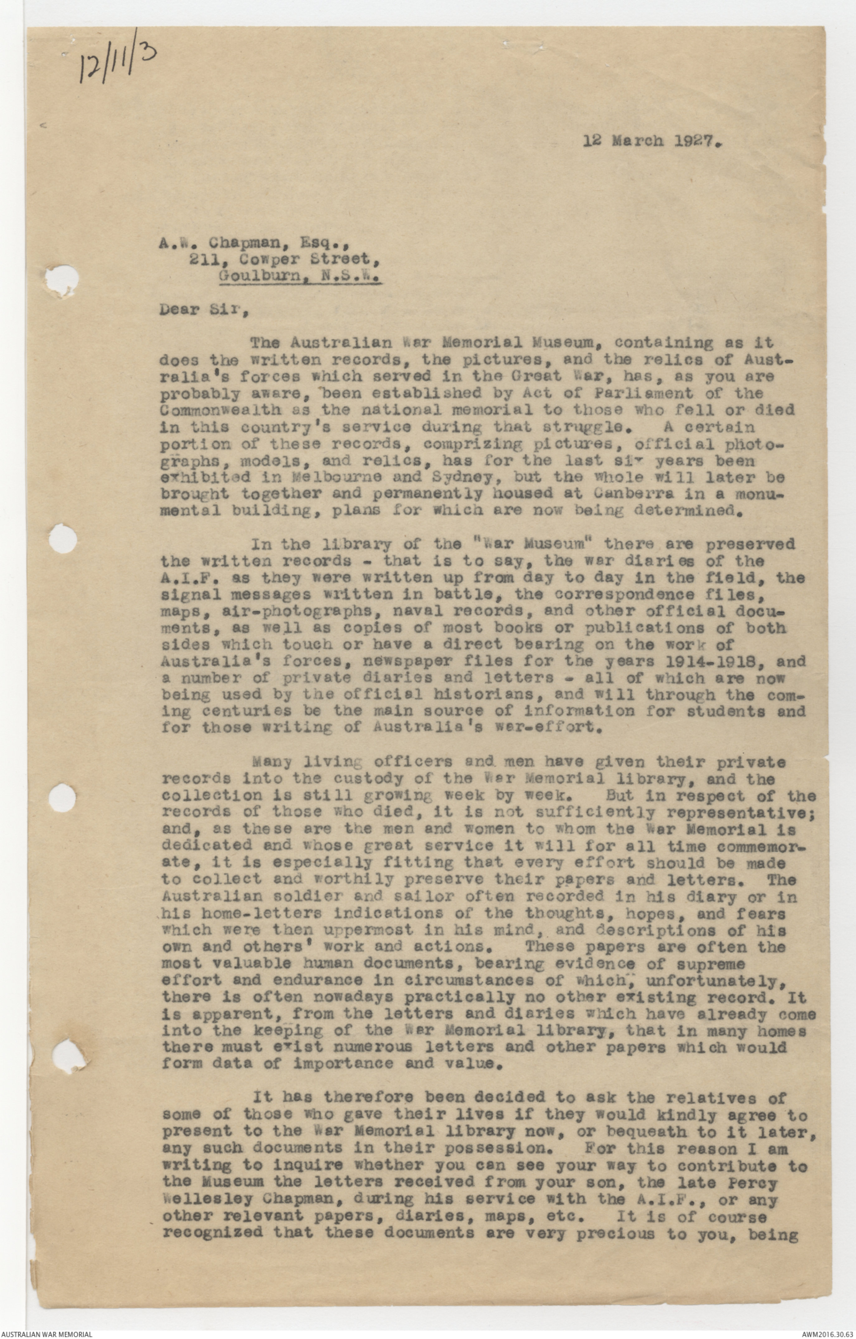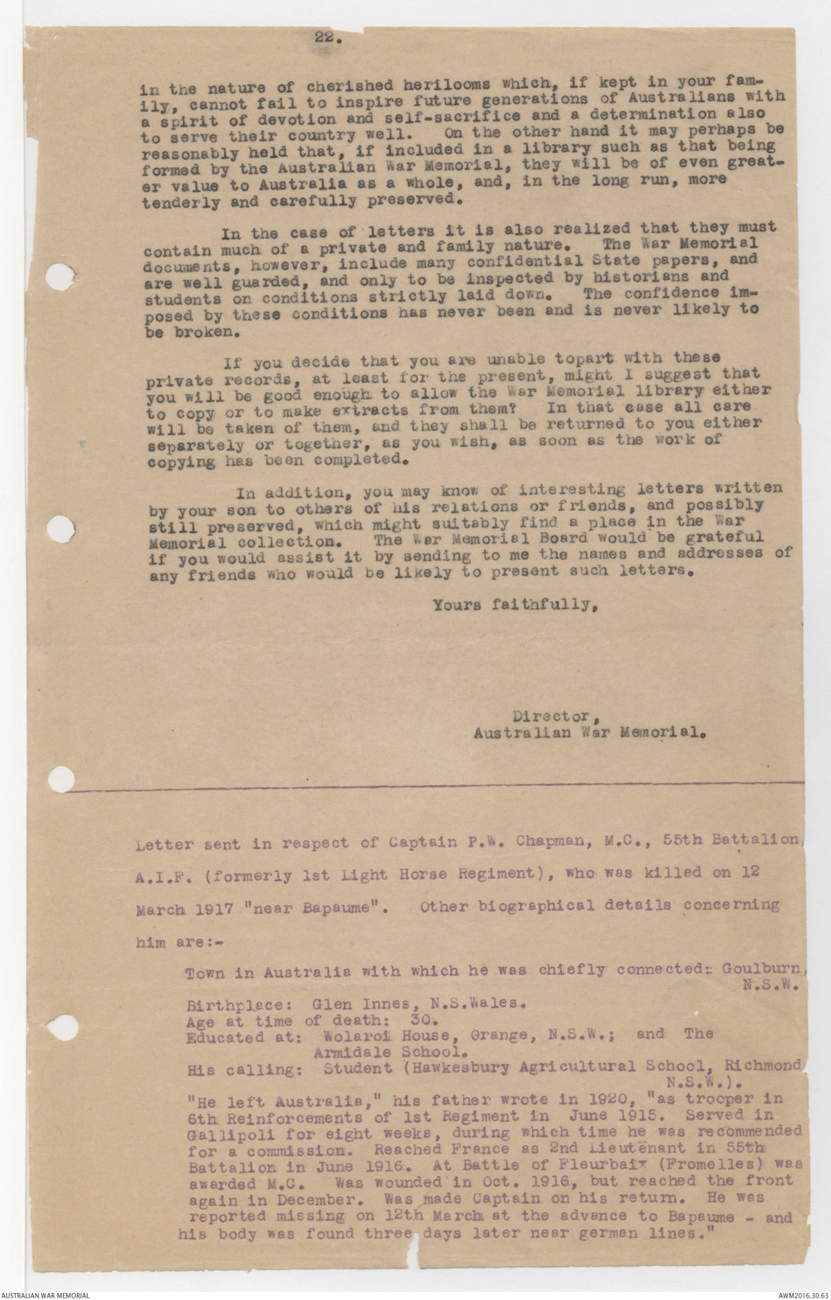 Letter sent in respect of Captain P.W. Chapman, M.C., 55th Battalion,