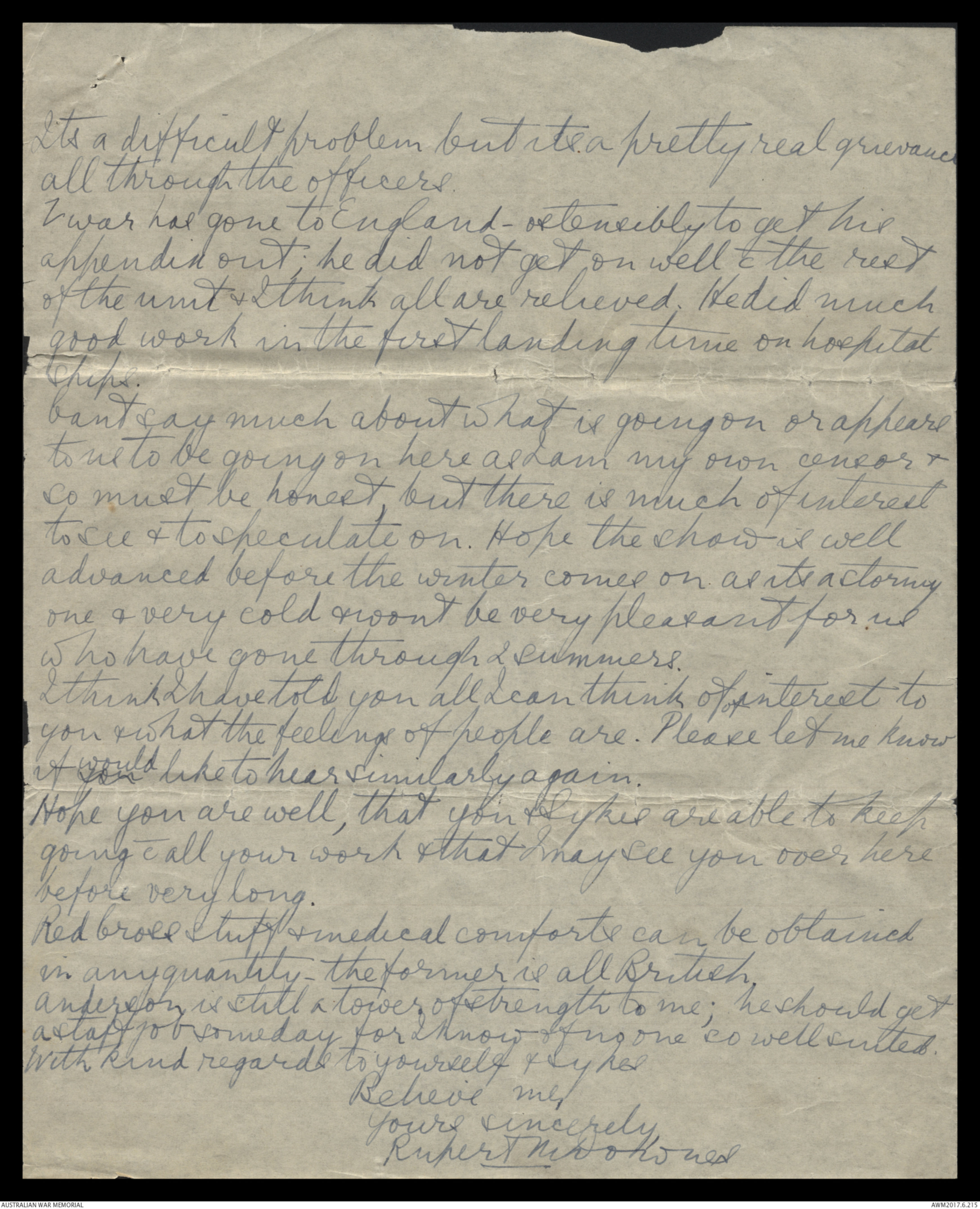 2nd L.H.F.A. left Egypt without Bean who was left behind by to run a convalescent home & was told by his Brigadier