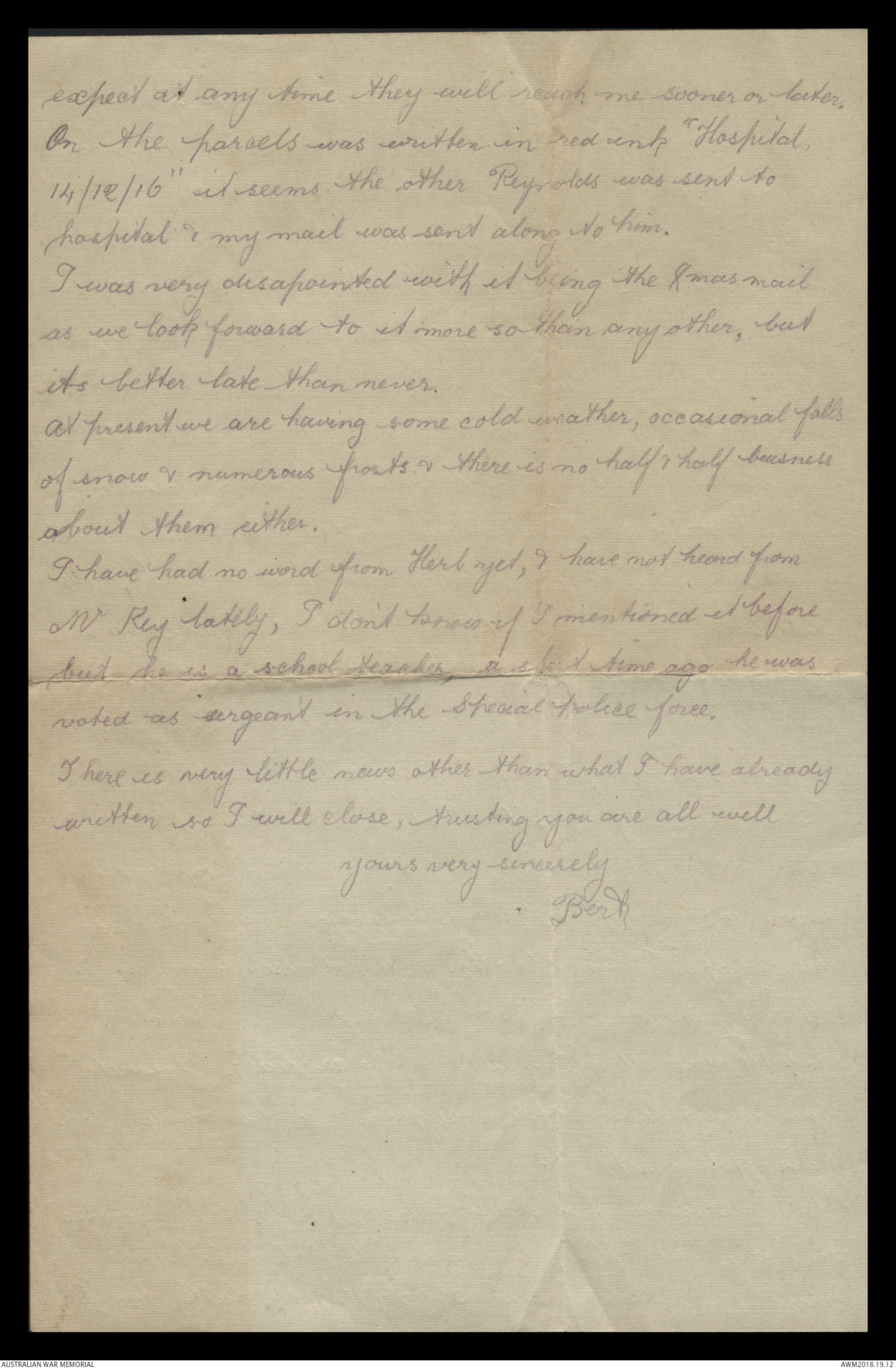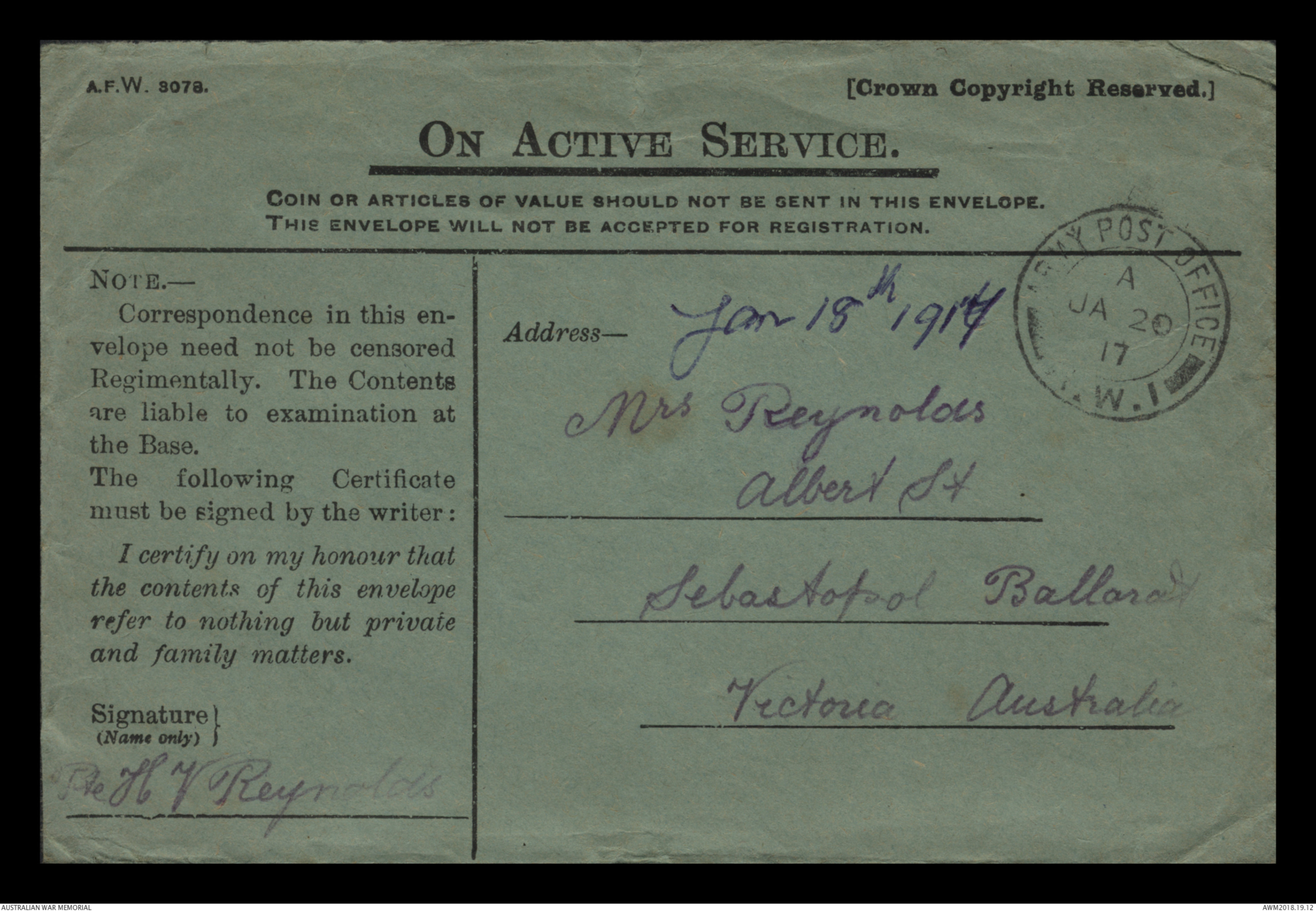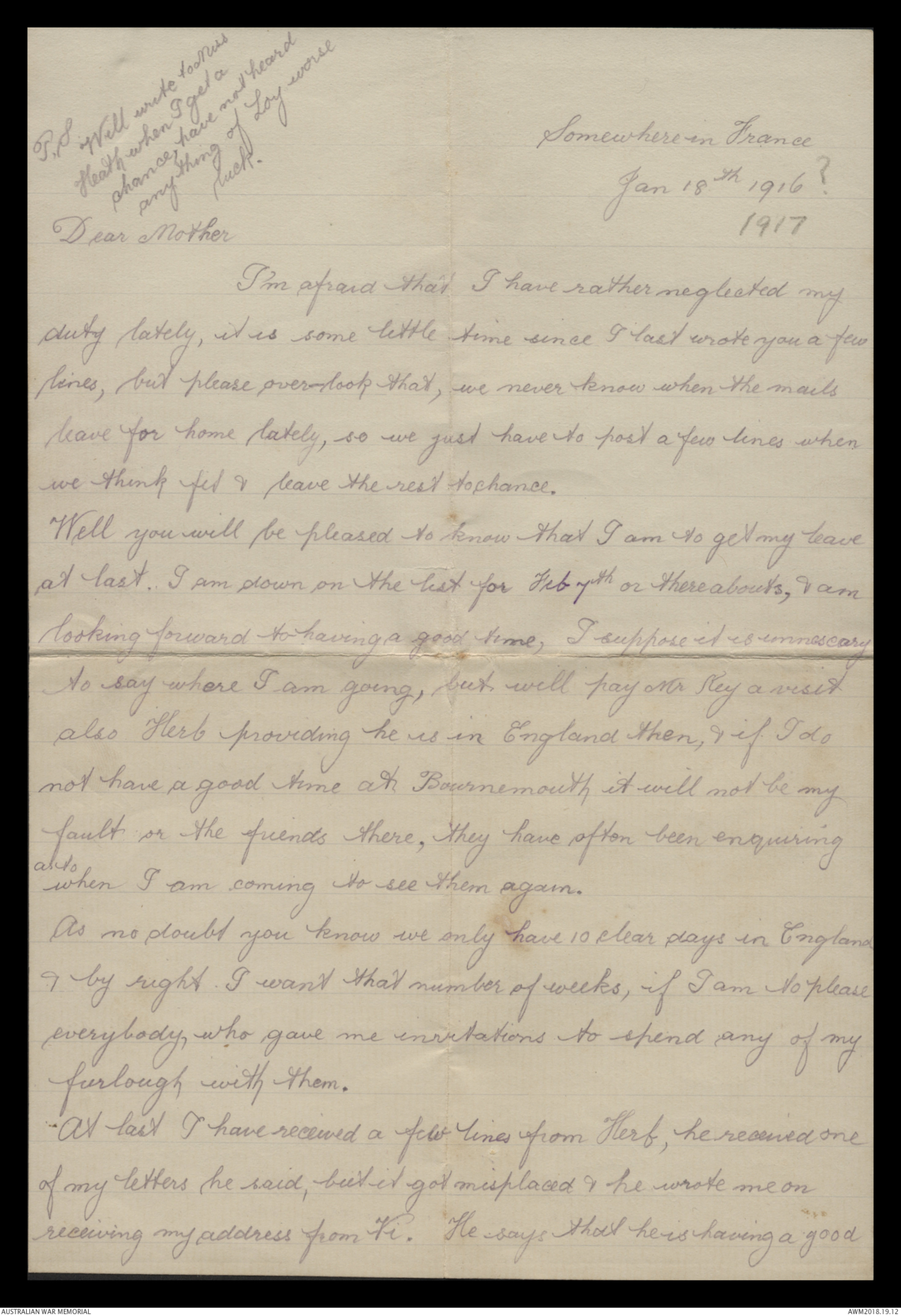 Correspondence between Herbert Vincent Reynolds and his family, 1917 - Part 1