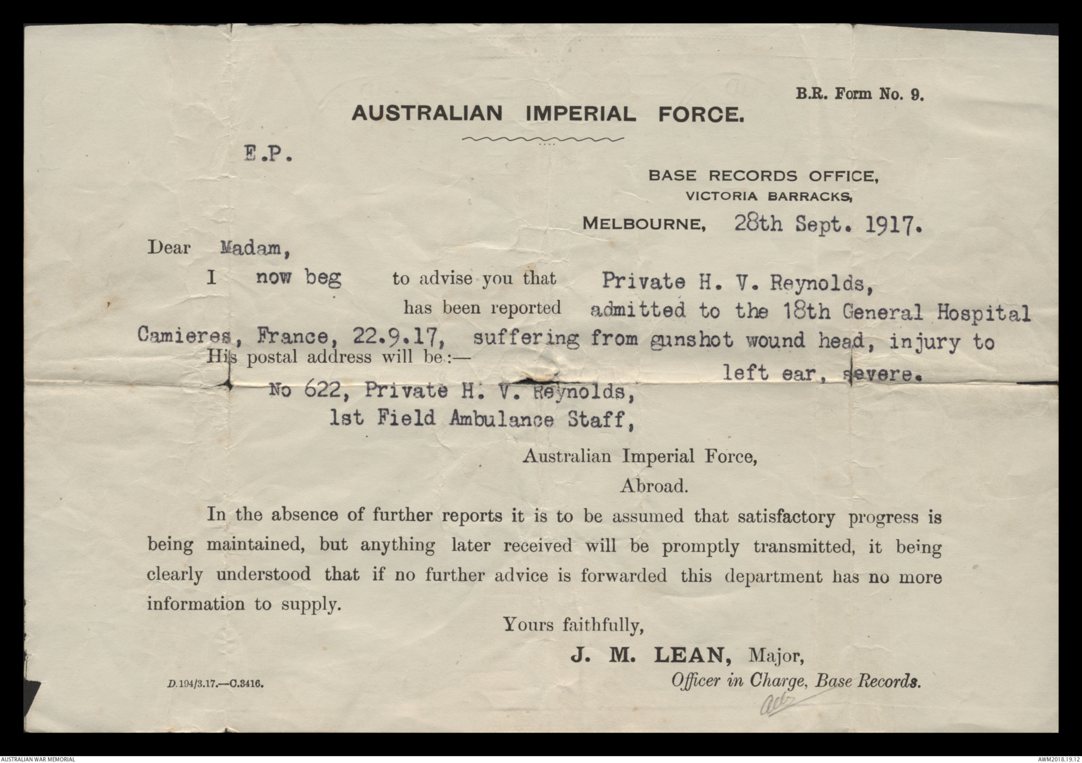 I now beg to advise you that Private H. V. Reynolds,