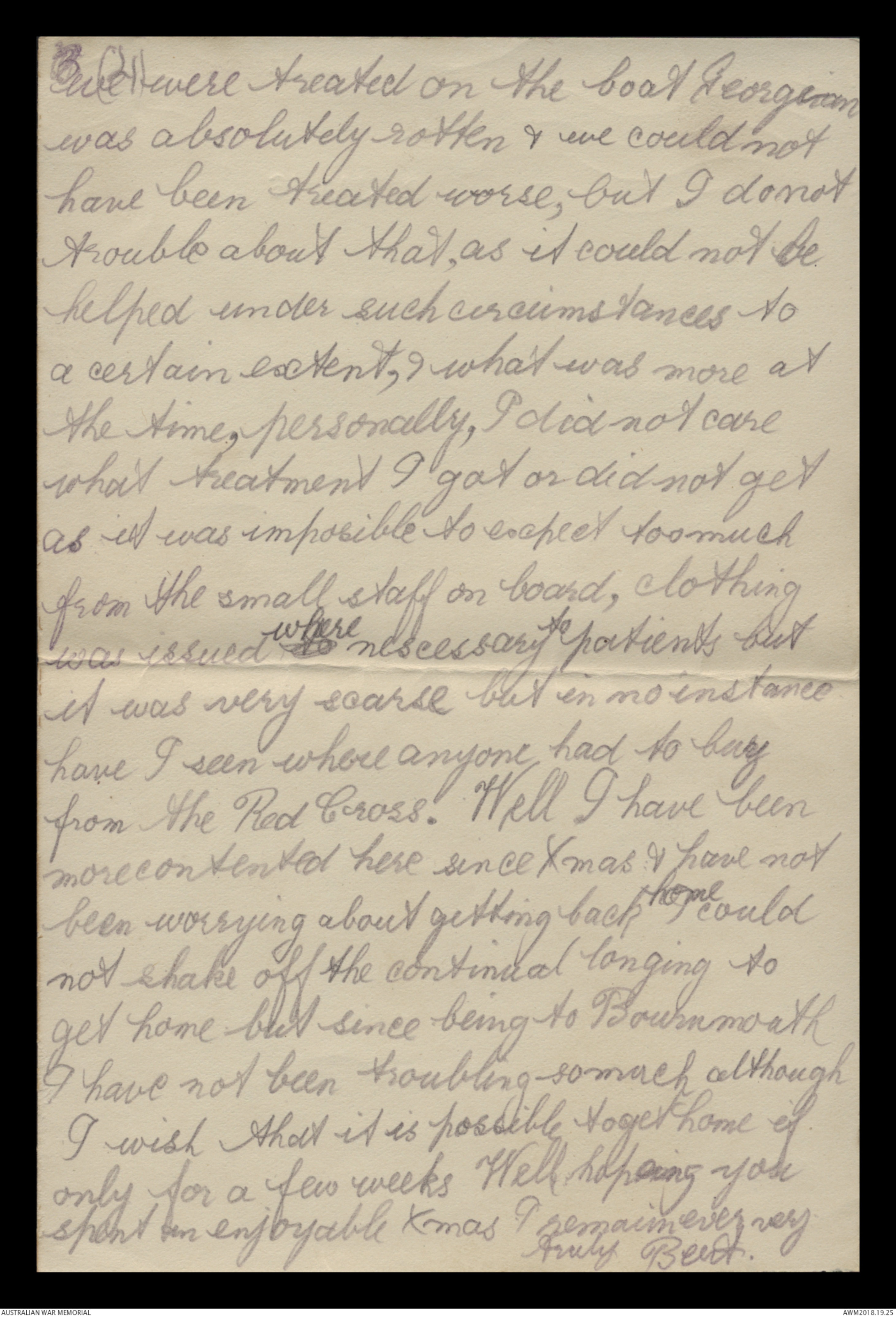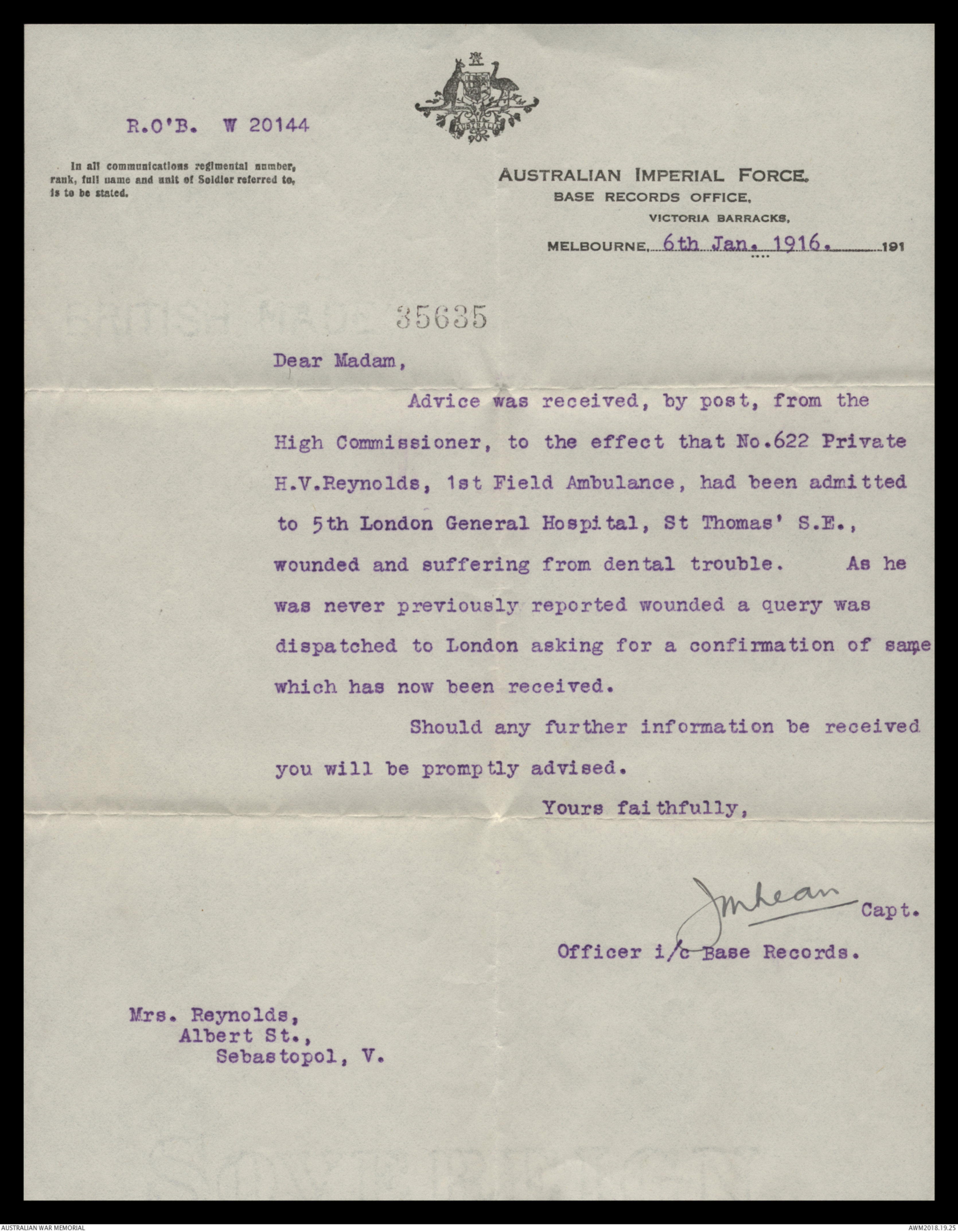 H.V. Reynolds, 1st Field Ambulance, had been admitted