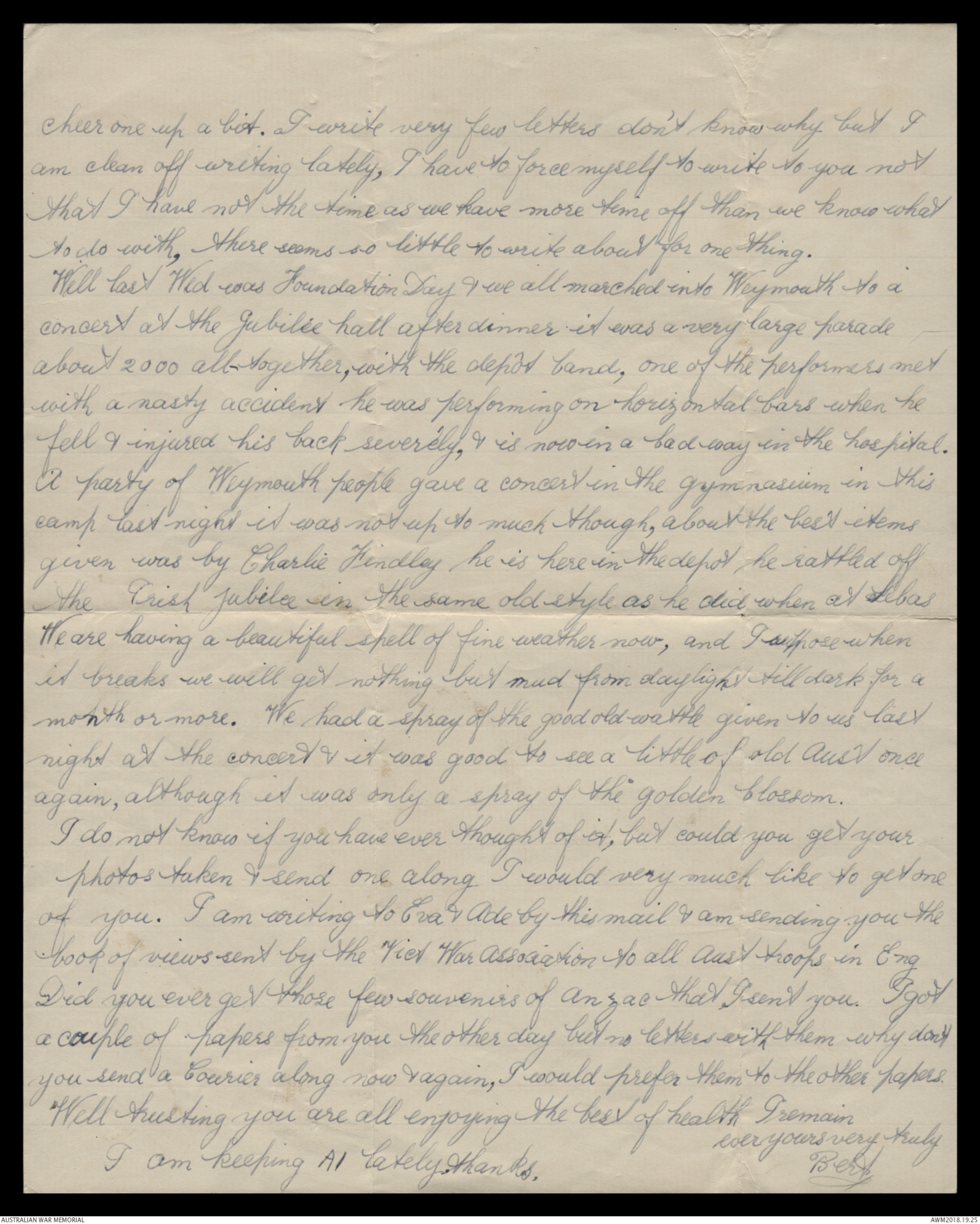 Did you ever get those few souvenirs of Anzac that I sent you. I got