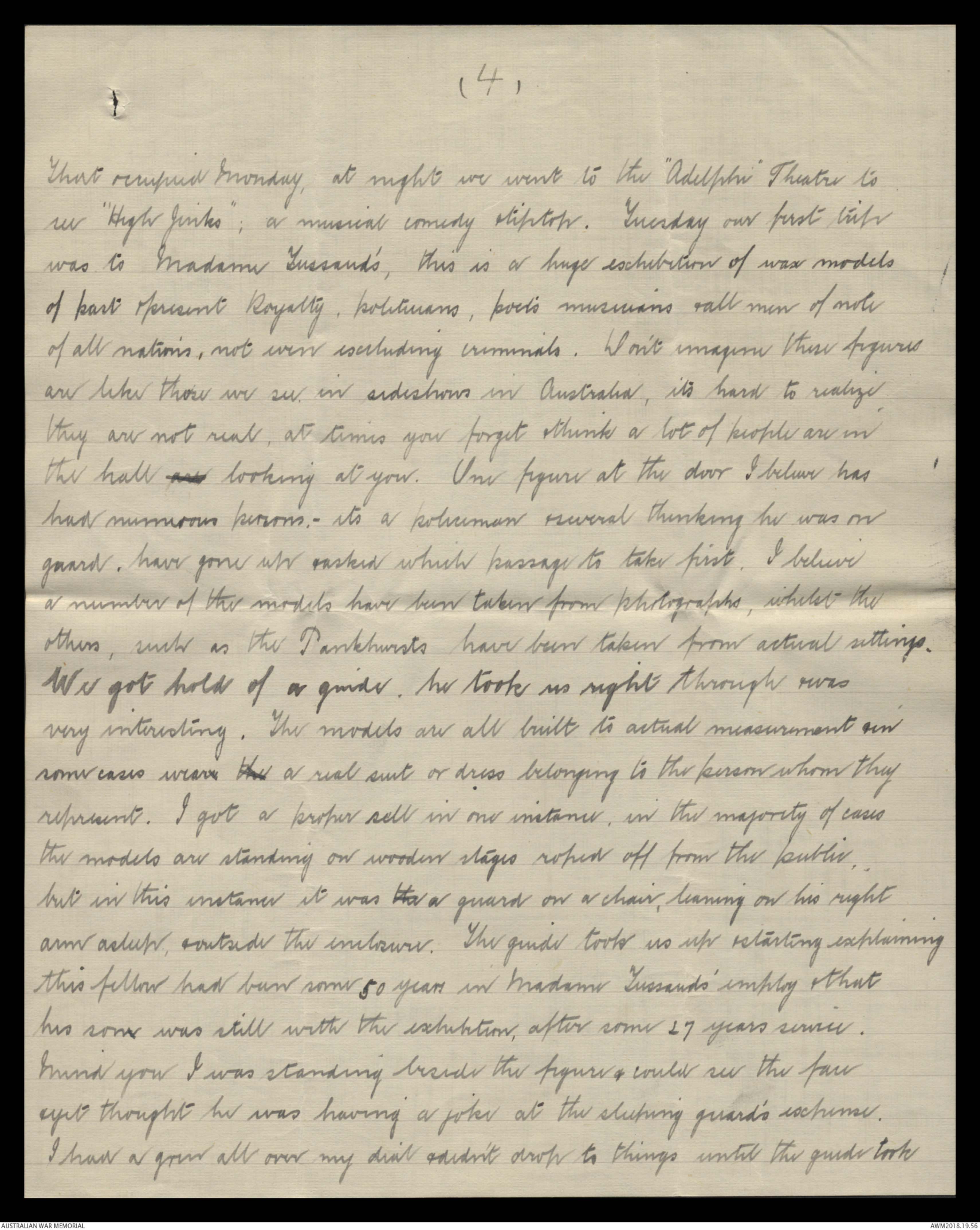 some cases wear the a real suit or dress belonging to the person whom they represent. I got a proper sell in one instance, in the majority of cases the models are standing on wooden stages roped off from the public. but in this instance it was th a guard on a chair, leaning on his right arm asleep, & outside the enclosure. The guide took us up & starting explaining this fellow had been some 50 years in Madame Tussauds' employ & that his son was still with the exhibition, after some 17 years service. Mind you I was standing beside the figure & could see the face & yet thought he was having a joke at the sleeping guard's expense. I had a grin all over my dial & didn't drop to things until the guide took