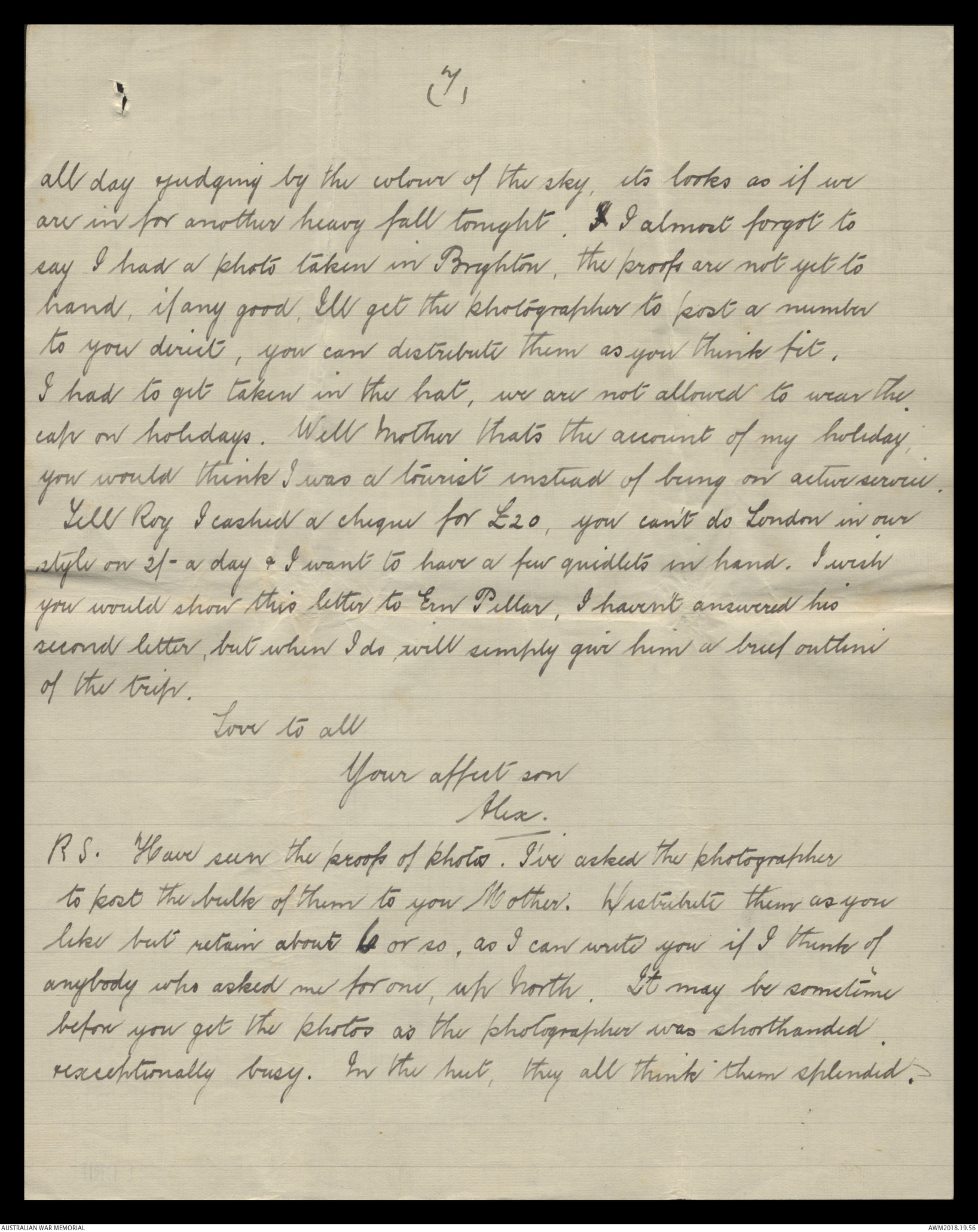 restarted school & is almost himself again. I also got copies of the photos I had taken at Brighton. The photographer evidently mixed up my order he originally sent proofs two of head & shoulders & our full figure. I asked for a dozen each of the former took on different style paper, one enlargement & a
