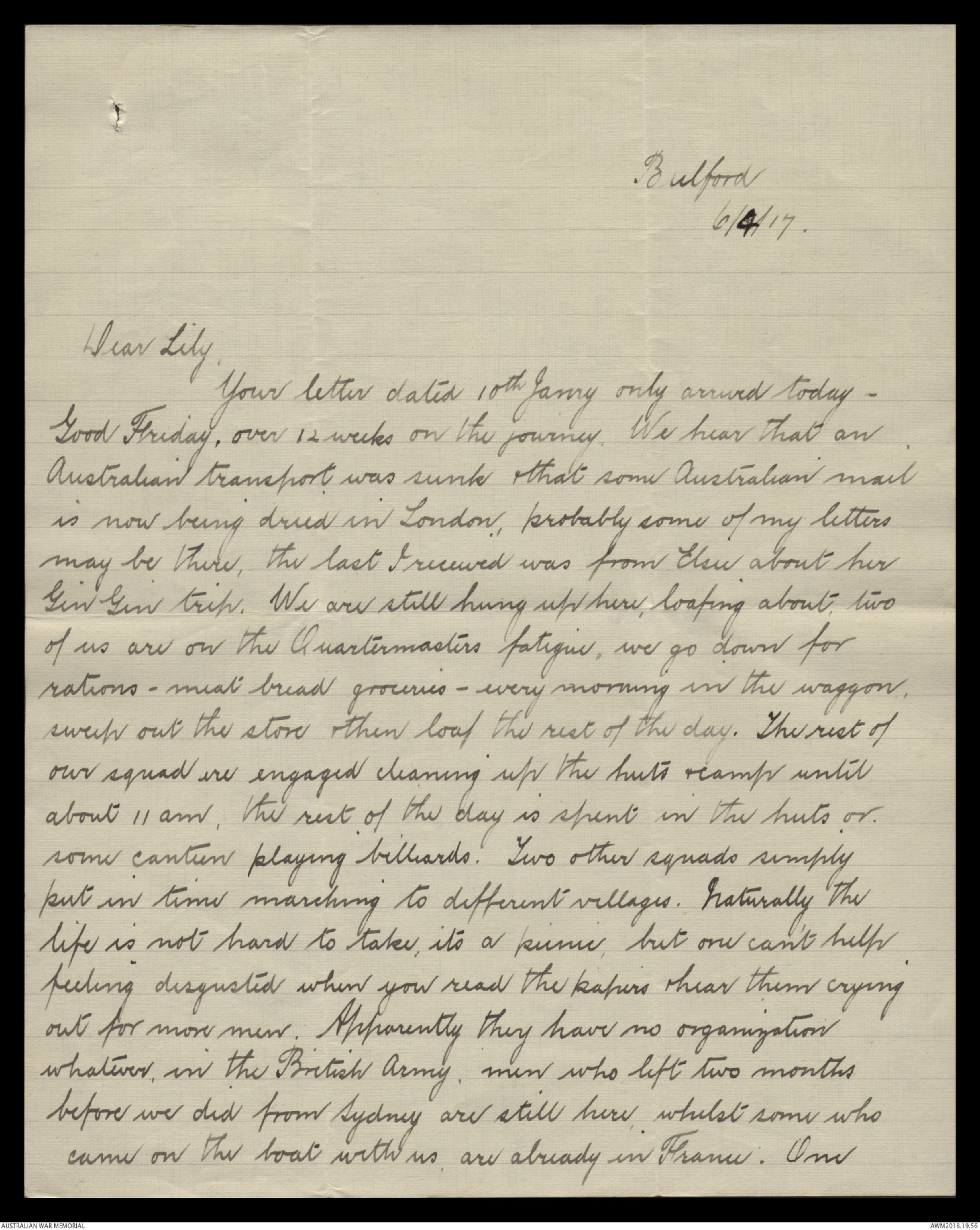 above the average. The American merchantmen will undoubtedly relieve the strain. Those photos may be ready this week. Davey, the fellow I went to Brighton with returns tonight from another leave & may bring them with him. I've no idea when the next Australian mail
