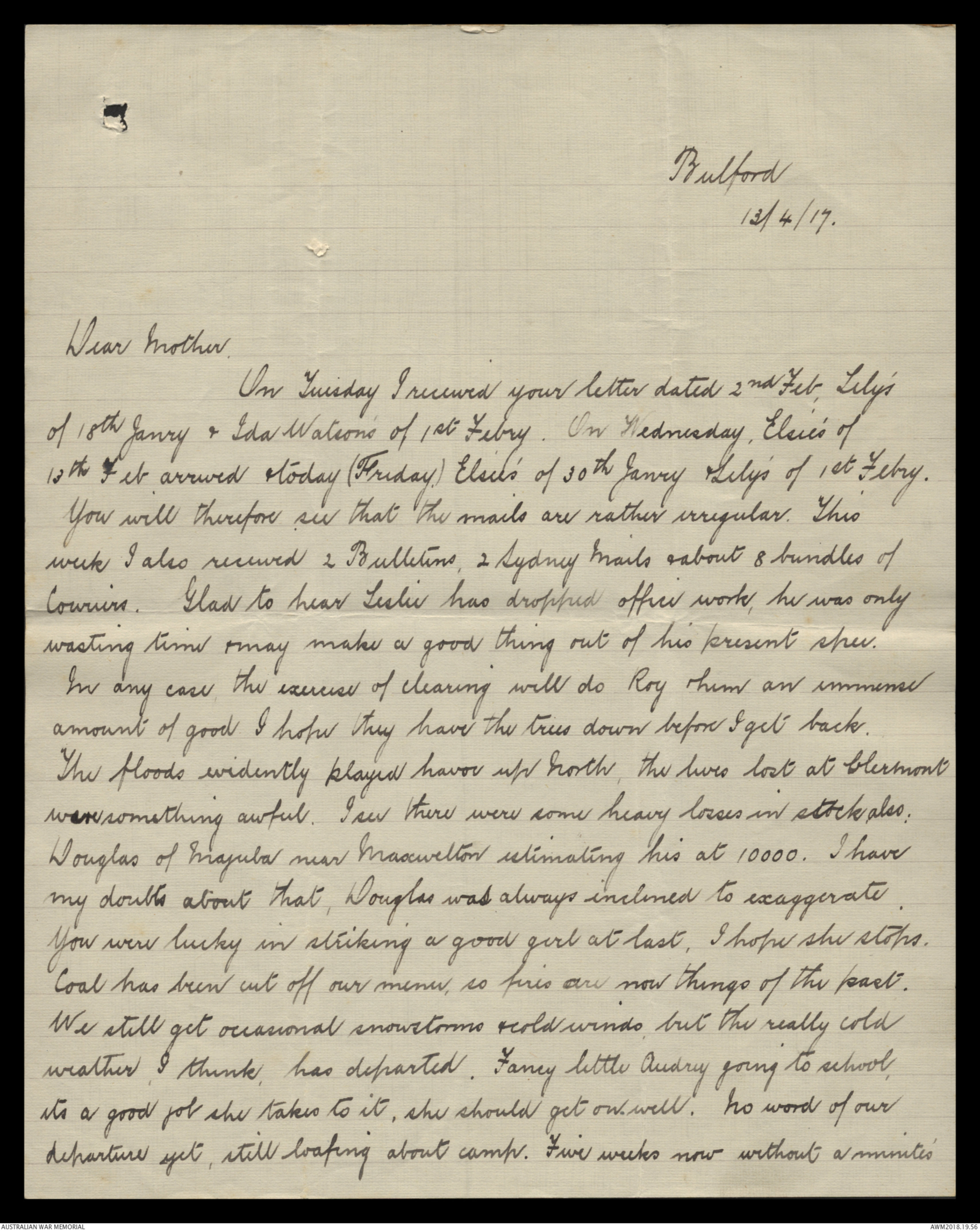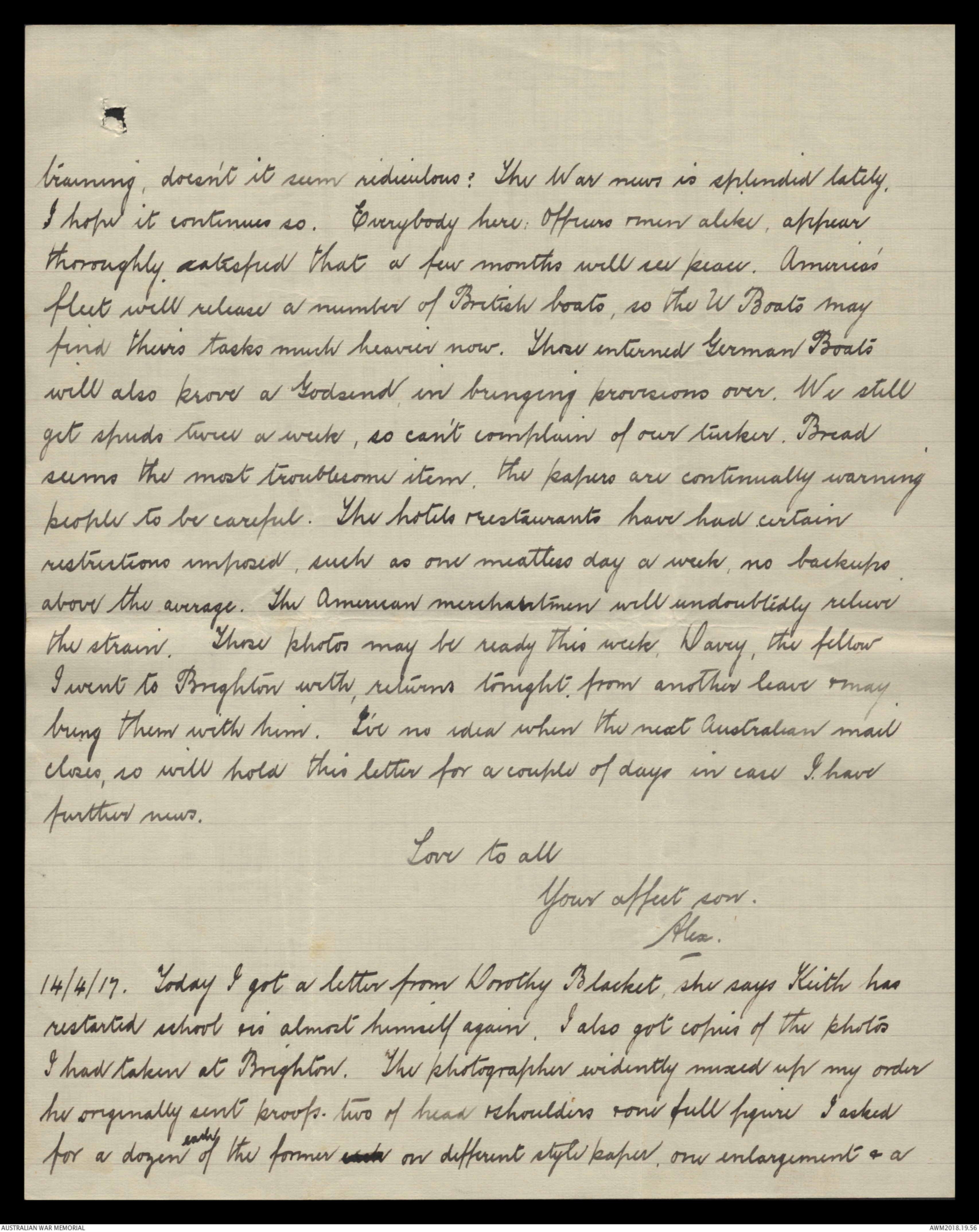 14/4/17. Today I got a letter from Dorothy Blacket, she says Keith has