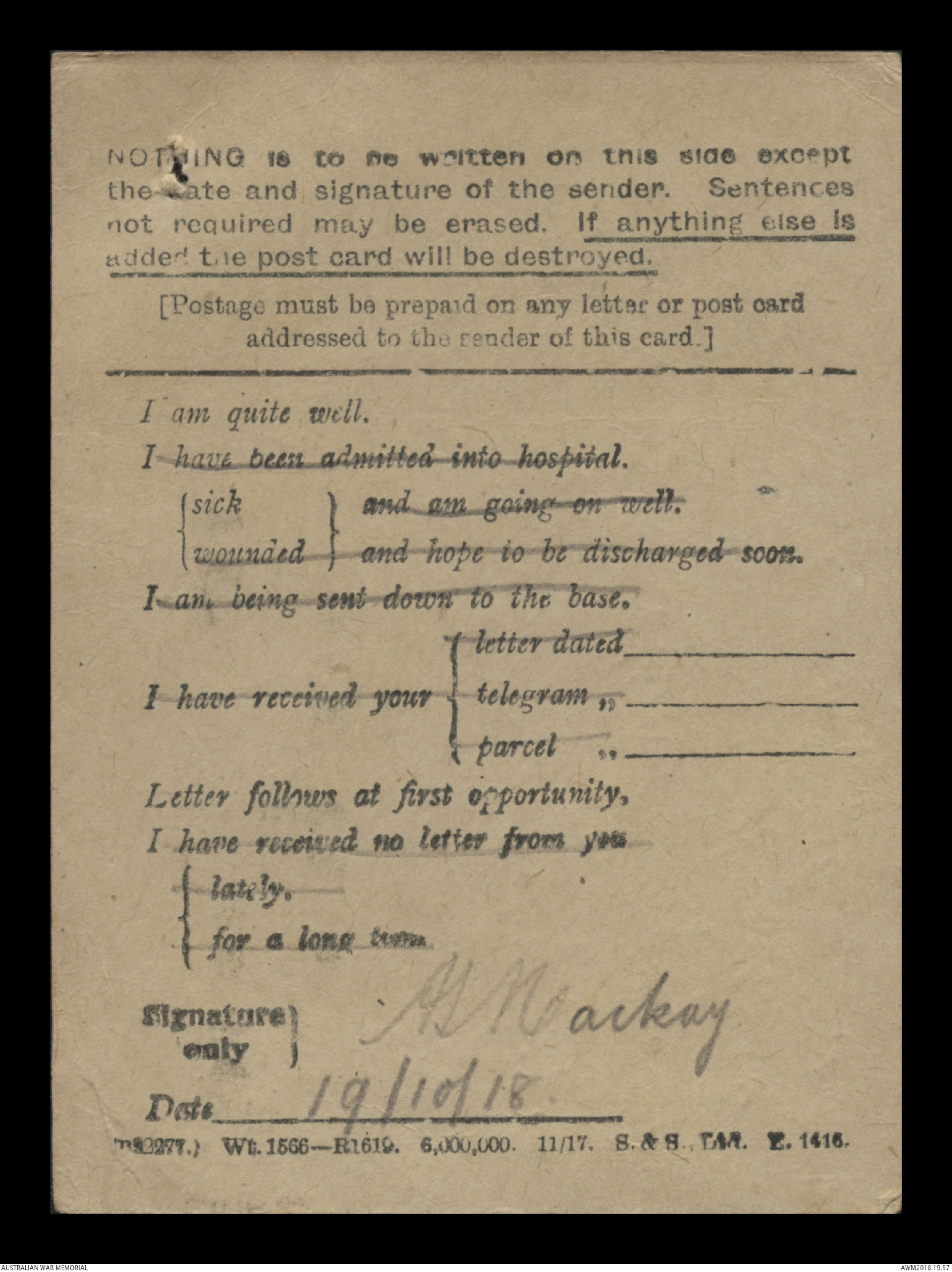 I am quite well.I have been admitted into hospitalsick } and am goin on wellwounded } and hope to be discharged soon.I am being sent down to the base.I have received your {letter dated {telegram {parcel
