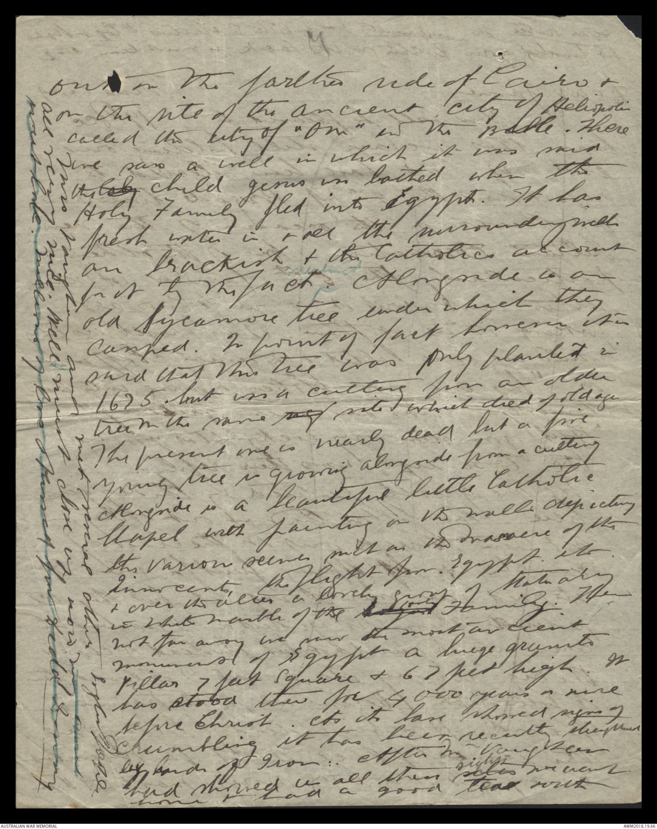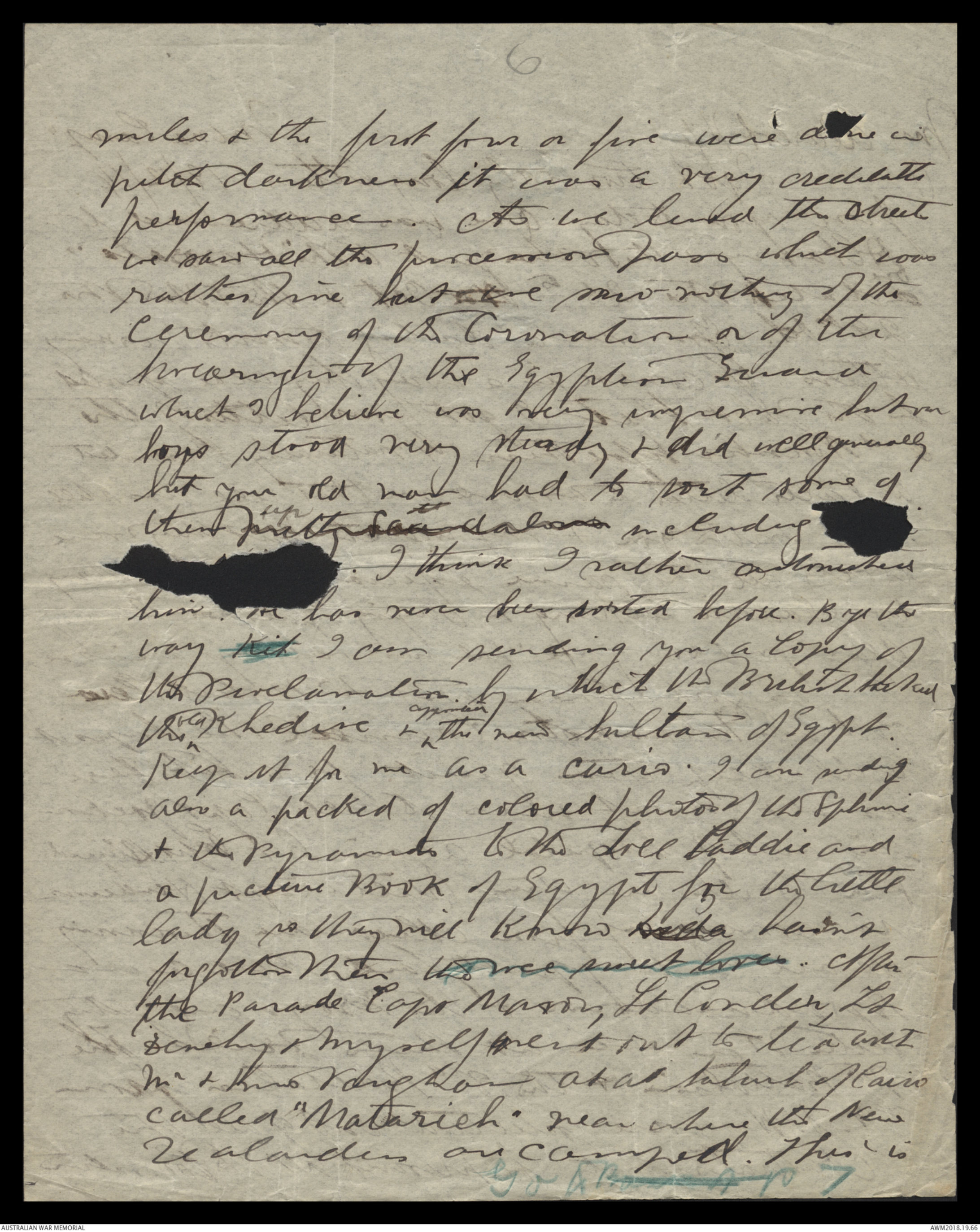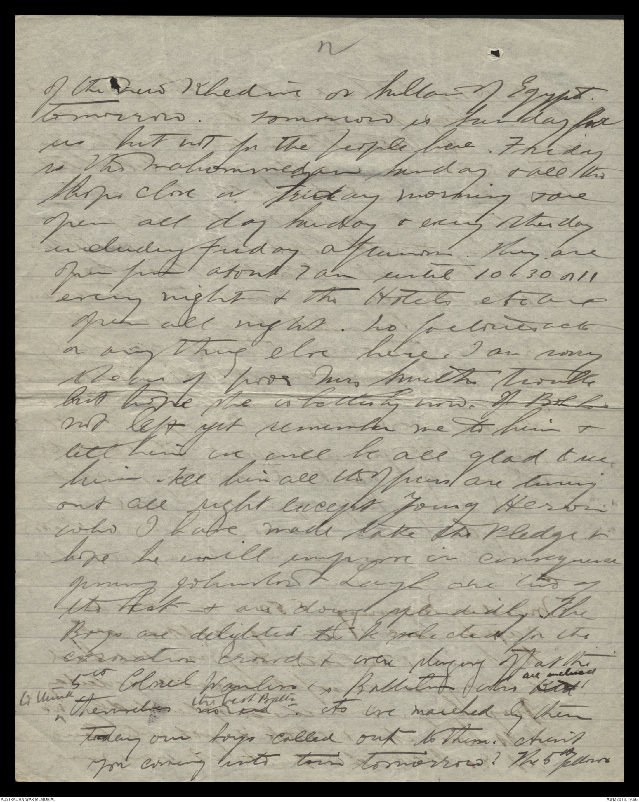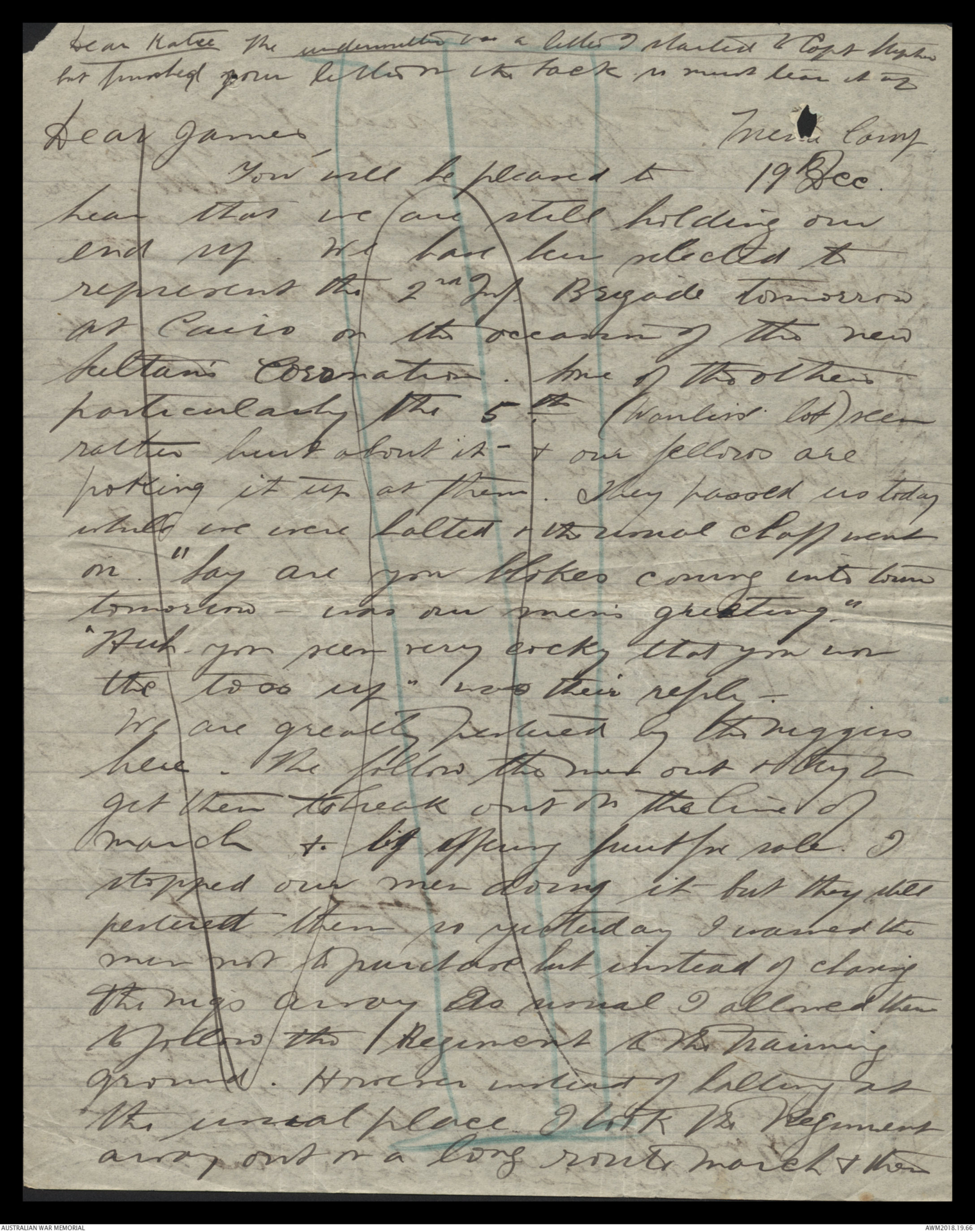 Dear Katie The underwritten was a letter I started to Capt Kylebut finished your letter on the back so must tear it upMena Cairy19 Dec.Dear JamesYou will be pleased tohear that we are still holding ourend up We had been selected torepresent the 2nd Inf. Brigade tomorrowat Cairo on the occasion of the newSultan's Coronation. Some of the othersparticularly the 5th (Wanliss lot) seemrather bent about it - & our fellows arepoking it up at them. They passed us todaywhile we were halted & the usual chaff wenton. "Say are you blokes coming into towntomorrow - was our men's greeting.""Huh - you seem very cocky that you wonthe toss up" was their reply -We are greatly pestered by the niggershere. The follow the men out & theyget them to check out on the line ofmarch & by offering fruit for sale. Istopped our men doing it but they stillpestered them so yesterday I warned themen not to purchase but instead of chasingthe nigs away as usual I allowed themto follow the Regiment to the trainingground. However instead of halting atthe usual place I took the Regimentaway out in a long route march & then