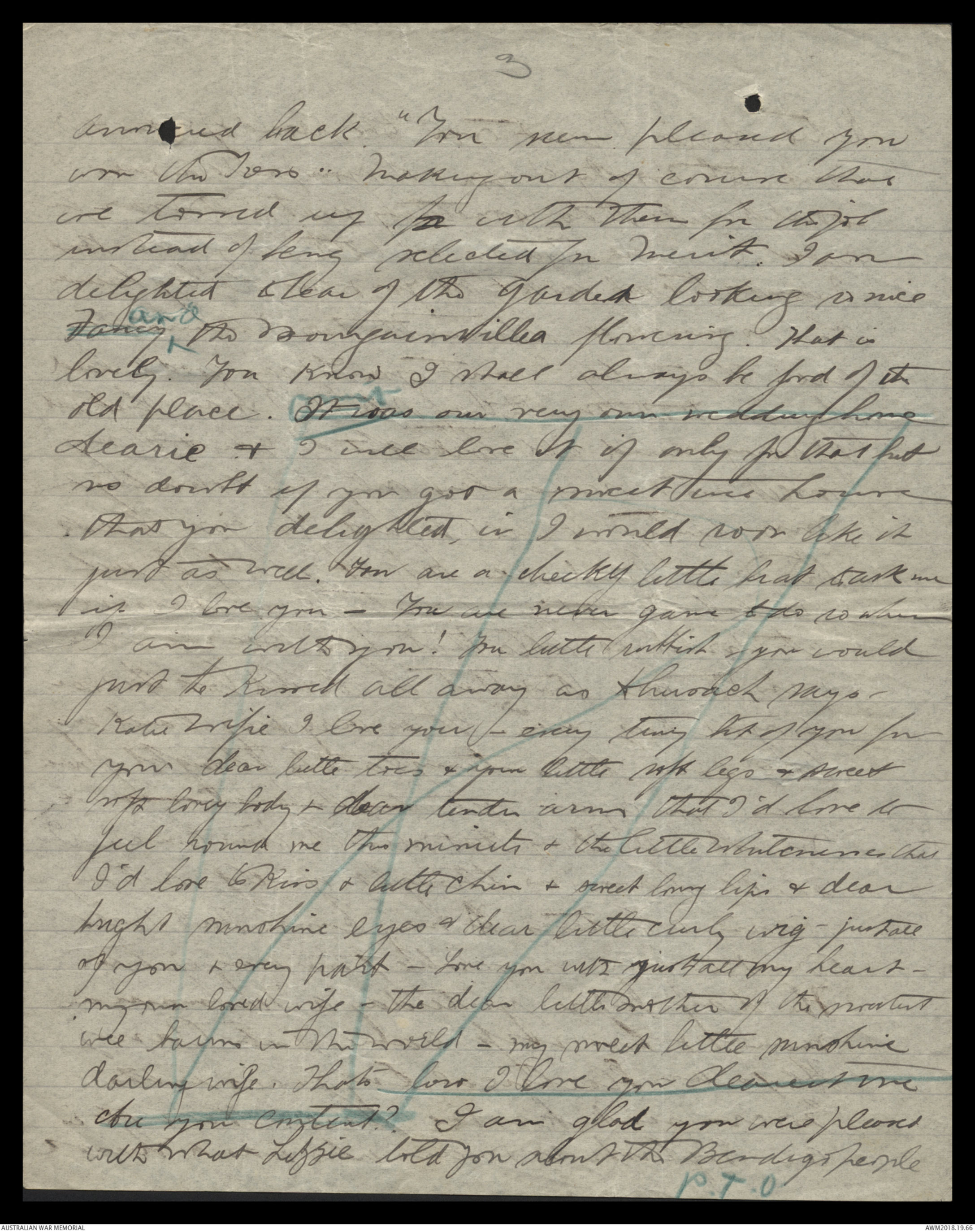 old place. It was our very own wedding homedearie & I will love it if only for that butno doubt if you got a sweet time housethat you delighted in I would soon like itjust as well. You are a cheeky little brat to ask meif I love you - You are never game to do so whenI am with you! You l[[talk]] rubbish & you wouldjust be Kissed all away as [[?]] says -Katie Wife I love you - every tiny bit of you foryour dear little toes & your little soft legs & sweetsoft lovely body & dear tender arms that I'd love tofeel round me this minute & the little [[whitenesses?]] thatI'd love to kiss & little chin & sweet loving lips & dearbright sunshine eyes & dear little curly wig - just all of you & every part - Love you with just all my heart -my own loved wife - the dear little mother of the sweetestwee bairns in The World - my sweet little sunshinedarling wife. Thats love I love you dearest oneAre you content? I am glad you were pleased