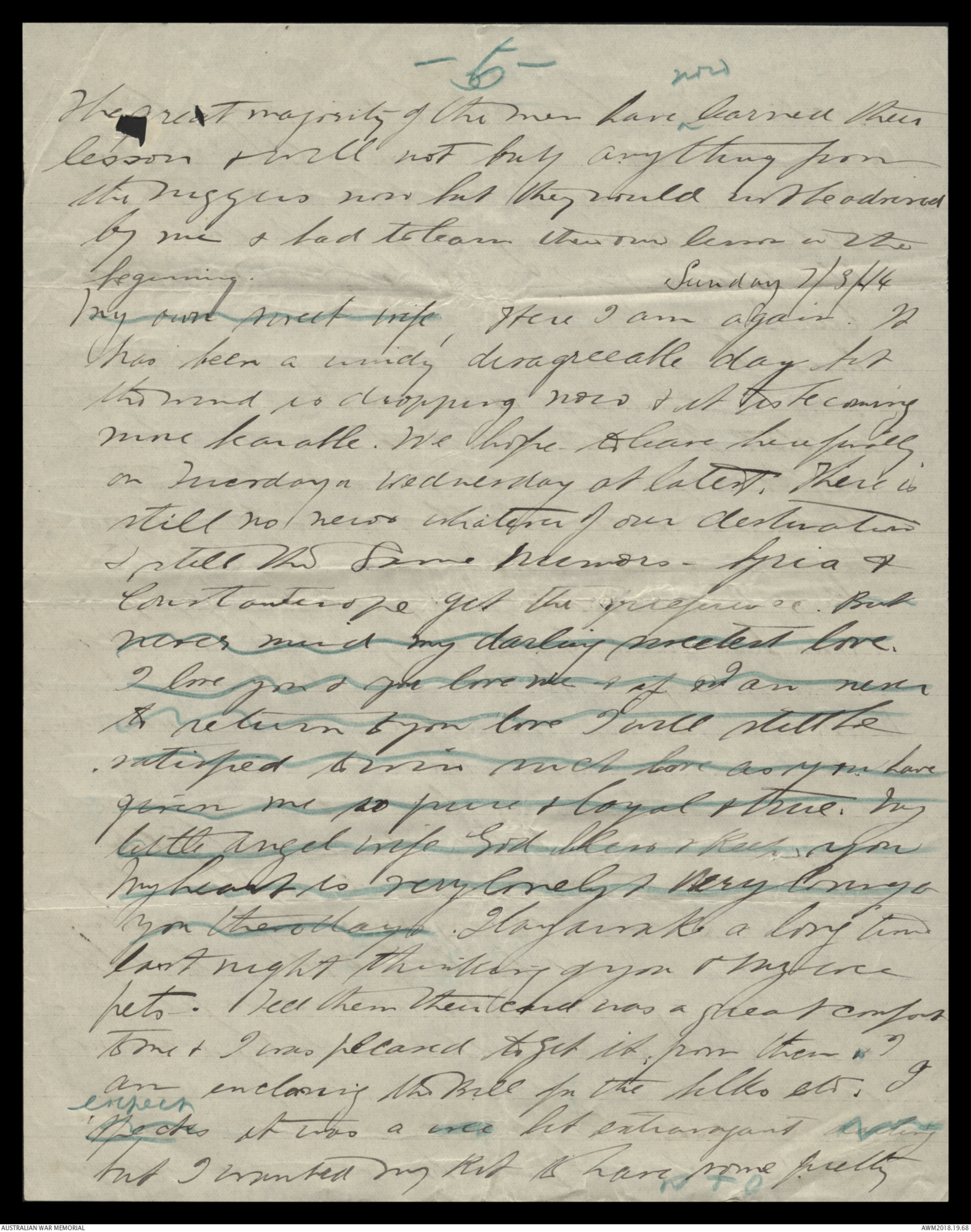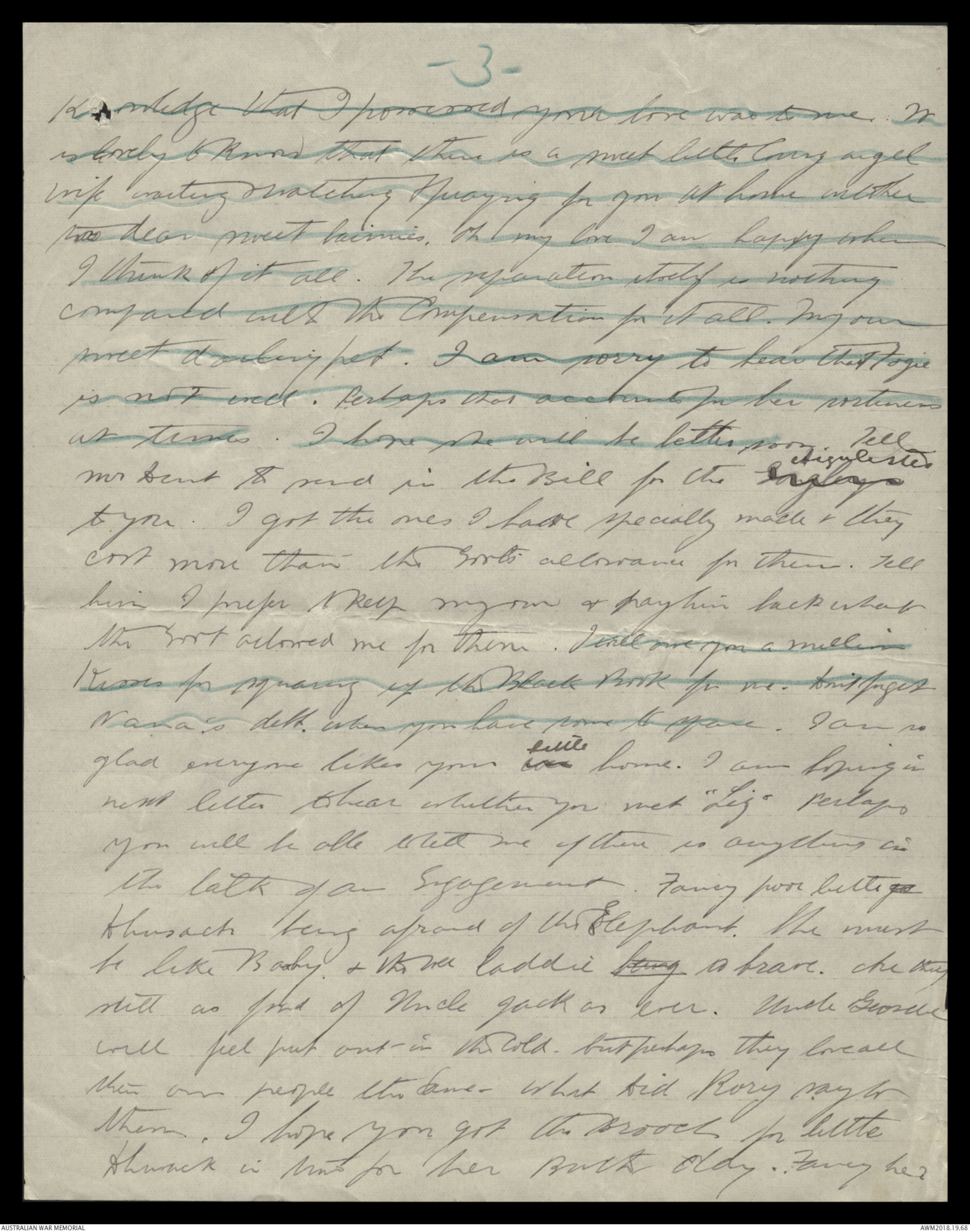 -3-knowledge that I possessed your love was to me. Itis lovely know that there is a sweet little loving angelwife waiting & watching & praying for you at home with hertwo dear sweet bairnies. Oh my love I am happy whenI think of it all. The separation itself is nothingcompared with the Compensation for it all. My ownsweet darling pet. I am sorry to hear that Fogieis not well. Perhaps that accounts for her rustinessat times. I hope she will be better soon. Tell
