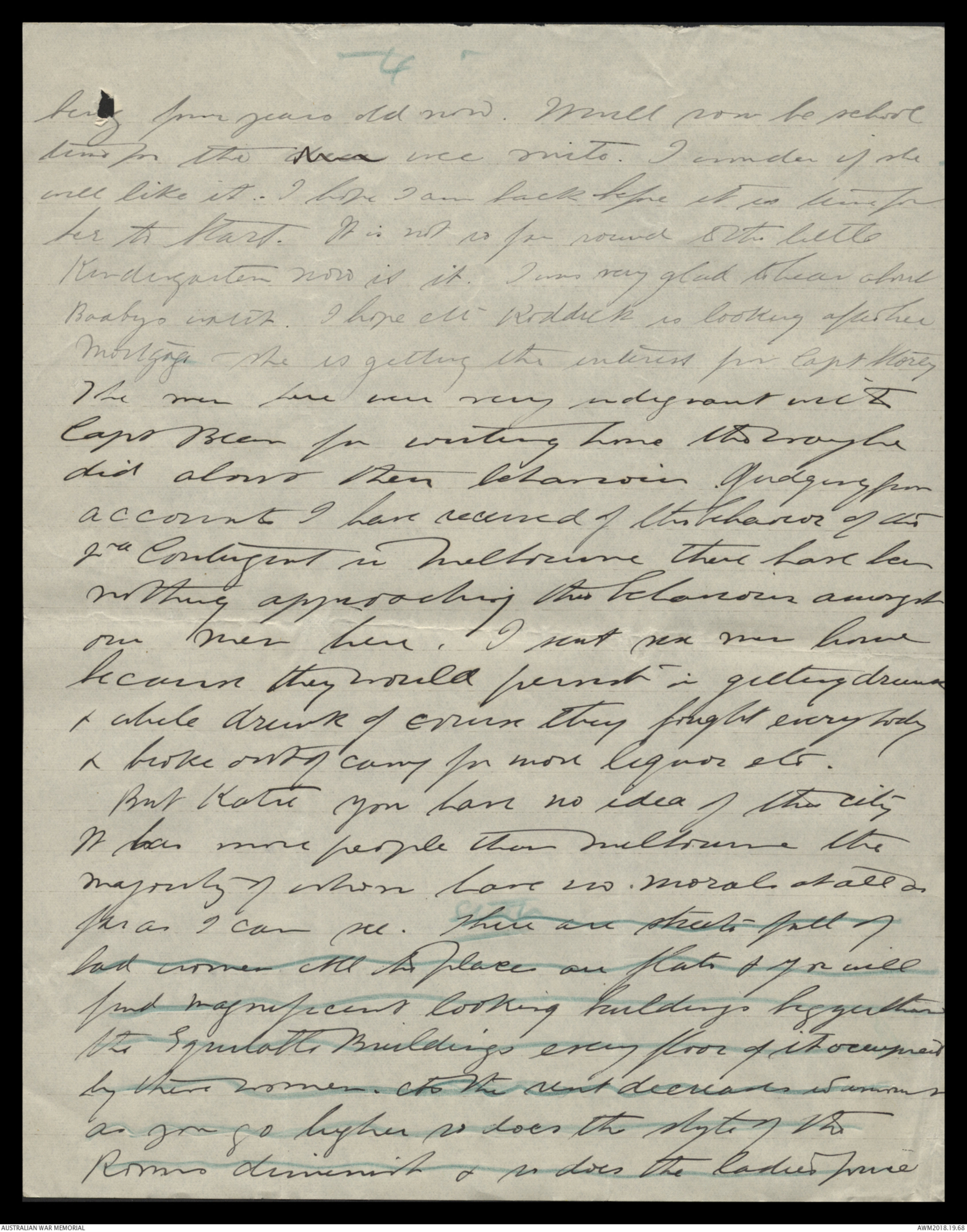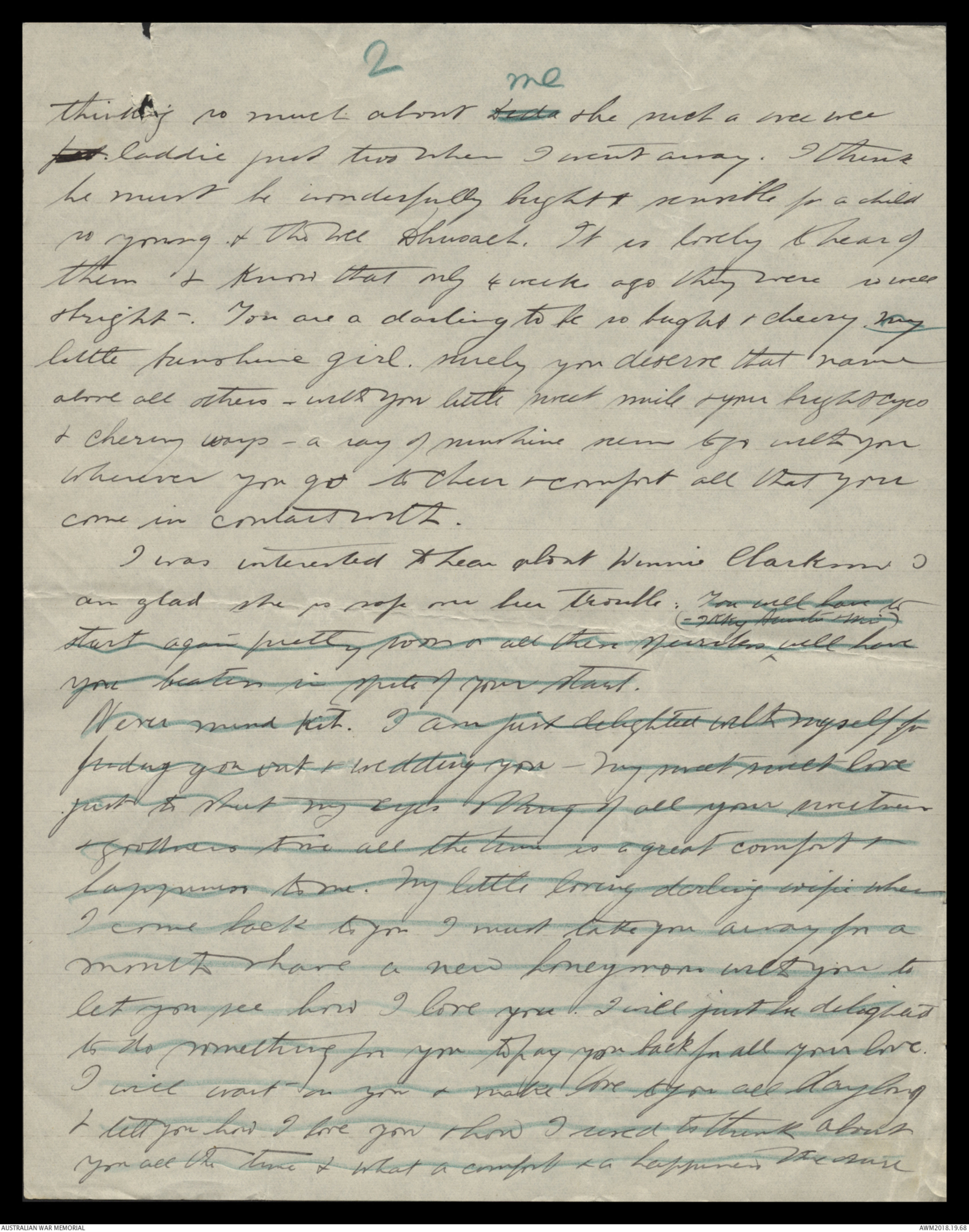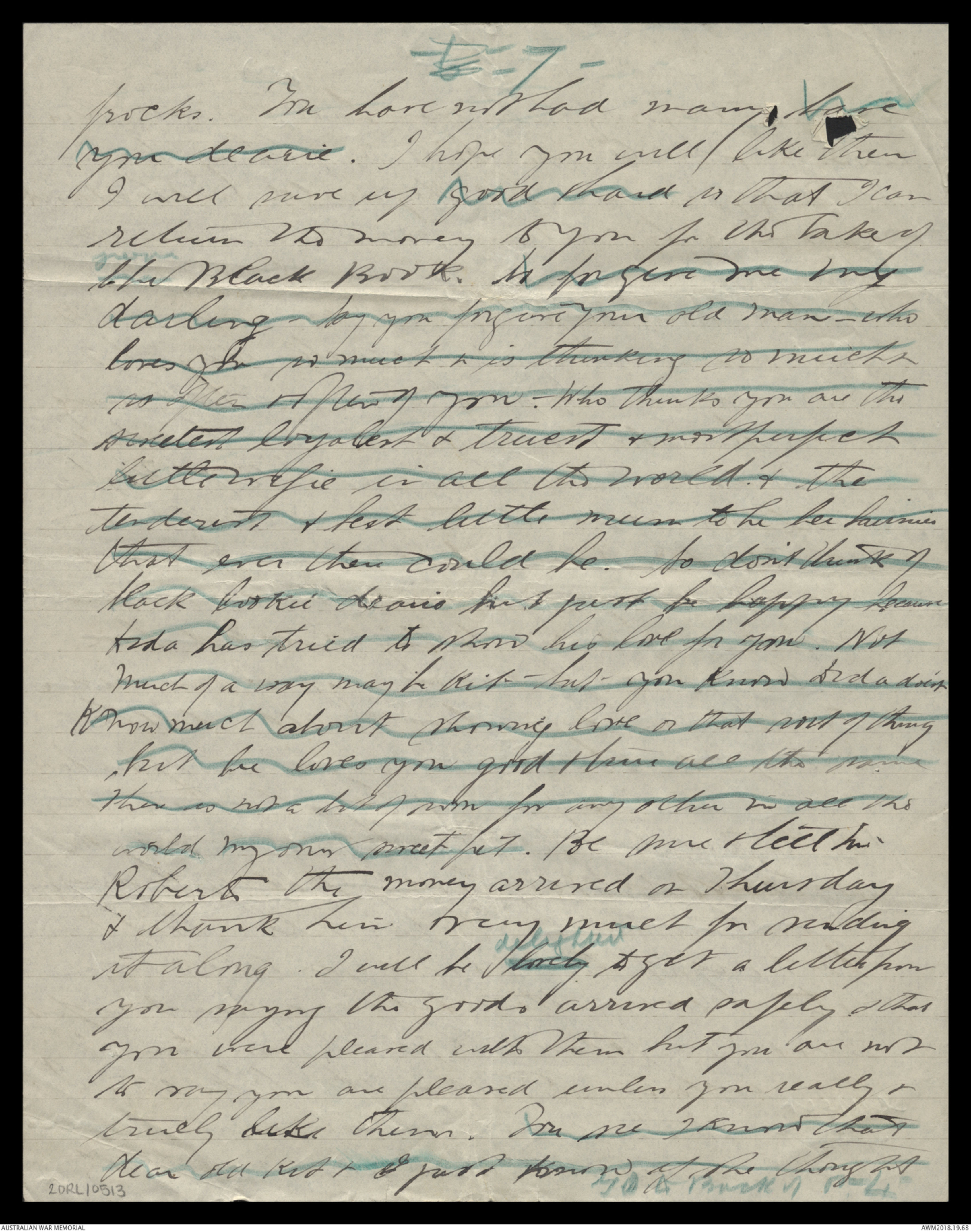 return the money to you for the sake ofthe your Black Book. So forgive me mydarling - Say you forgive your old man - wholoves you so much & is thinking so much &so often & often of you. Who thinks you are thesweetest loyalist & truest & most perfectlittle wife in all the world & thetenderest & best little mum to he her bairniesthat ever there could be. So don't think ofblack bookie dearie but just be happy becauseDida has tried to show his love for you Notmuch of a way maybe Kit - but you know Dida doesn'tknow much about showing love or that sort of thingbut he loves you good & true all the sameThere is not a lot of room for any other in all theworld my own sweet pet. Be sure & tell Mr