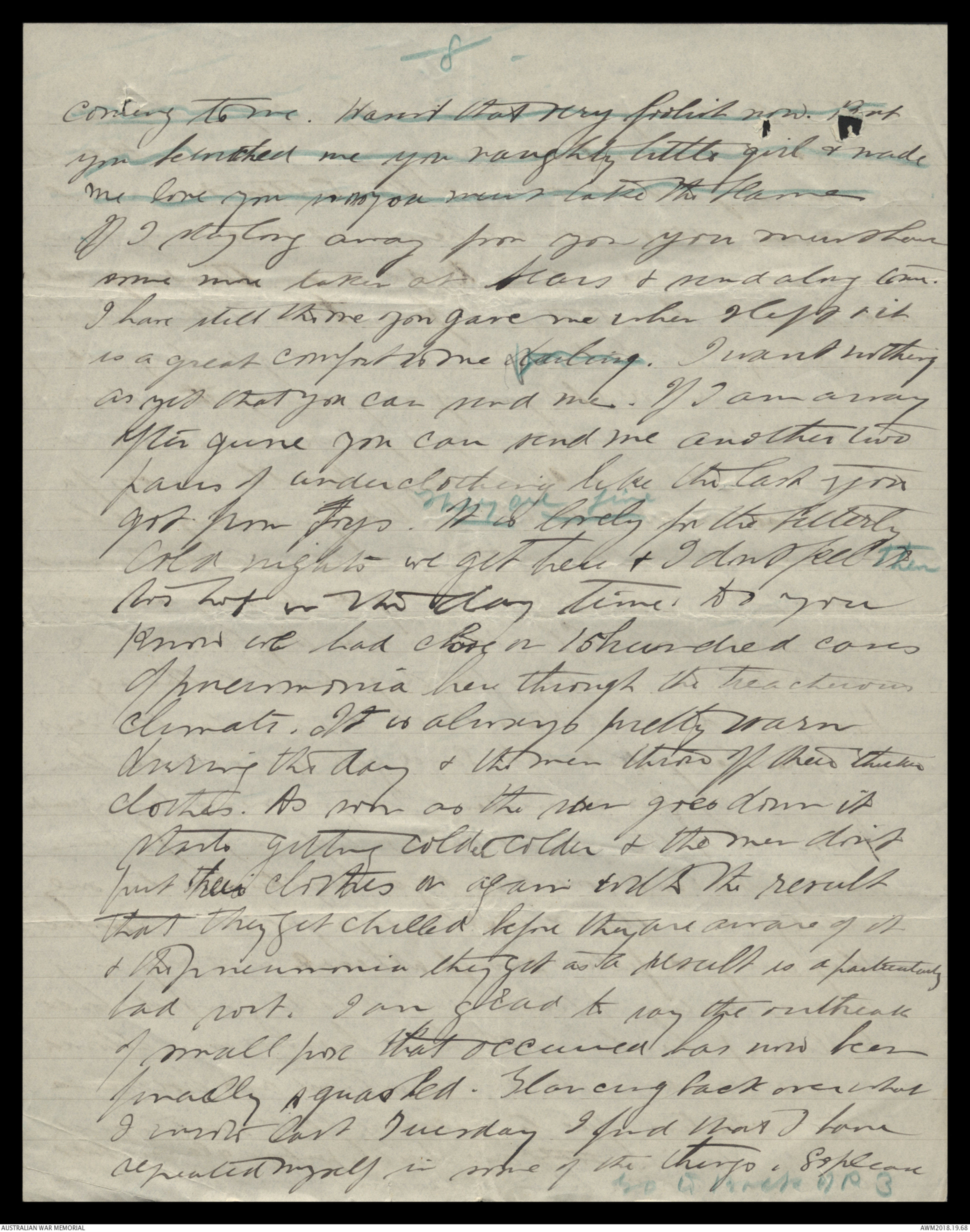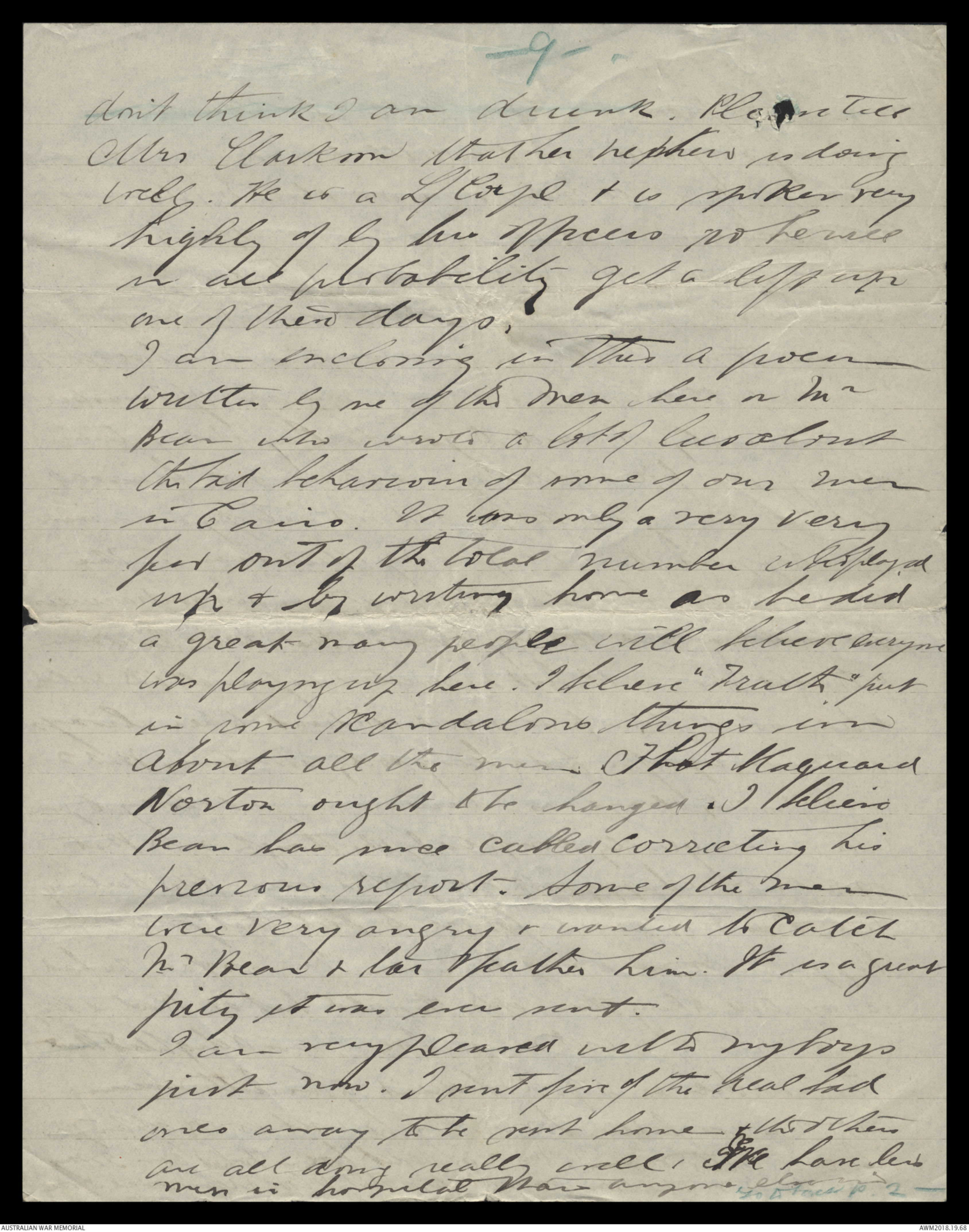 on the 9th Feb. So you wonder what I would do if youwalked in to my tent & s'prised me. Well let me tellyou you'd be so squashed up & kissed that you'd bejust smotherated—thats what would happen to youthe first thing — afterwards I dont know. I expect you'dbe getting your old man into dreadful trouble fornot attending to his work. Aren't you a darlingto have saved enough to stratght straighten sortup the old black book. I think the essence of all