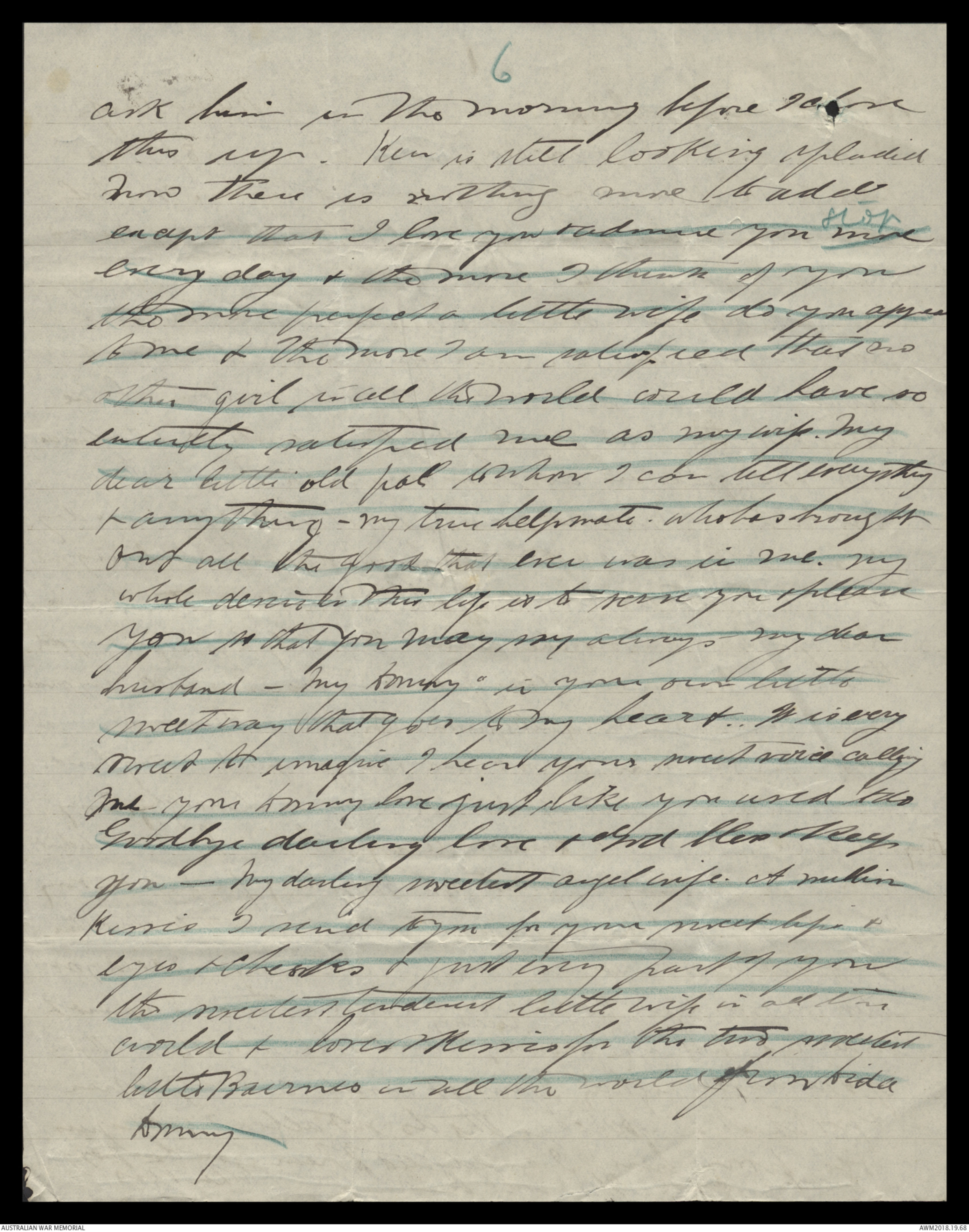 Now there is nothing more to addexcept that I love you & admire you more stopevery day & the more I think of youthe more perfect a little wife do you appearto me & The more I am satisfied that noother girl in all the world would have soentirely satisfied me as my wife. Mydear little old pal whom I can tell everything& anything - my true helpmate who has broughtout all the good that ever was in me. mywhole desire in this life is to serve you & pleaseyou so that you may say always my dearhusband - my Donny - in your own littlesweet way that goes to my heart. It is verysweet to imagine I hear your sweet voice callingme your Donny love just like you used to doGoodbye darling love & God bless & keepyou - my darling sweetest angel wife. A millionKisses I send to you for your sweeet lips &eyes & cheeks & just every part of youthe sweetest tenderest little wife in all theworld & love & Kisses for the two sweetestlittle Bairnes in all the world from DidaDonny