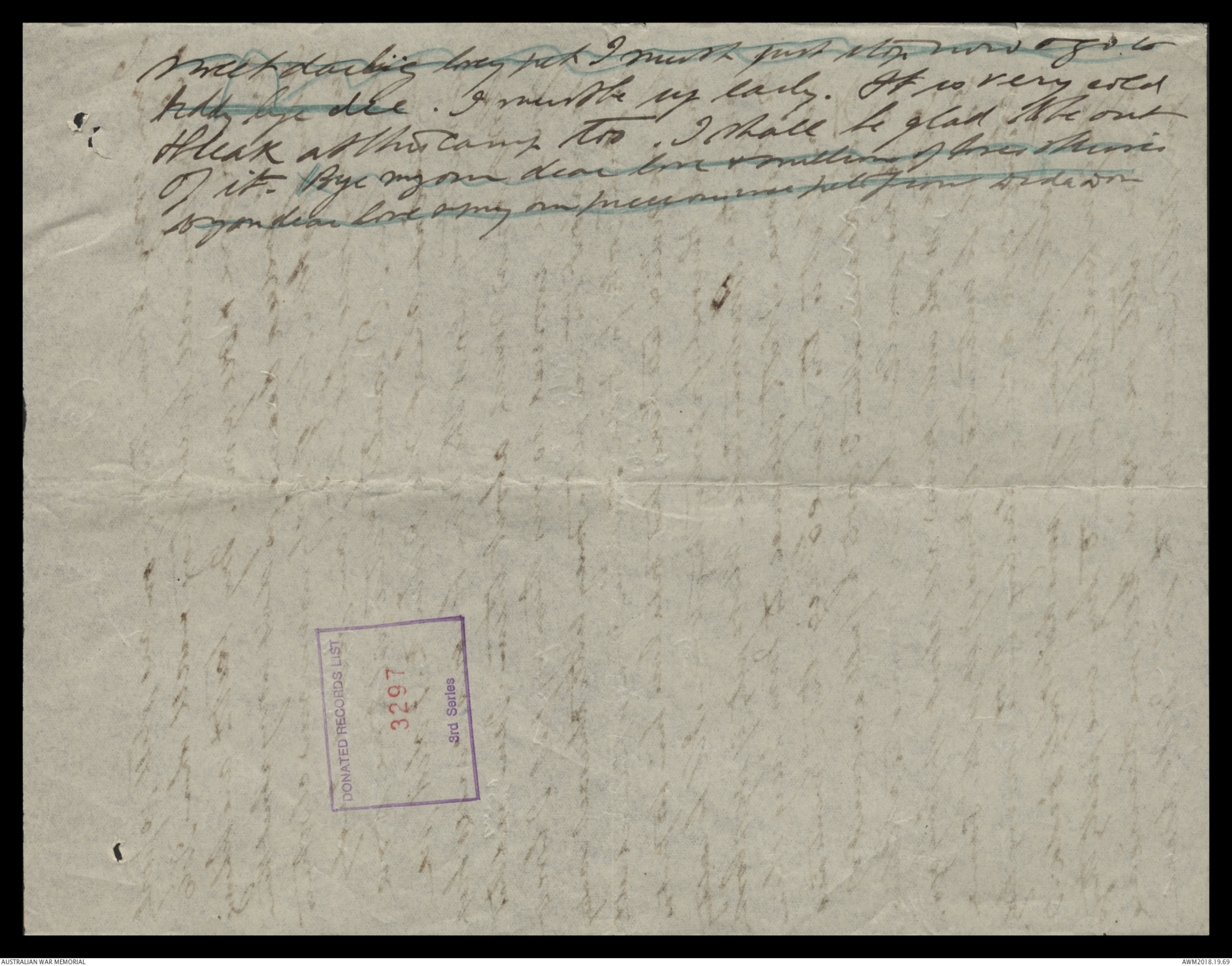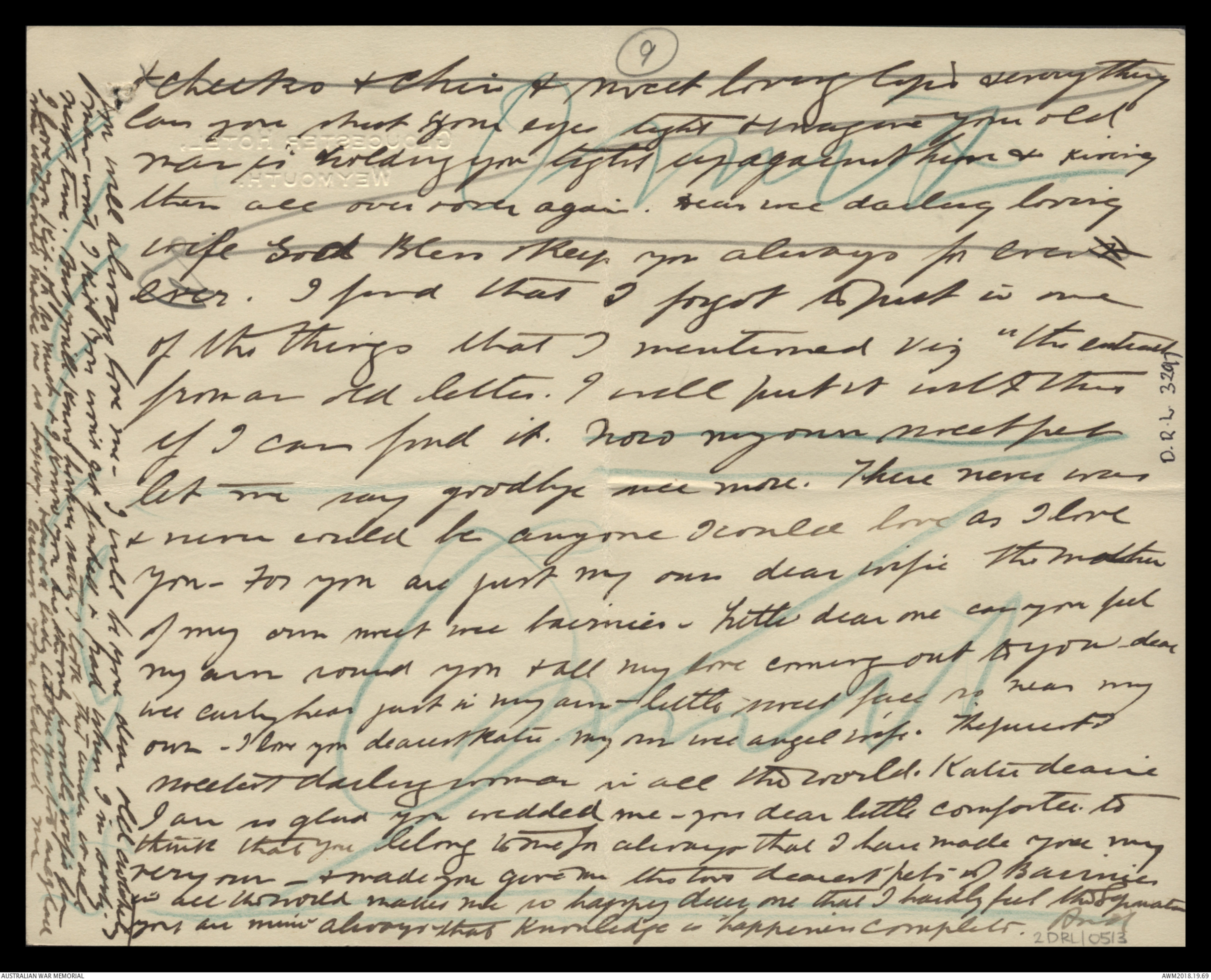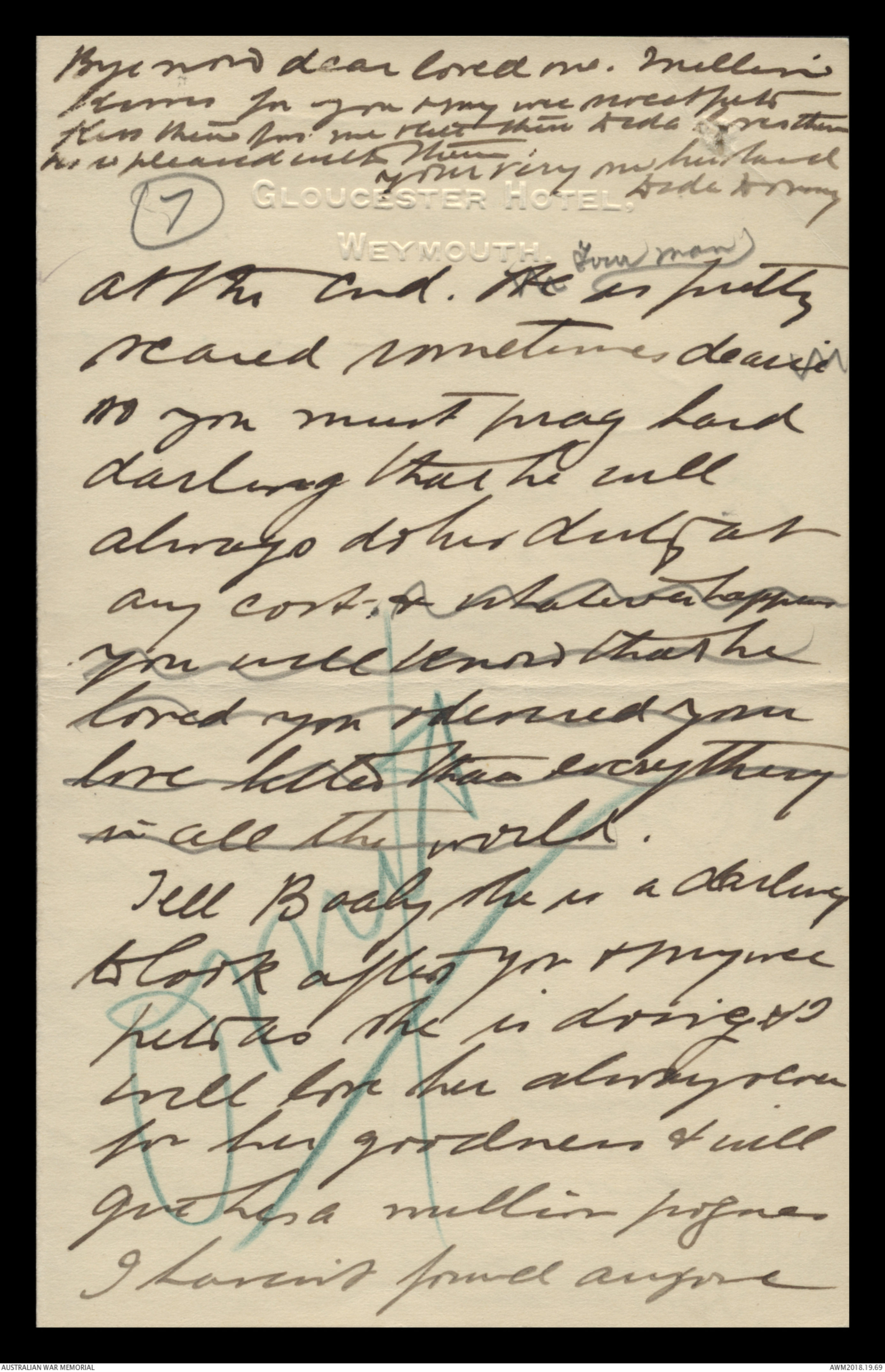if I can find it. Now my own meet petlet me say goodbye once more. There never was& never could be anyone I could love as I loveyou - for you are just my own dear wife the motherof my own sweet wee bairnies- Little dear one can you feelmy arm round you & all my love coming out to you dearwee curly head just in my arm - little sweet face so near myown- I love you dearest Katie. my own wee angel wife. The perfect& &sweetest darling woman in all the world. Katie dearieI am is glad you wedded me - you dear little comforter tothink that you belong to om for always that I have made you my very own - made you give me the two dearest pets of Bairniesin all the world makes me so happy dear, one that I hardly feel the separationyou mine always & that knowledge is happiness complete.