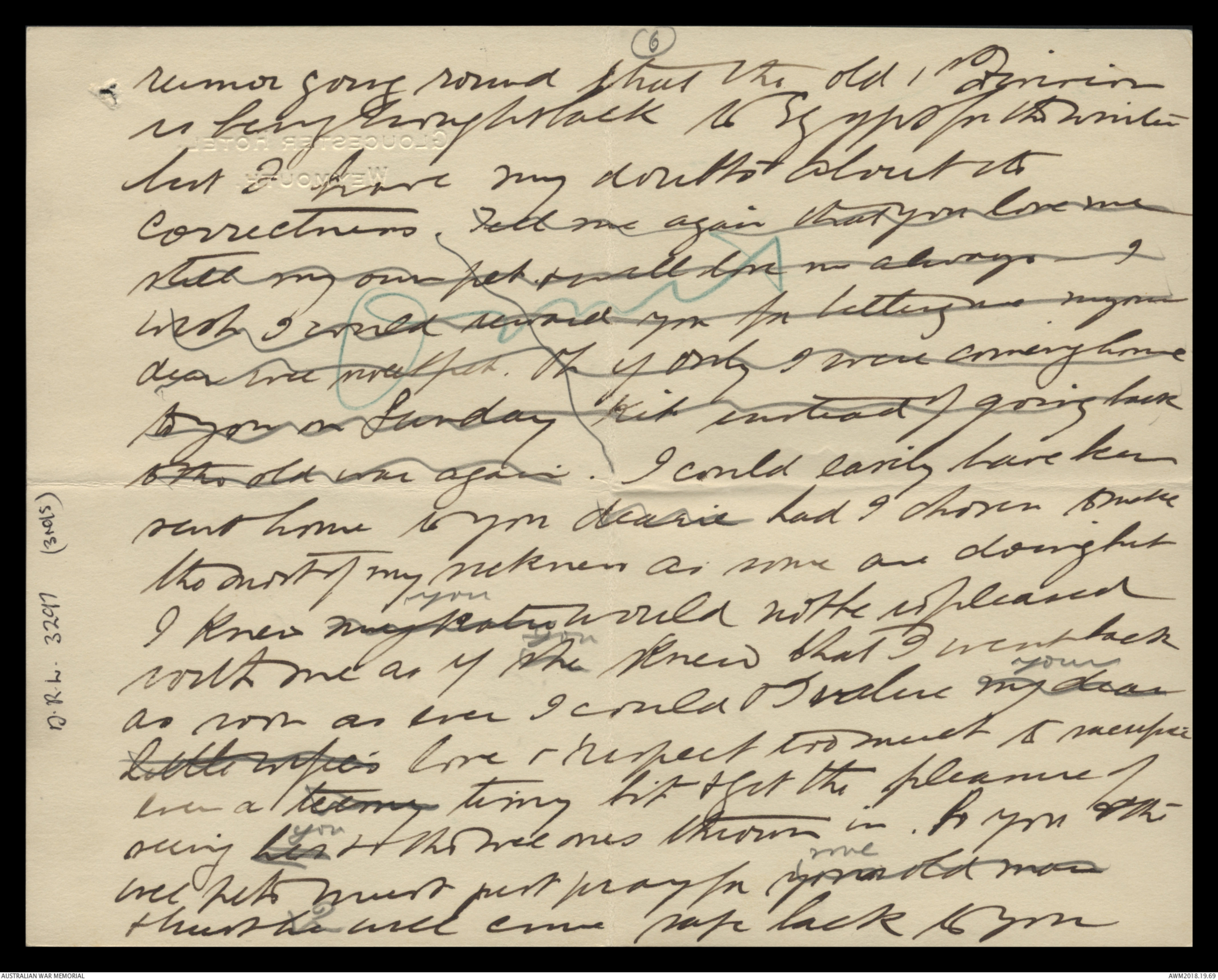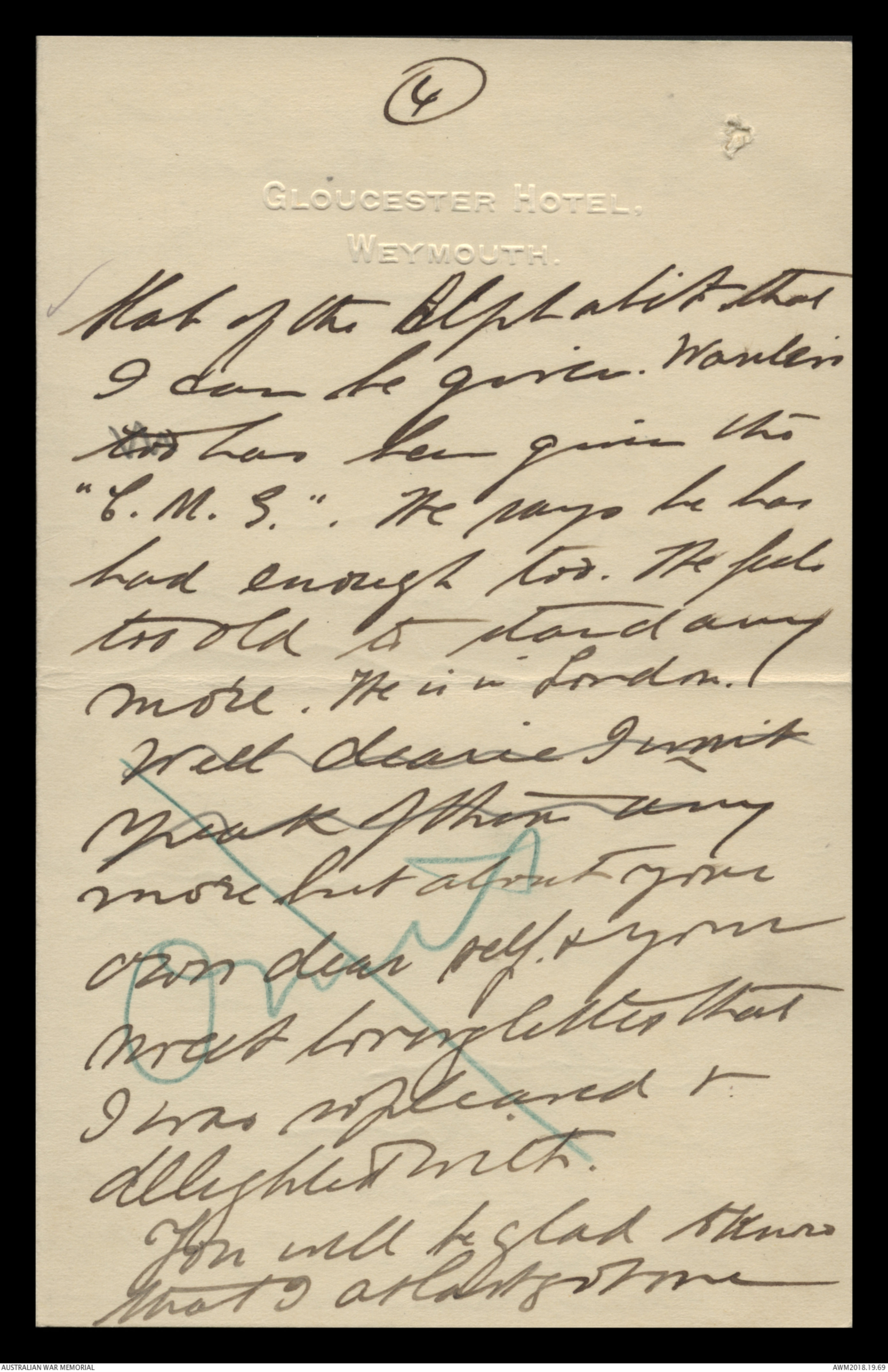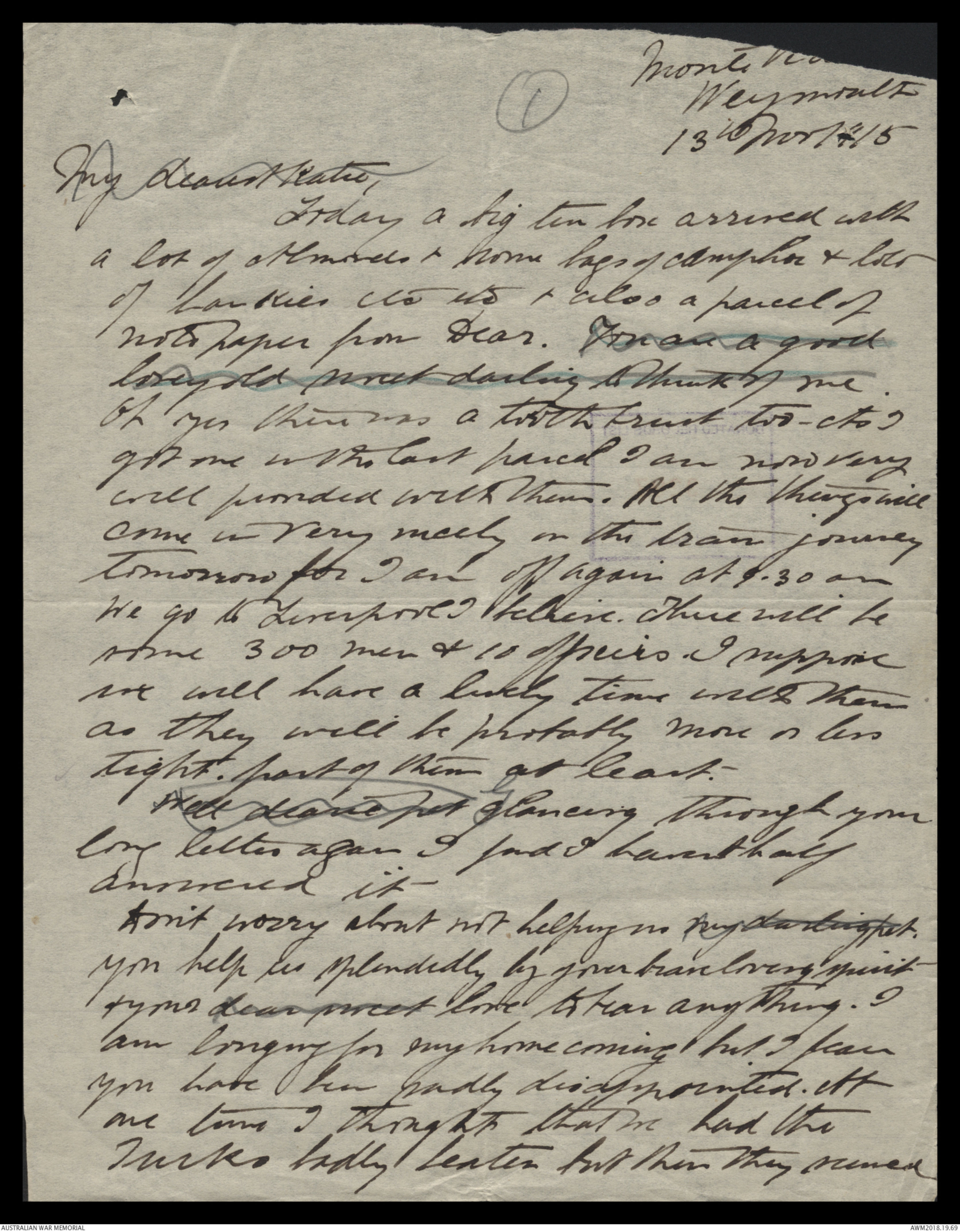 if I can find it. Now my own meet petlet me say goodbye once more. There never was& never could be anyone I could love as I loveyou - for you are just my own dear wife the motherof my own sweet wee bairnies- Little dear one can you feelmy arm round you & all my love coming out to you dearwee curly head just in my arm - little sweet face so near myown- I love you dearest Katie. my own wee angel wife. The perfect& &sweetest darling woman in all the world. Katie dearieI am is glad you wedded me - you dear little comforter tothink that you belong to om for always that I have made you my very own - made you give me the two dearest pets of Bairniesin all the world makes me so happy dear, one that I hardly feel the separationyou mine always & that knowledge is happiness complete.