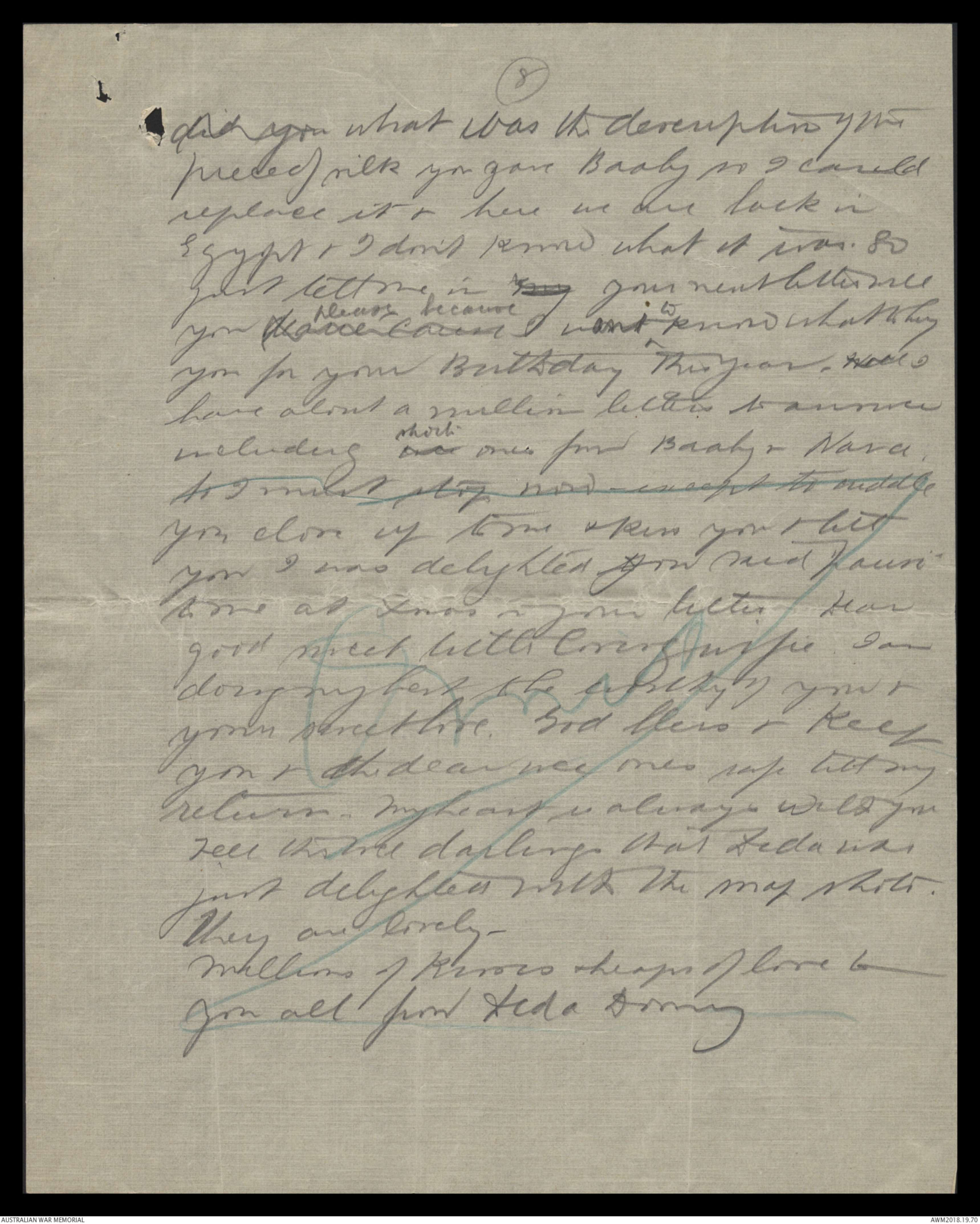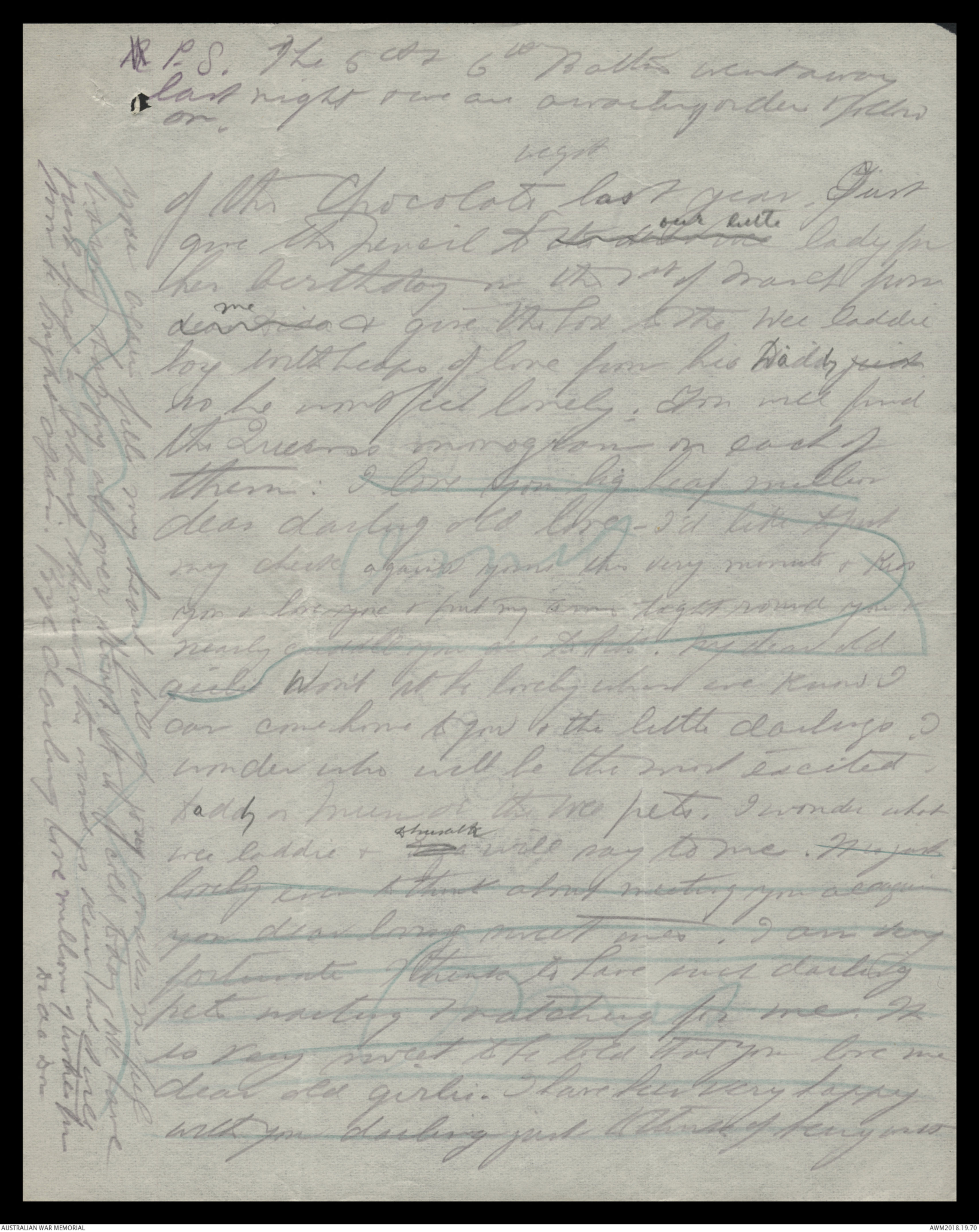 including one short ones from Baaby & Nana.So I must stop now except that the middleyou close up to me & kiss your xxxxyou I was delighted you said xxx'to me at Xmas in your letter. Have good sweet little loving wifie I amdoing my best to be worthy of you &your sweet love. God bless & keepyou & the dear wee ones safe till myreturn. My heart is always with youTell the wee darlings that Dida wasjust delighted with the snap shotsThey are lovely.Millions of kisses & heaps of love toyou all from Dida & Donny