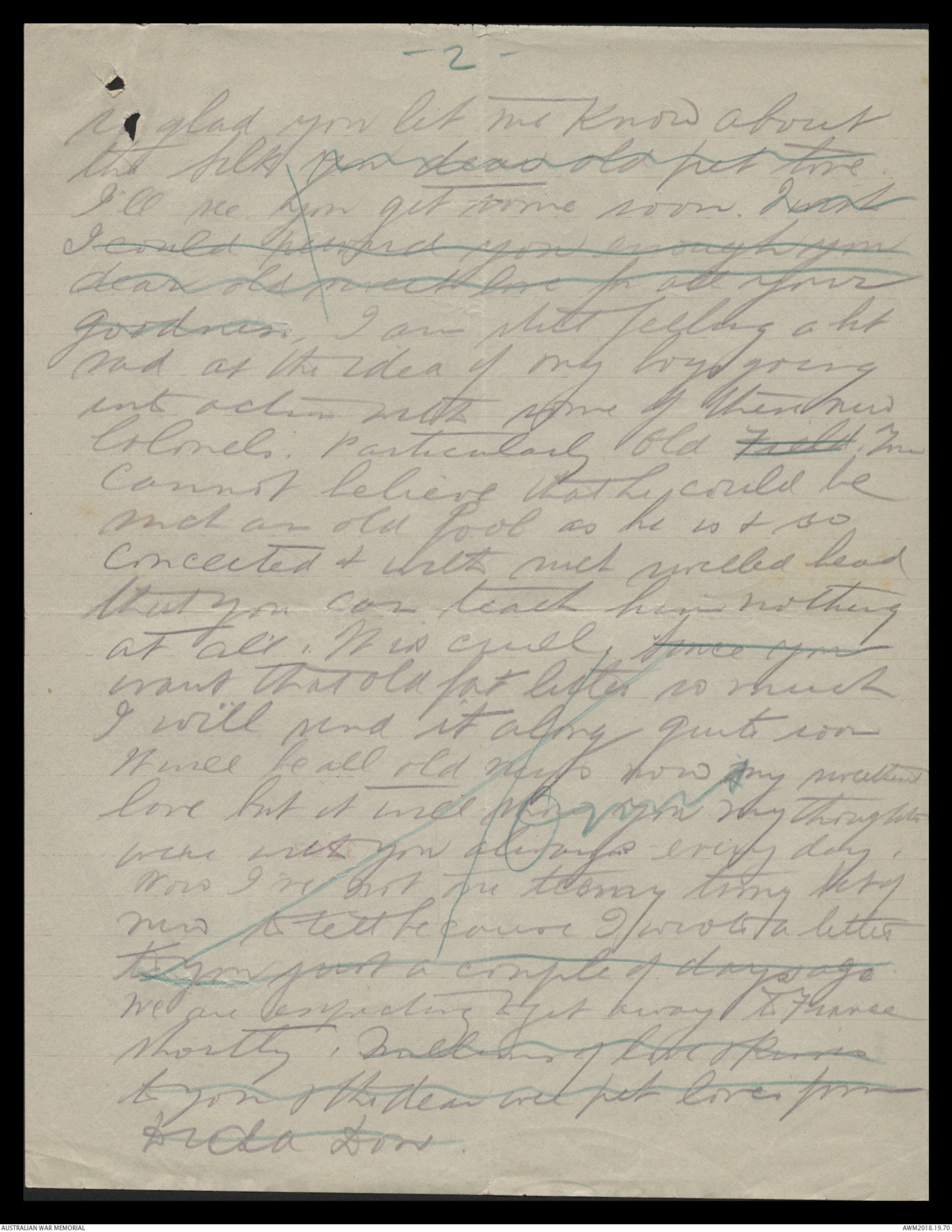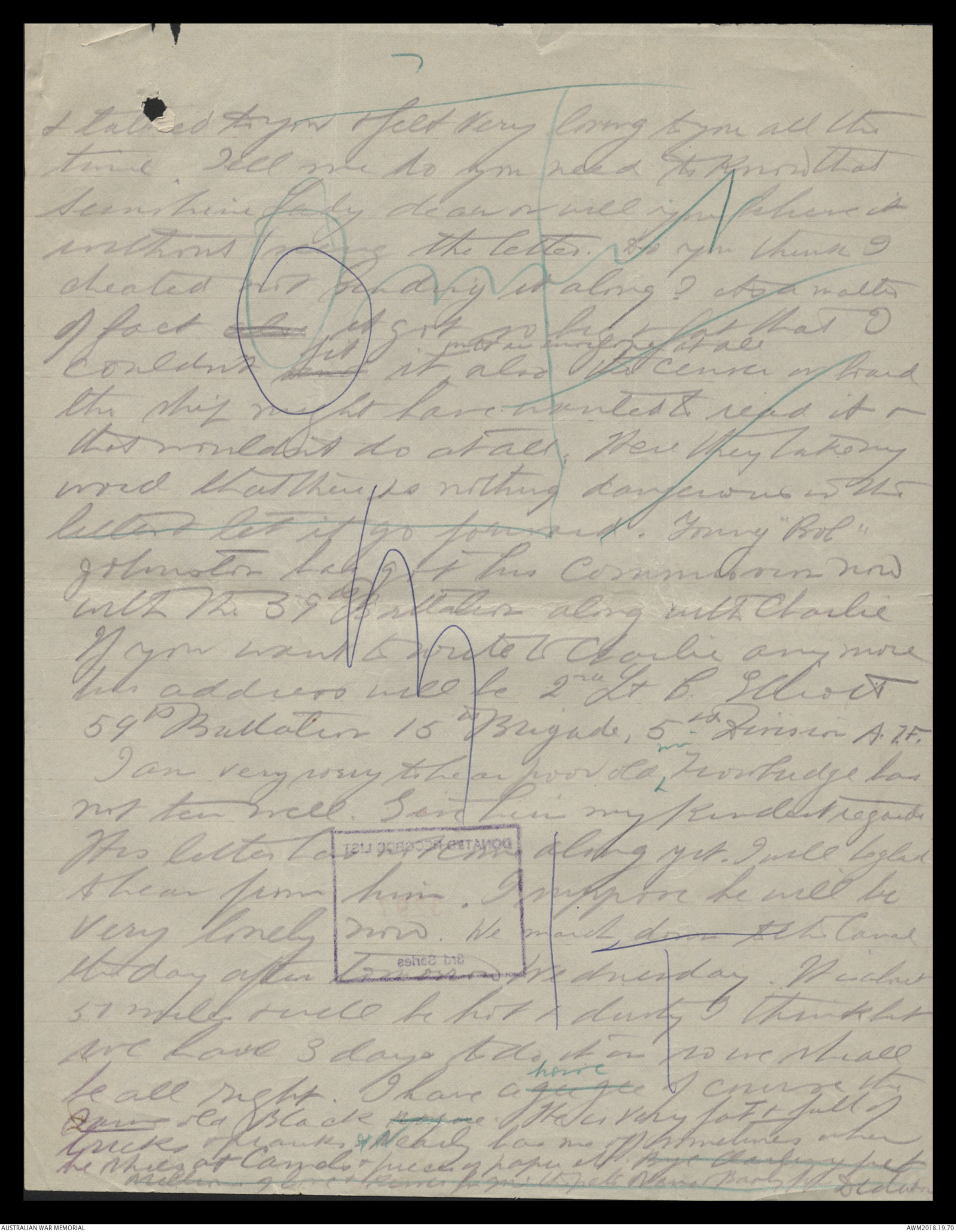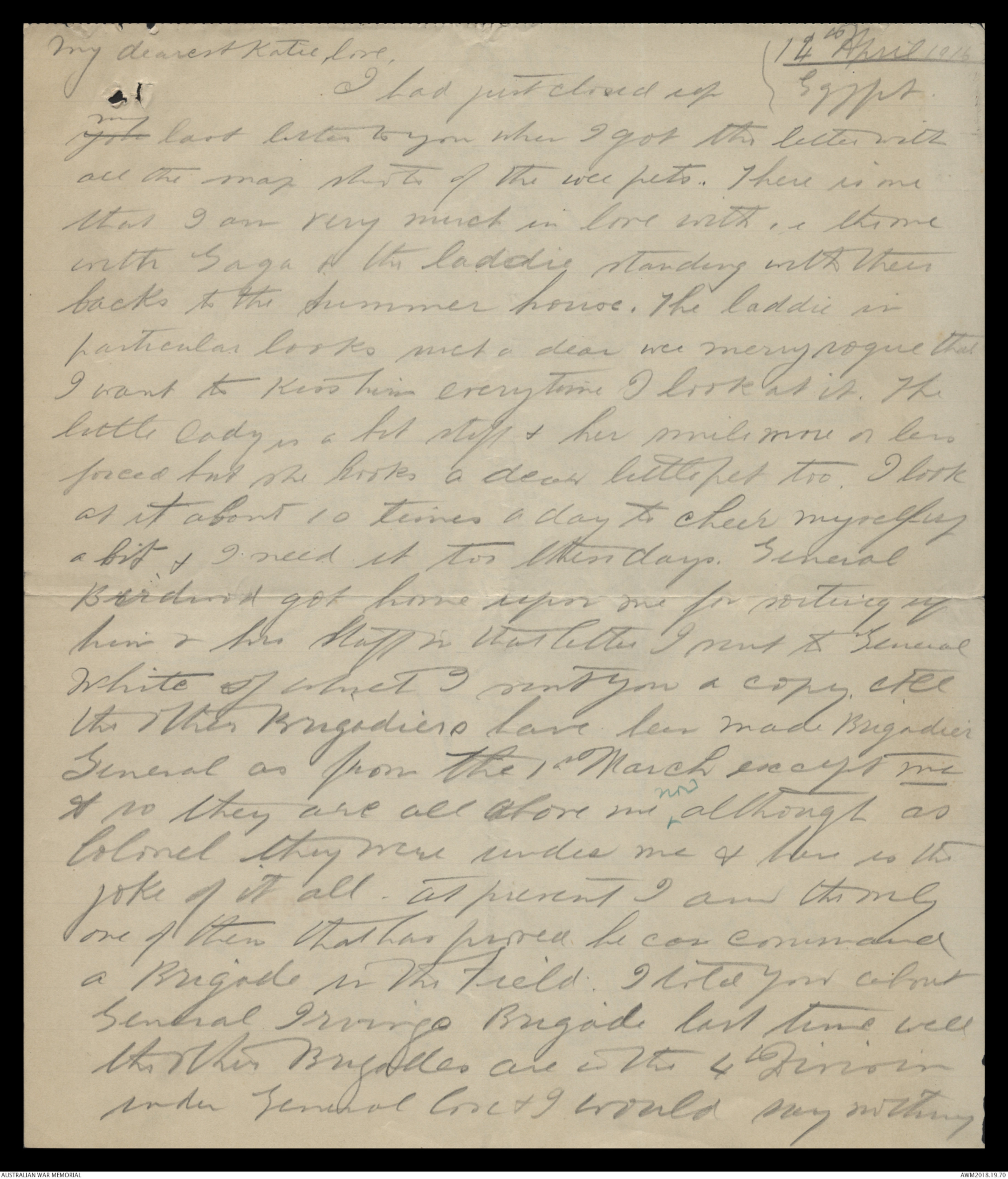 & talked to you & felt very loving to you all thistime. Tell me do you know thatsometimes Lady dear or will you believe itwithout seeing the letter. Do you think Icheated not sending it along? As a matterof fact also it got so big & fat that Icouldn't send fit it ^mtr in everyone at all also the censor on boardthe ship may not have wanted & read it &that wouldn't do at all. Here they take myword that there is nothing dangerous in thisletter & let it go forward. Young "Bol"Johnston has got his commission nowwith the 39th Battalion along with Charlie If you want to write to Charlie any morehis address will be 2nd Lt B Elliot59th Battalion 15th brigade, 5th Division A.I.F.I am very sorry to hear poor old ^ mr Trowbridge hasnot been well. Give him my kindest regardsHis letter not come along yet. I will be gladto hear from him. I suppose he will beVery lonely now. We march down to the Canalthe day after tomorrow Wednesday. It is about57 miles & will be hot & dirty I think butwe have 3 days to do it or no we shallbe all right. I have a geegee horse of course theAgaine old Black Nagace He is very fat & full oftricks & pranks & nearly has me off sometimes whenhe shies at Canals & pieces of paper etc. By darling petmillions of love & save some for me & the pets Nana & Baaby Dida