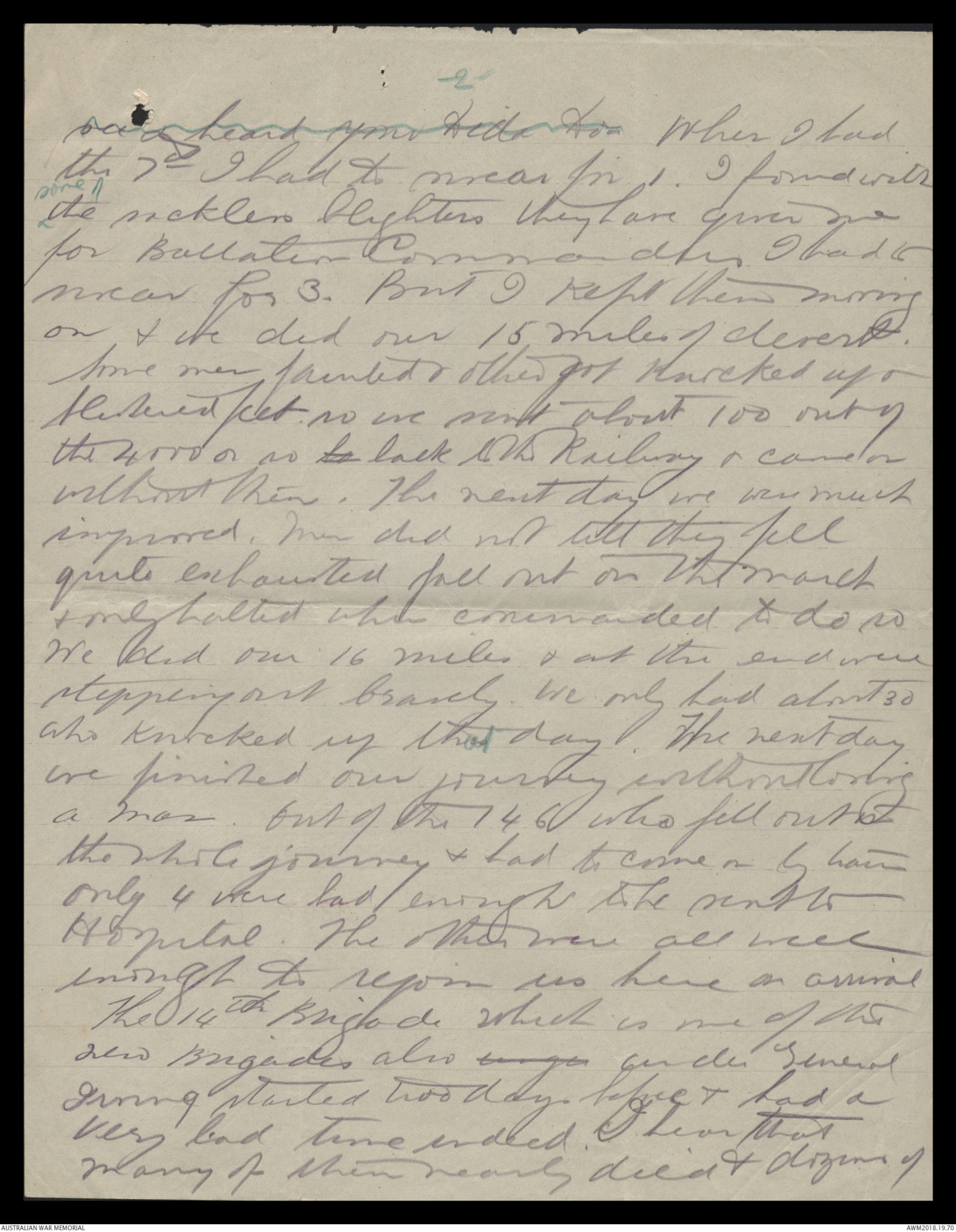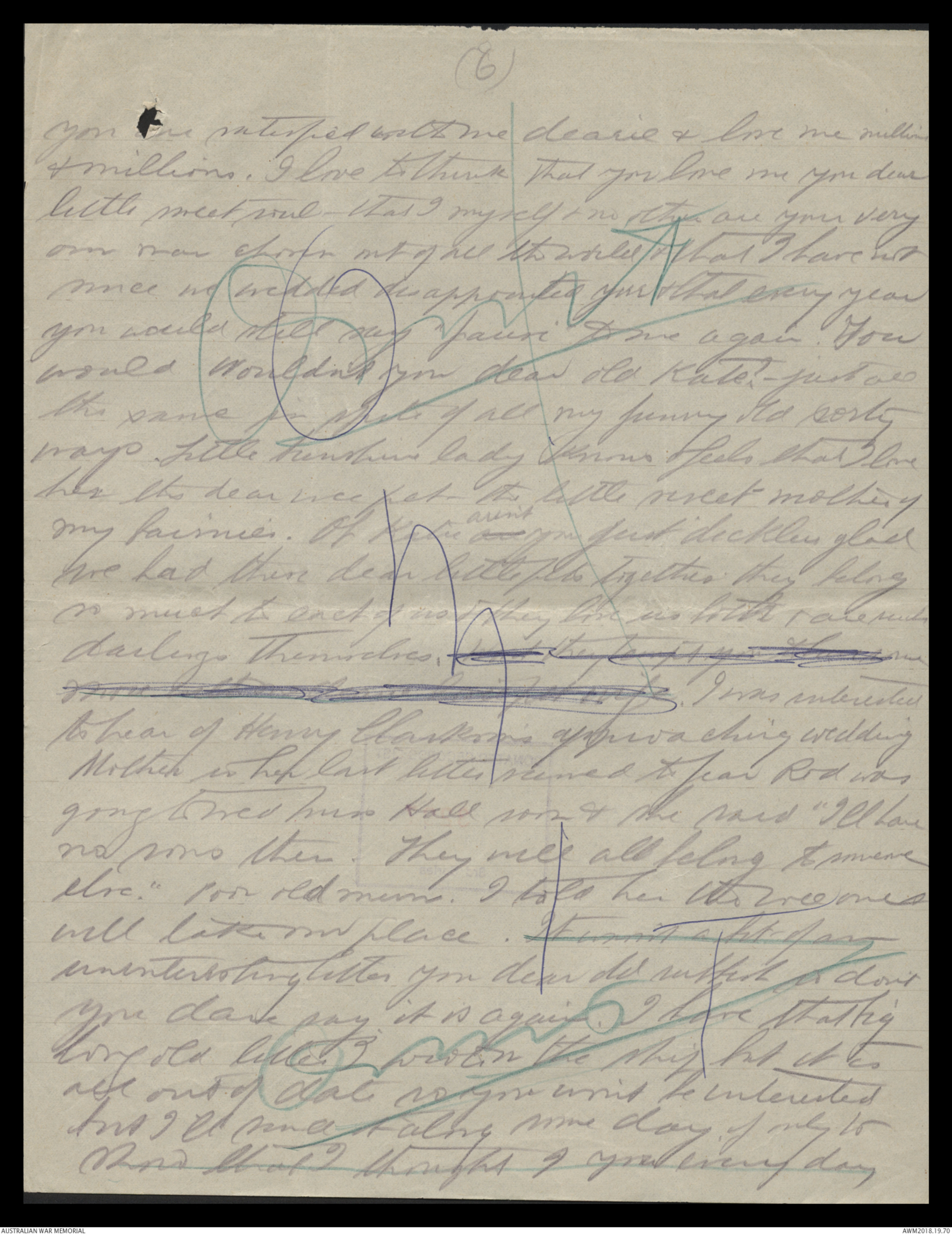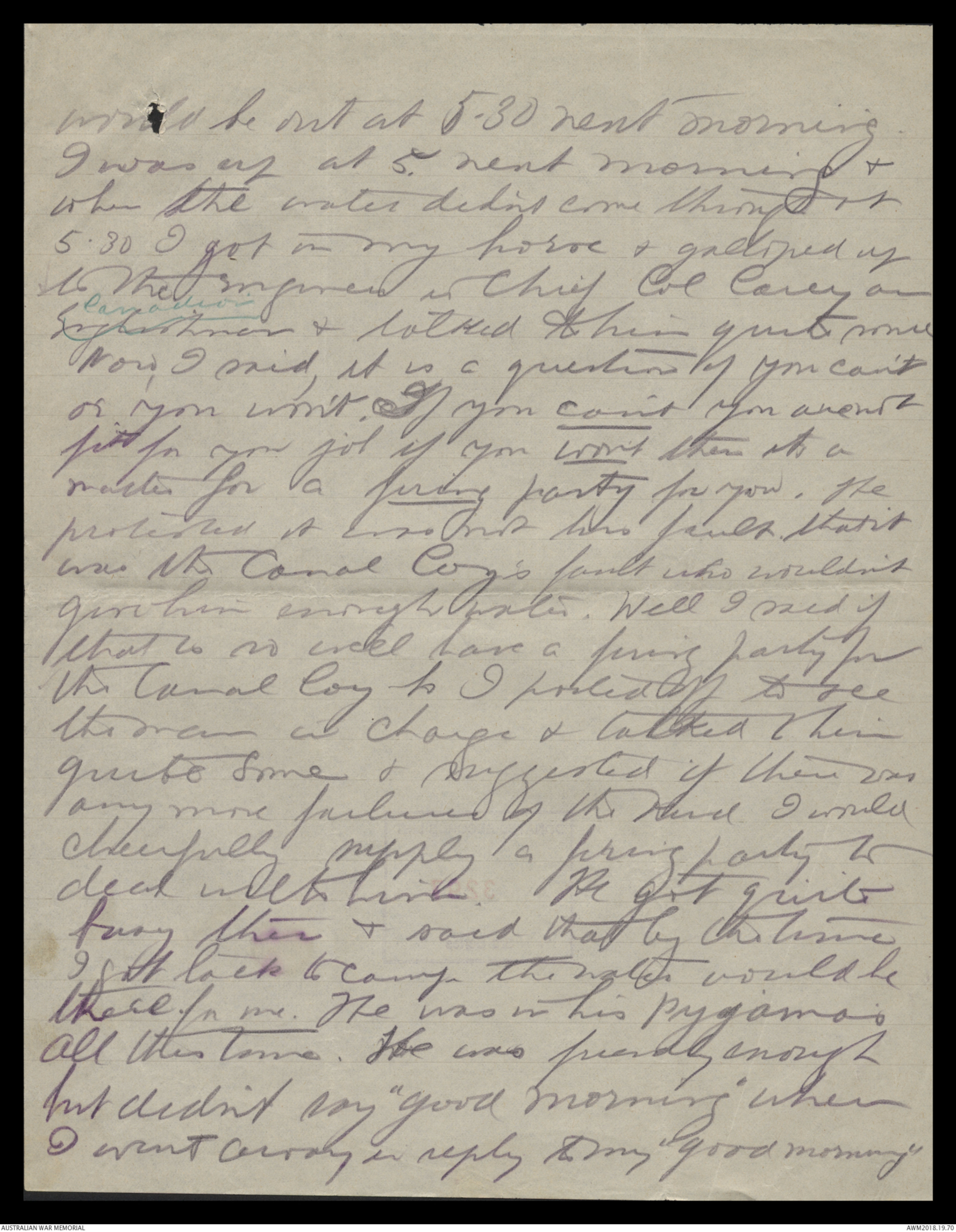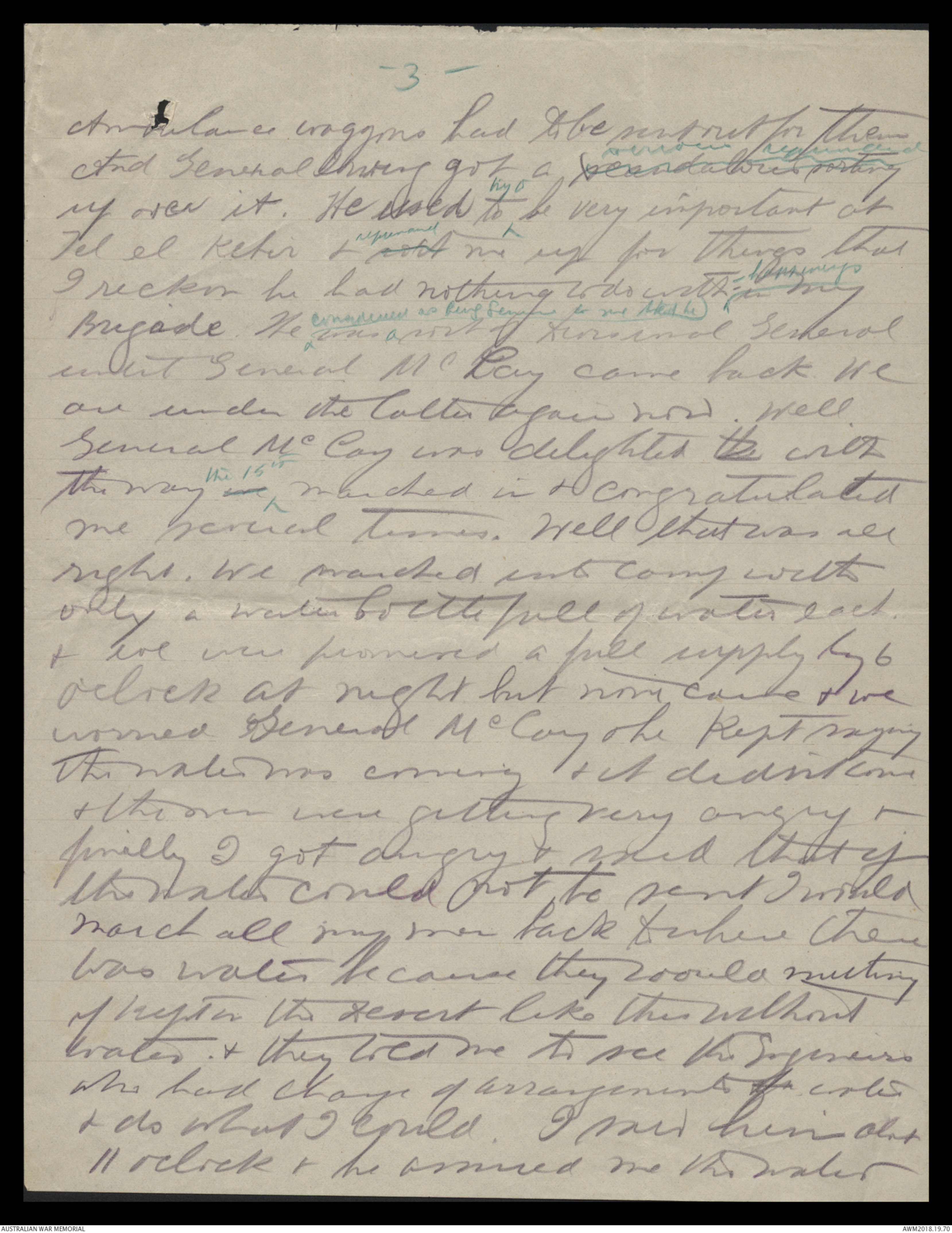 & talked to you & felt very loving to you all thistime. Tell me do you know thatsometimes Lady dear or will you believe itwithout seeing the letter. Do you think Icheated not sending it along? As a matterof fact also it got so big & fat that Icouldn't send fit it ^mtr in everyone at all also the censor on boardthe ship may not have wanted & read it &that wouldn't do at all. Here they take myword that there is nothing dangerous in thisletter & let it go forward. Young "Bol"Johnston has got his commission nowwith the 39th Battalion along with Charlie If you want to write to Charlie any morehis address will be 2nd Lt B Elliot59th Battalion 15th brigade, 5th Division A.I.F.I am very sorry to hear poor old ^ mr Trowbridge hasnot been well. Give him my kindest regardsHis letter not come along yet. I will be gladto hear from him. I suppose he will beVery lonely now. We march down to the Canalthe day after tomorrow Wednesday. It is about57 miles & will be hot & dirty I think butwe have 3 days to do it or no we shallbe all right. I have a geegee horse of course theAgaine old Black Nagace He is very fat & full oftricks & pranks & nearly has me off sometimes whenhe shies at Canals & pieces of paper etc. By darling petmillions of love & save some for me & the pets Nana & Baaby Dida