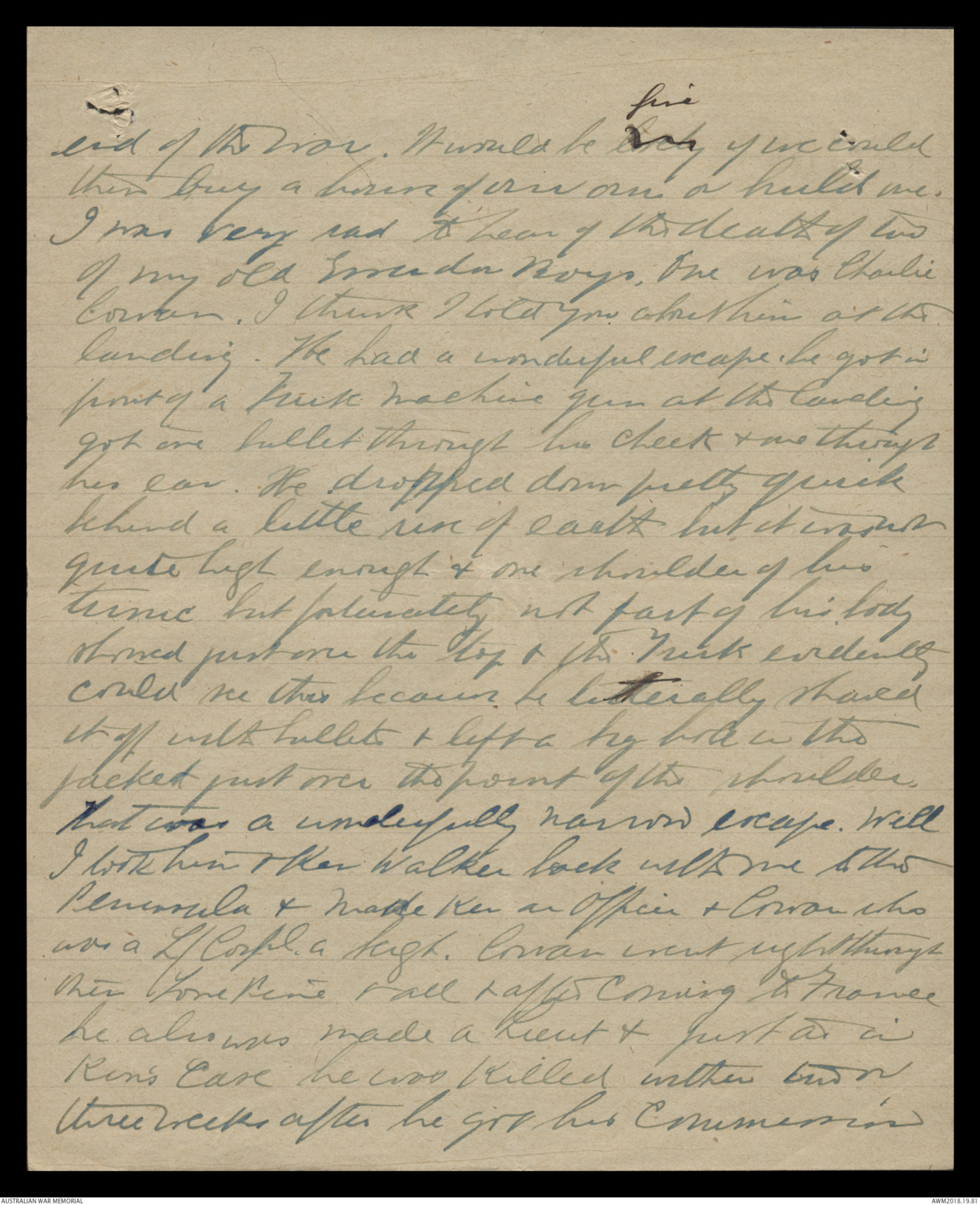 a piece of shell went right throughhis [[ George’s ]] head & Killed him instantly.