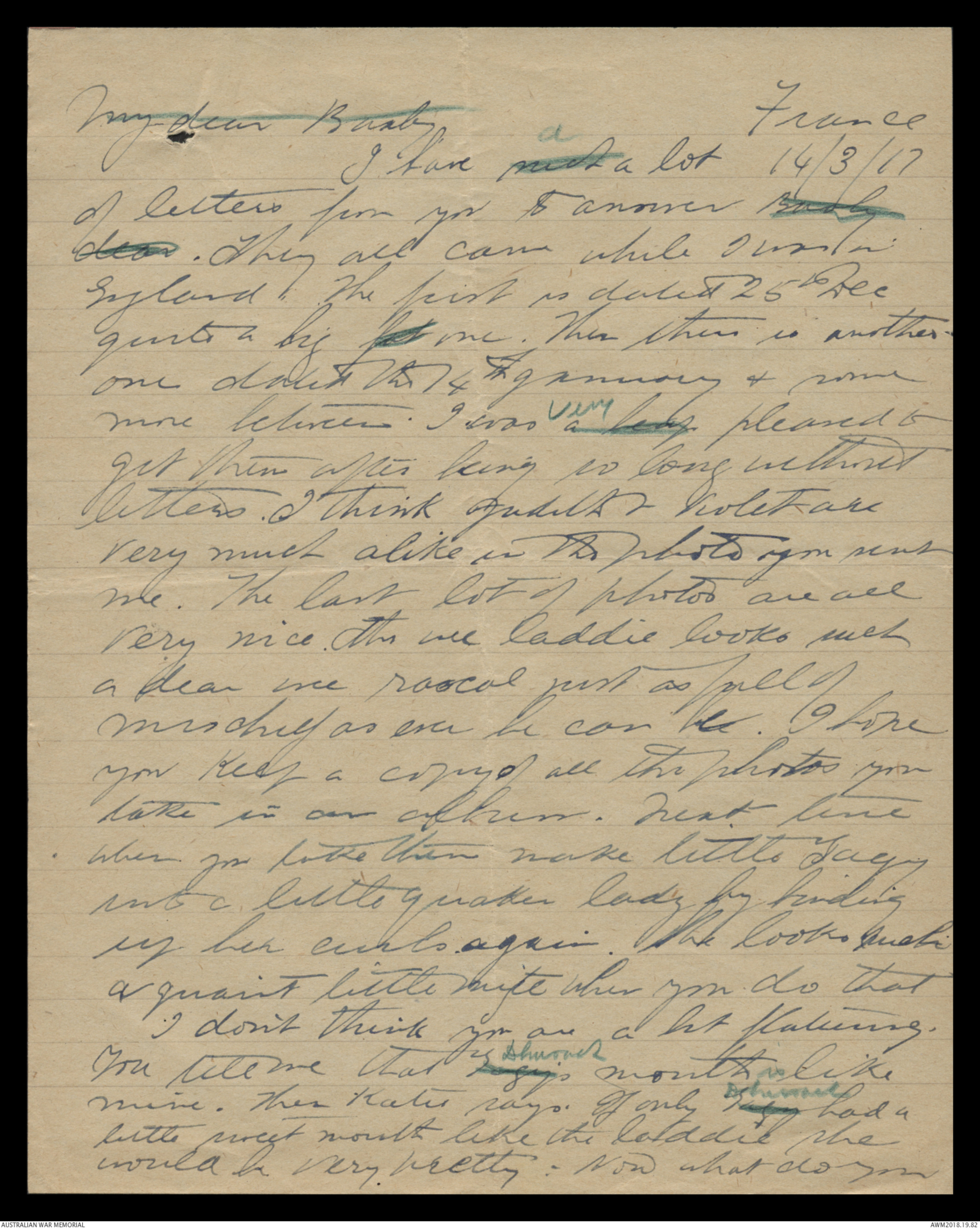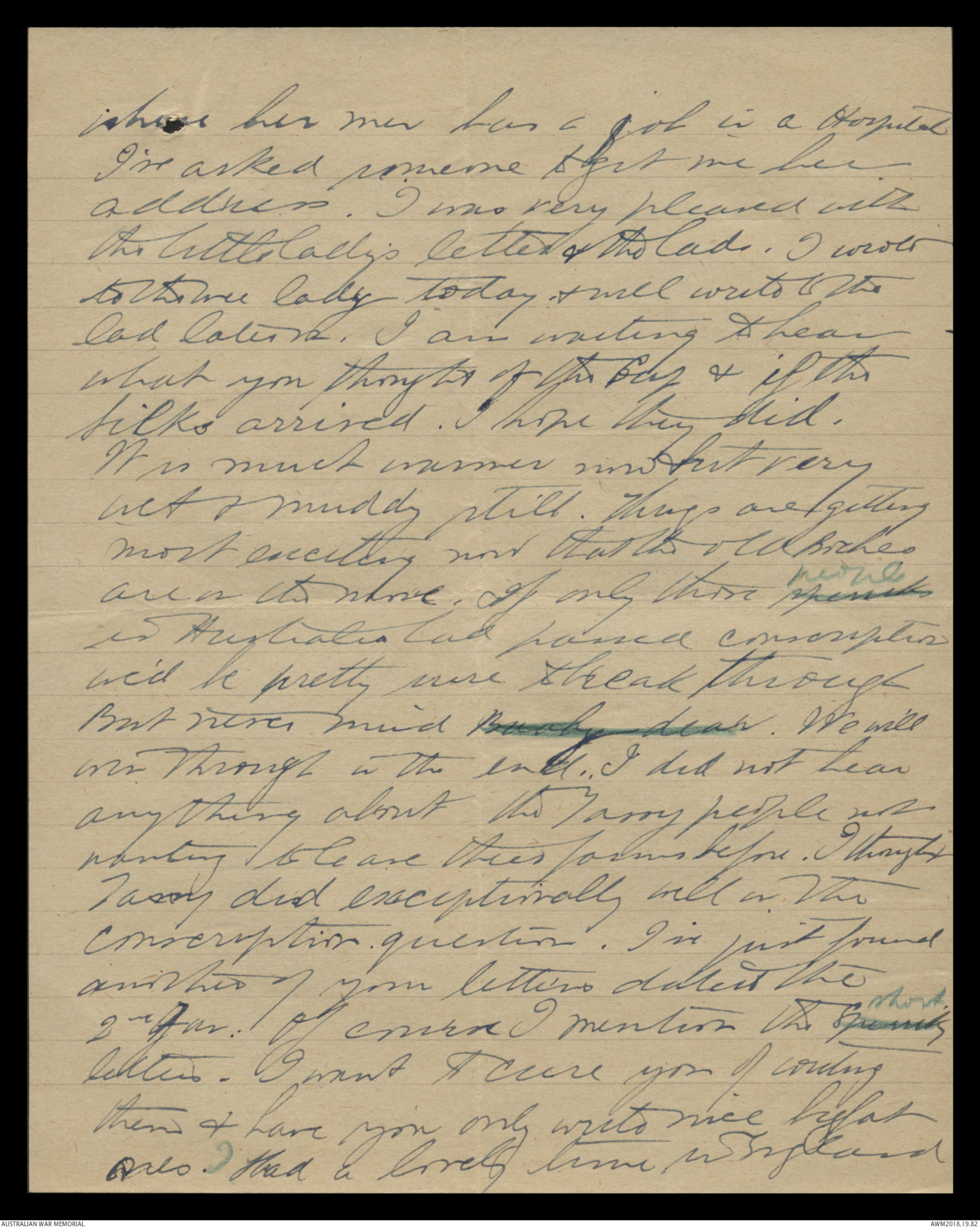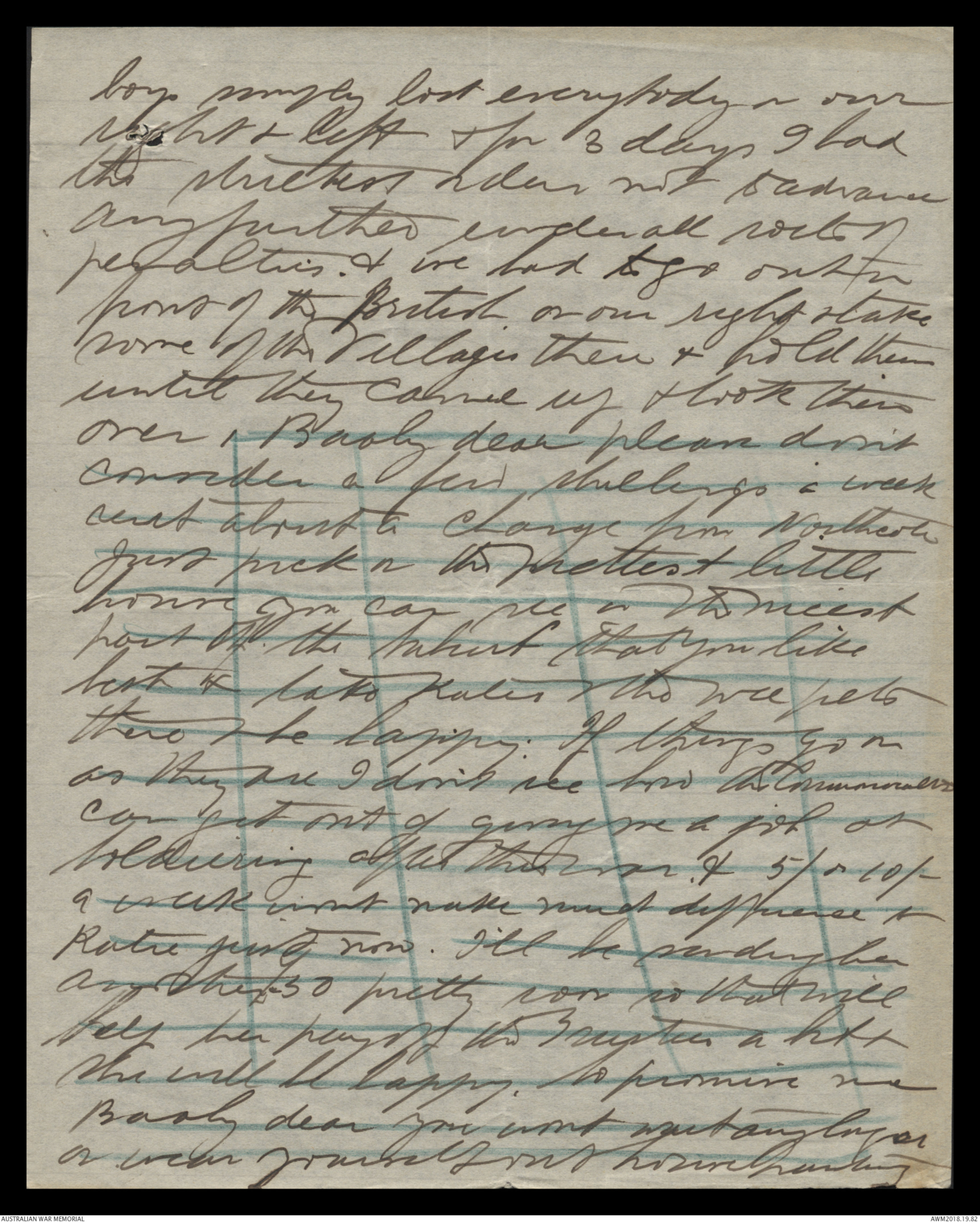 over. Baaby dear please don’tconsider a few shillings a weekrent about to change from NorthcoteJust pick on the prettiest littlehouse you can see in the nicestpart of the Suburb that you likebest & take Katie & the wee petsthere & be happy: If things go onas they are I don’t see how the Commonwealthcan get out of giving me a job atSoldiering after this war. & 5/ or 10/-a week wont make much difference toKatie just now. I’ll be sending heranother £ 50 pretty soon so that willhelp her pay off the Trustees a bit &she will be happy. So promise meBaaby dear you wont wait any longeror wear yourself out house hunting