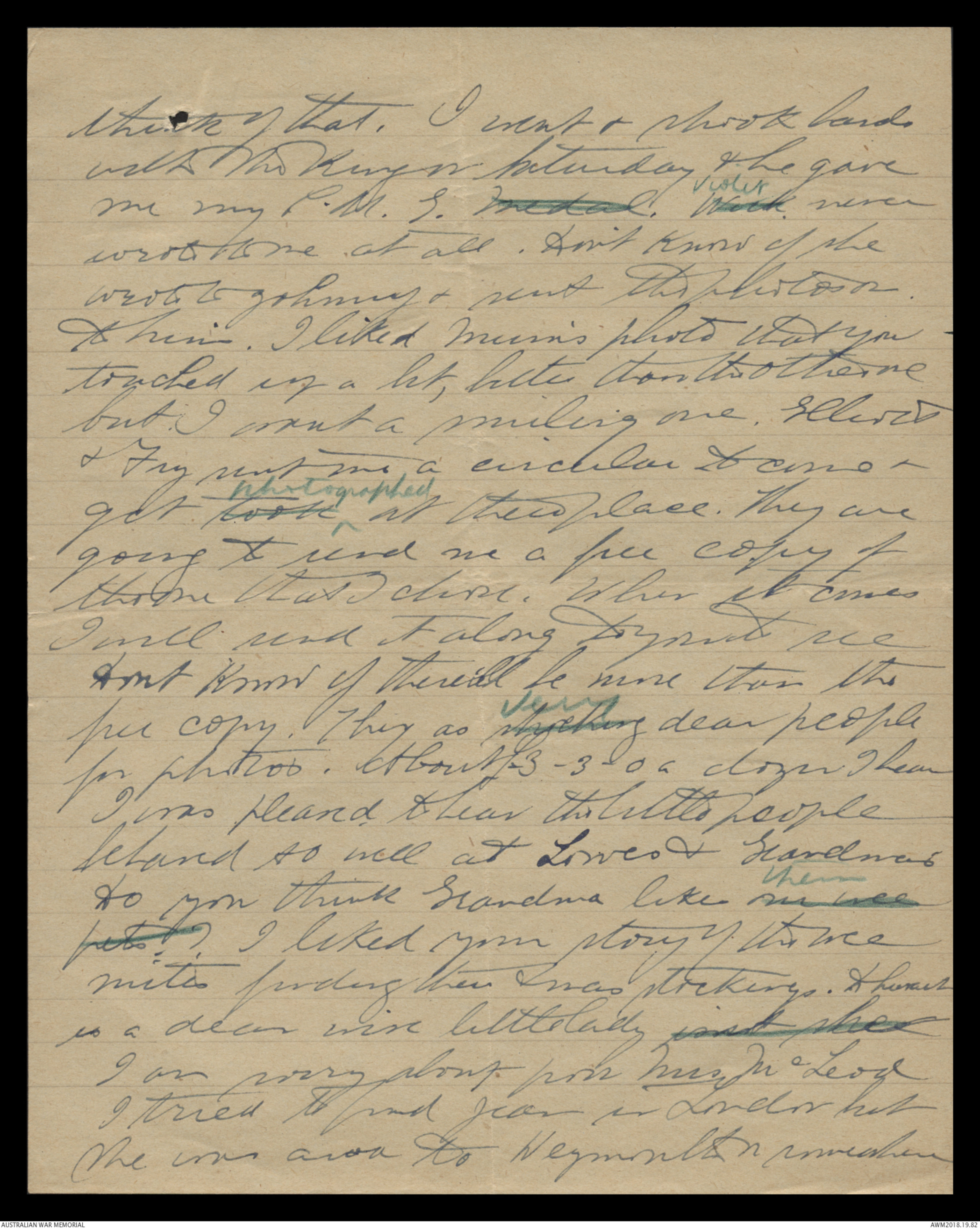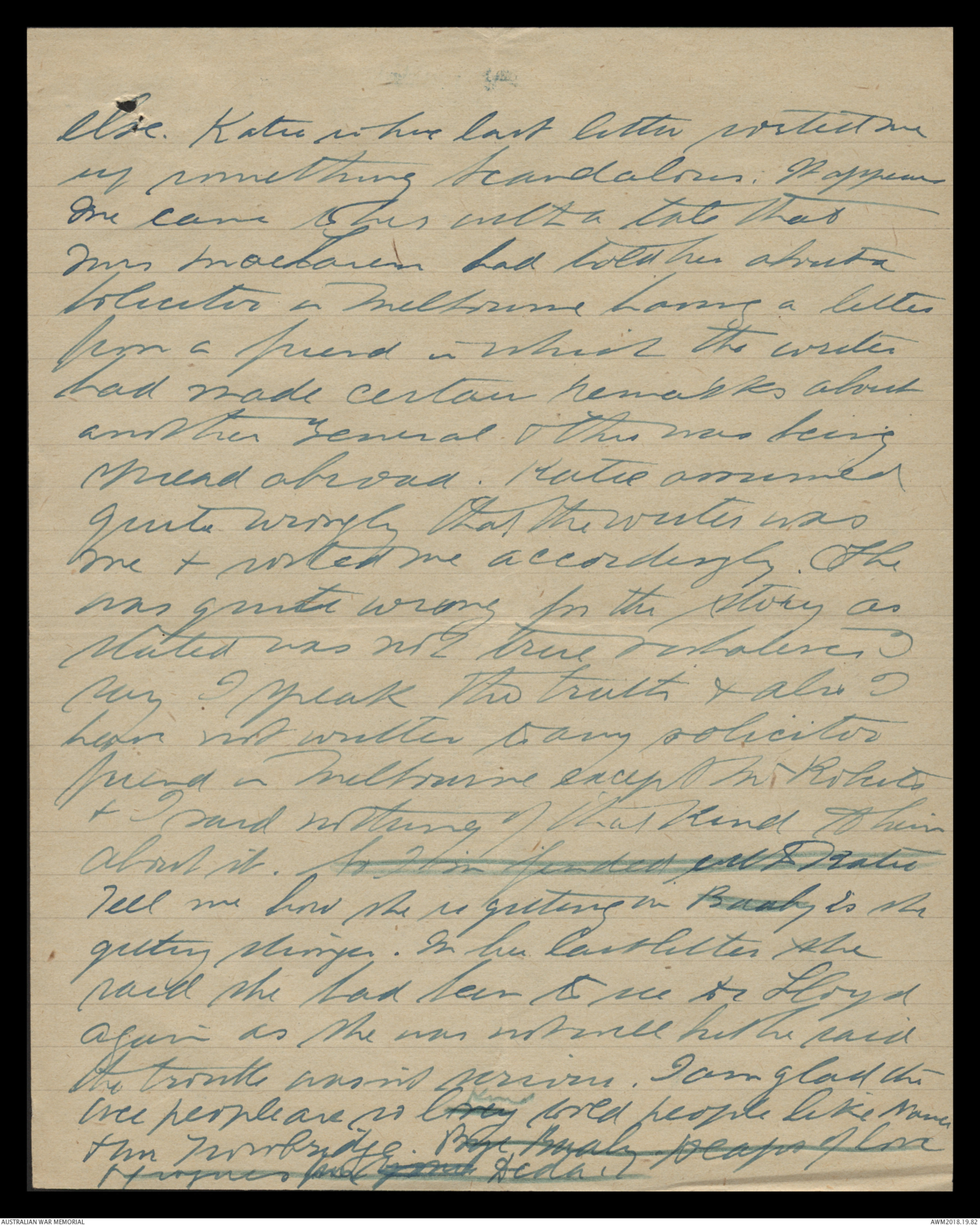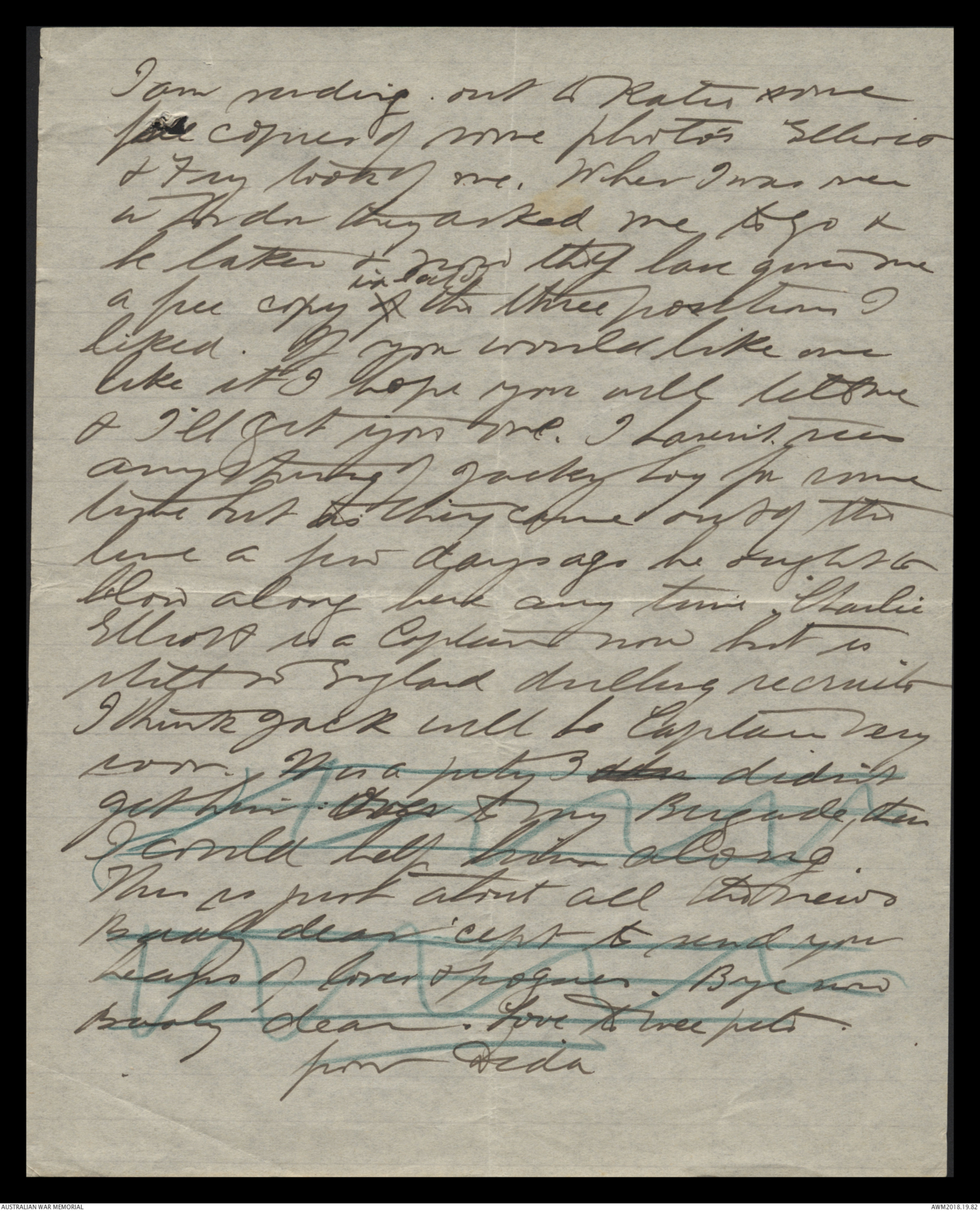 over. Baaby dear please don’tconsider a few shillings a weekrent about to change from NorthcoteJust pick on the prettiest littlehouse you can see in the nicestpart of the Suburb that you likebest & take Katie & the wee petsthere & be happy: If things go onas they are I don’t see how the Commonwealthcan get out of giving me a job atSoldiering after this war. & 5/ or 10/-a week wont make much difference toKatie just now. I’ll be sending heranother £ 50 pretty soon so that willhelp her pay off the Trustees a bit &she will be happy. So promise meBaaby dear you wont wait any longeror wear yourself out house hunting