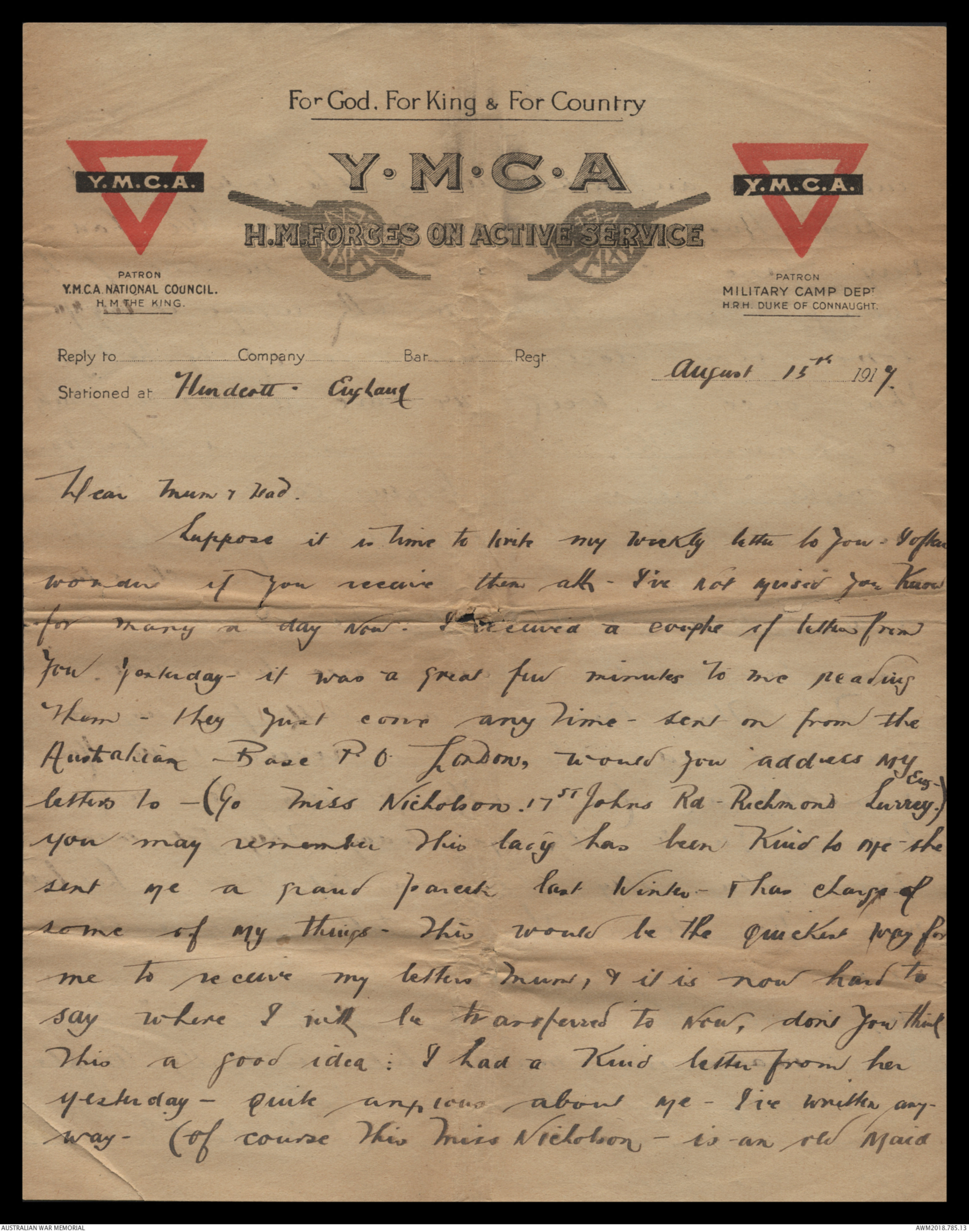 letters to -(c/o Miss Nicholson 17 ST Johns Rd - Richmond Surrey Eng.)