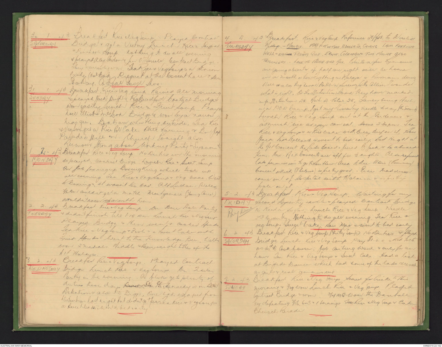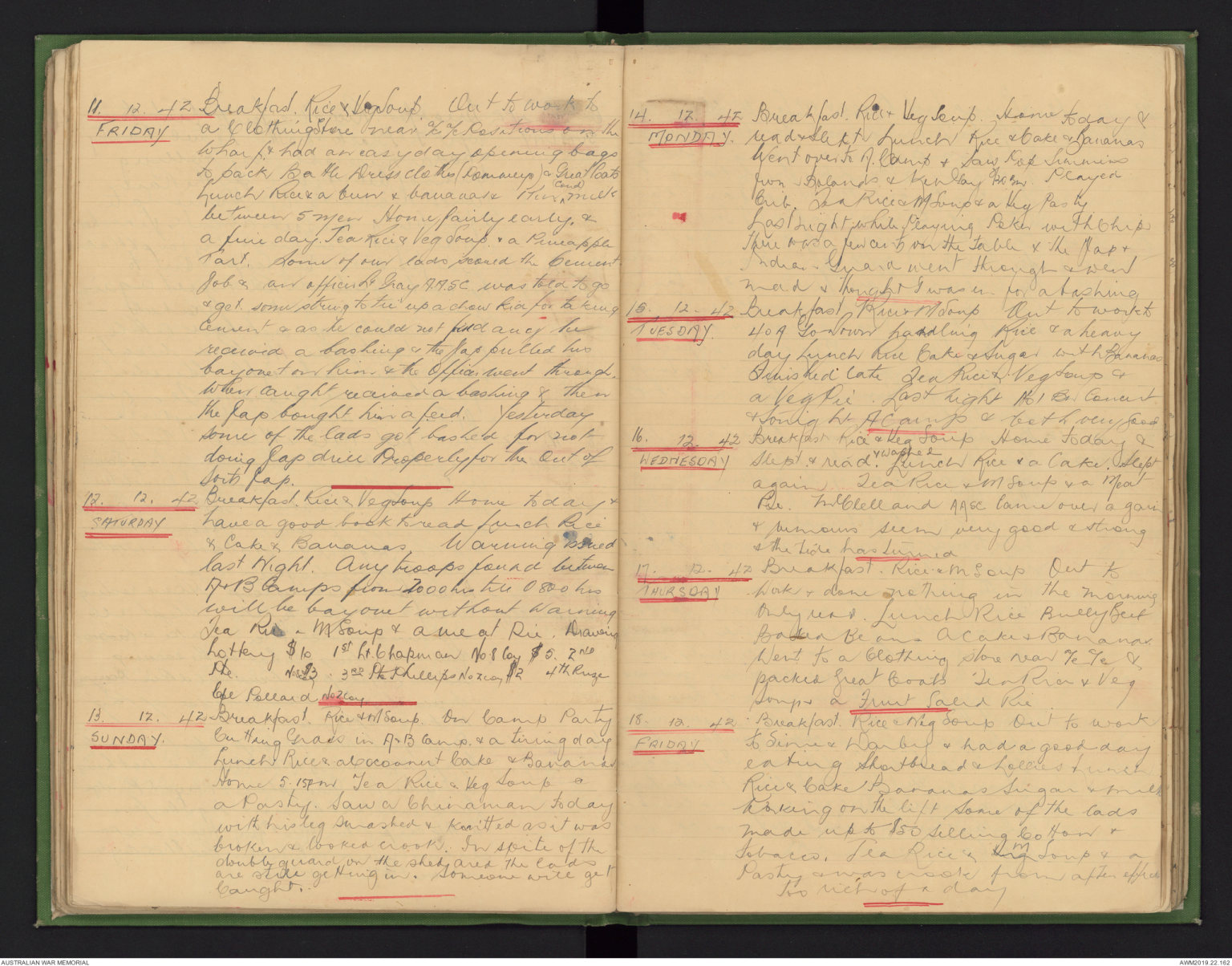 Breakfast Rice & Veg Soup. On fatigue at 10am & have to Report to Alf Armans. Had to dig Urinals & had a good mornings work. Peter Tait & Diga Bele Snow Theodore Walker Chalmers & myself & finished 1.30pm. Lunch Rice & Peanut & Guva Soup. Nothing to do all evening & [[Bill Ambrose?]] came over Telling us about the Huns not respecting the Red Cross, Bombing the hospital. Tea Rice & Veg Soup & a Curry cake. Went to a lecture about Timor & they sure had a heavy task to do 2/40th [[&?]] 2/11 Eng Capt. Spence is doing a good job in Timor. |