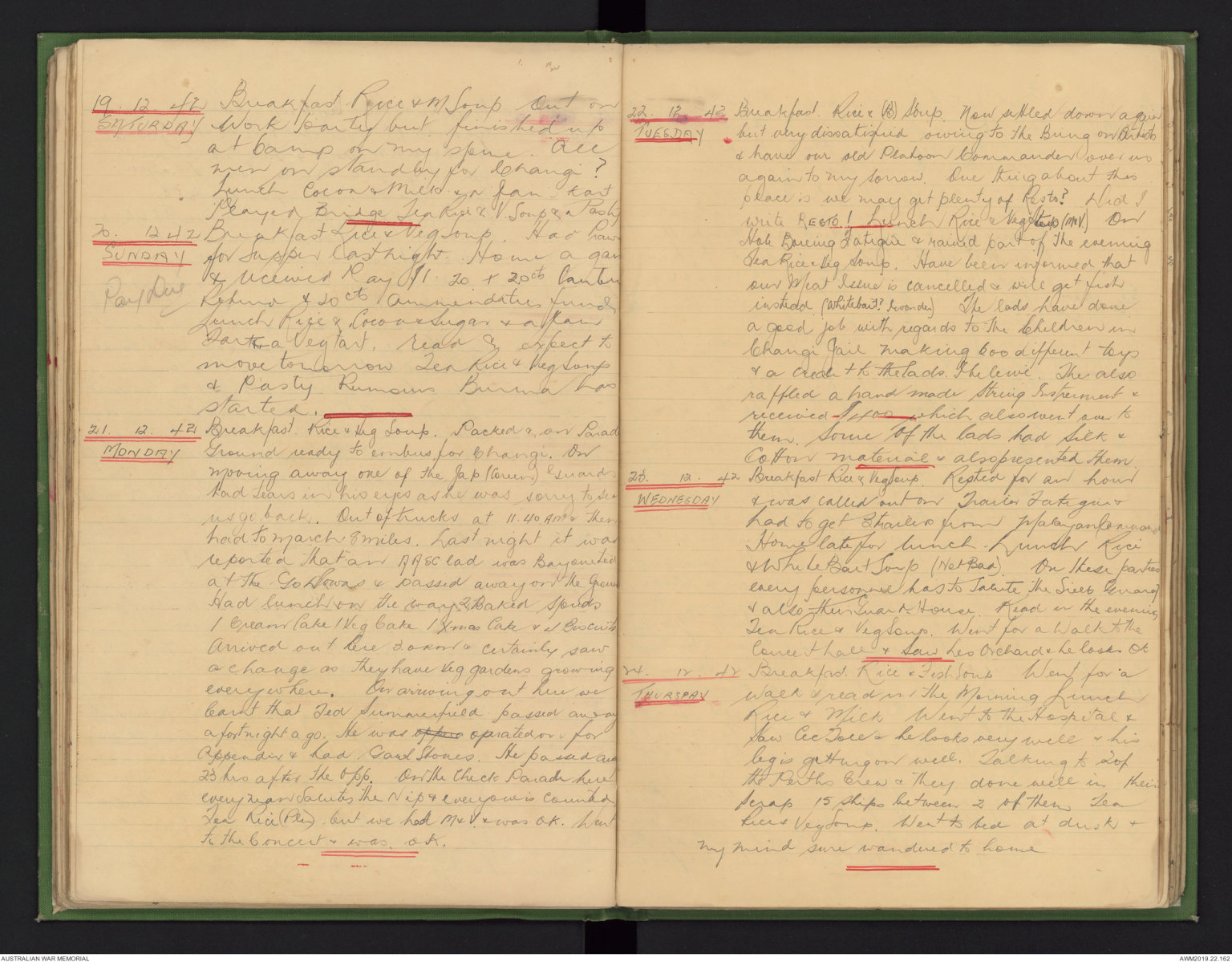 Breakfast. Rice & Veg Soup. Out to work to a Clothing Store near a/c a/c Positions on the wharf & had an easy day opening bags to pack Battle Dress clothes (Pommys) & Great Coats Lunch Rice & a bun & banana & 1 Tin ^(cond) milk between 5 men Home fairly early, & a fine day. Tea Rice & Veg Soup & a Pineapple Tart. Some of our lads scored the Cement Job & our officer Lt Gray A.A.S.C was told to go & get some string to tie up a chow kid for taking Cement & as he could not find any he received a bashing & the Jap pulled his bayonet on him & the Officer went through. When caught received a bashing & then the Jap bought him a feed. Yesterday some of the lads got bashed for not doing Jap drill Properly for the Out of Sorts Jap. |