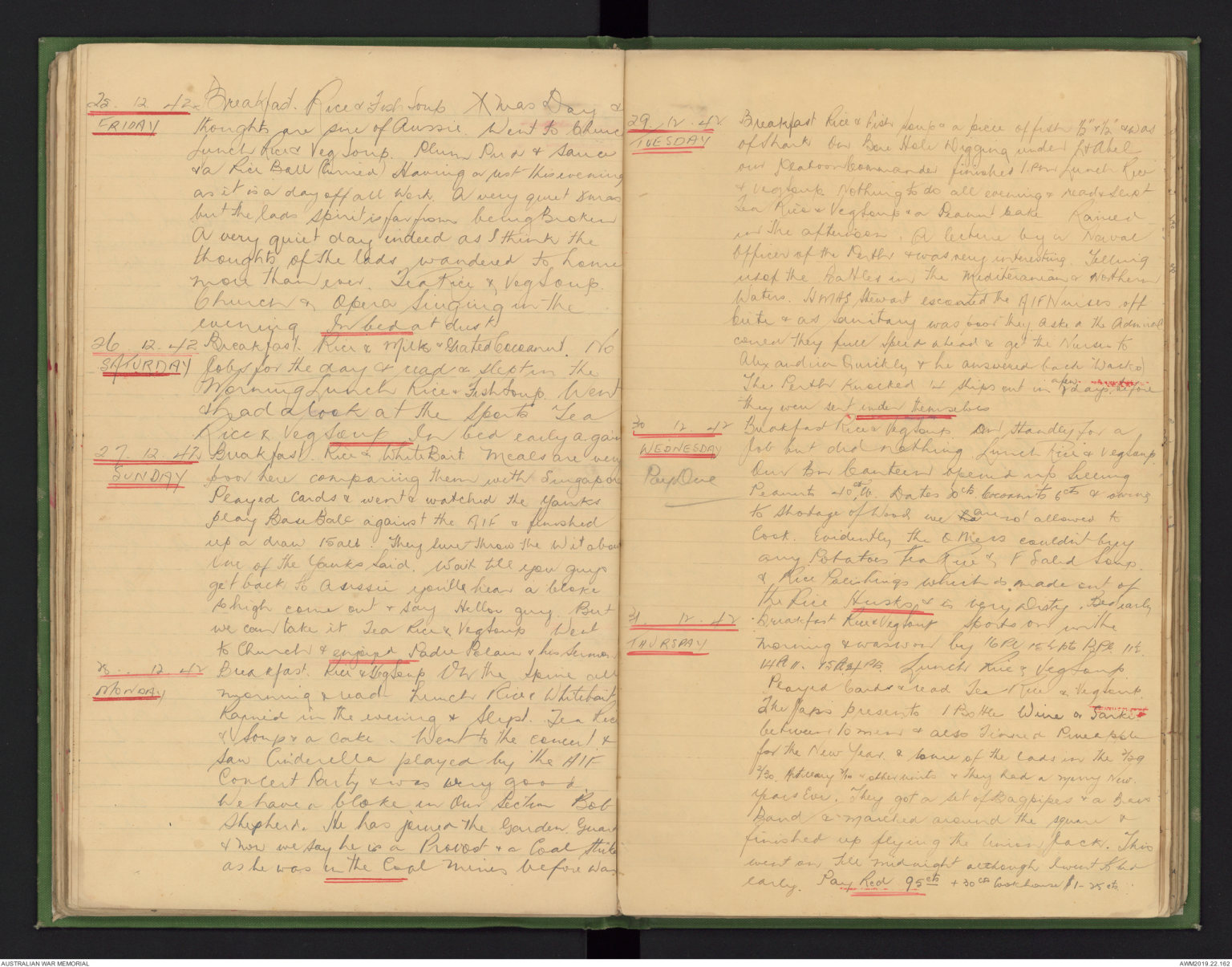 Breakfast Rice & Fish soup a piece of fish ½" x ½" & was of shark On Bore Hole Digging under Lt Abels our Platoon Commander finished 1.pm Lunch Rice & Veg Soup Nothing to do all evening & read & slept Tea Rice & Veg Soup & a Peanut cake. Rained in the afternoon. A lecture by a Naval Officer of the Perth & was very interesting. Telling us of the Battles in the Mediterranean & Northern Waters. HMAS Stewart escorted the AIF Nurses off Crete & as sanitary was poor they asked the Admiral could they full speed ahead & get the Nurses to Alex and in quickly & he answered back "Wacko" The Perth Knocked 11 ships out in ^a few days before they were sent under themselves |