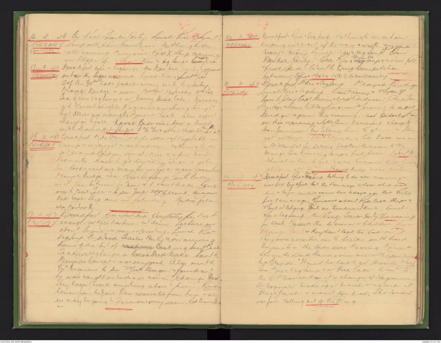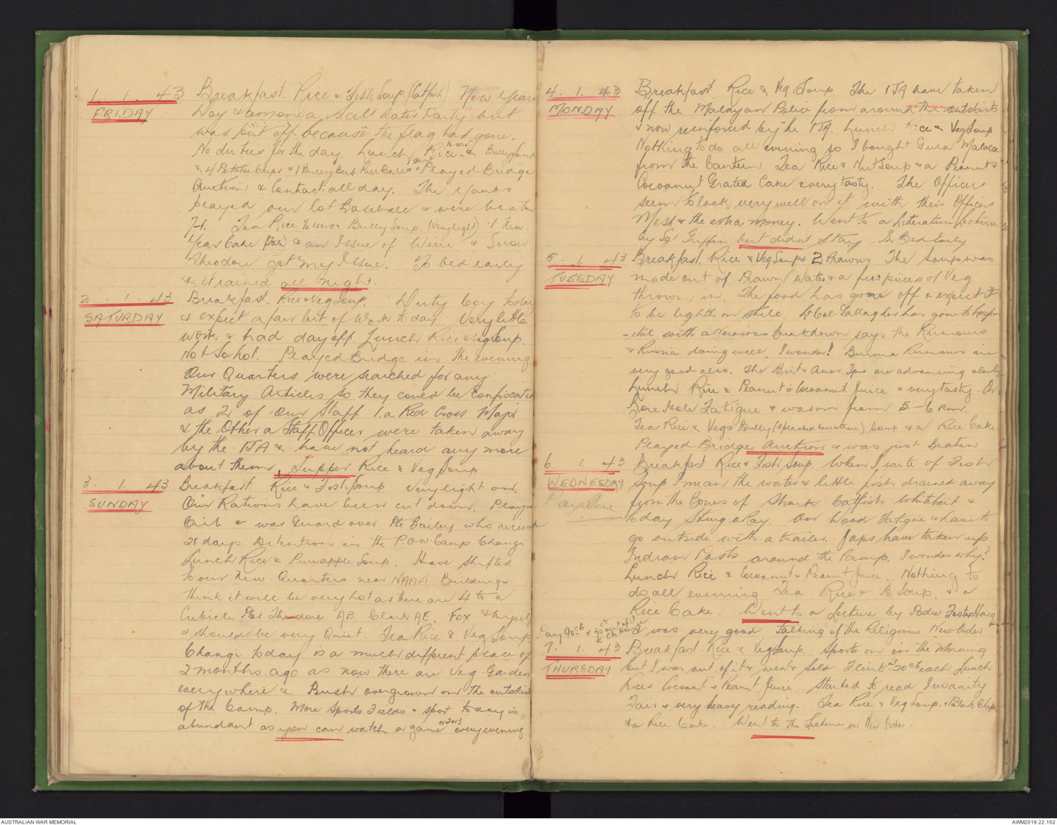Breakfast Rice & Veg Soup. Duty Coy today & expect a fair bit of work today. Very little work & had day off. Lunch Rice & Veg Soup not so hot. Played bridge in the evening Our Quarters were searched for any military articles so they could be confiscated as 2 of our staff 1.a Red Cross Major & the Other a Staff Officer were taken away by the IJA & have not heard any more about them. Supper Rice & Veg Soup |