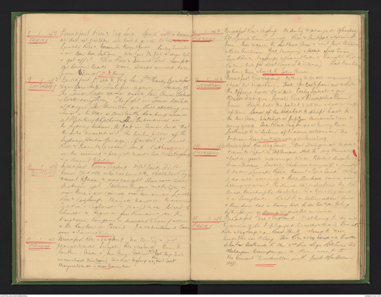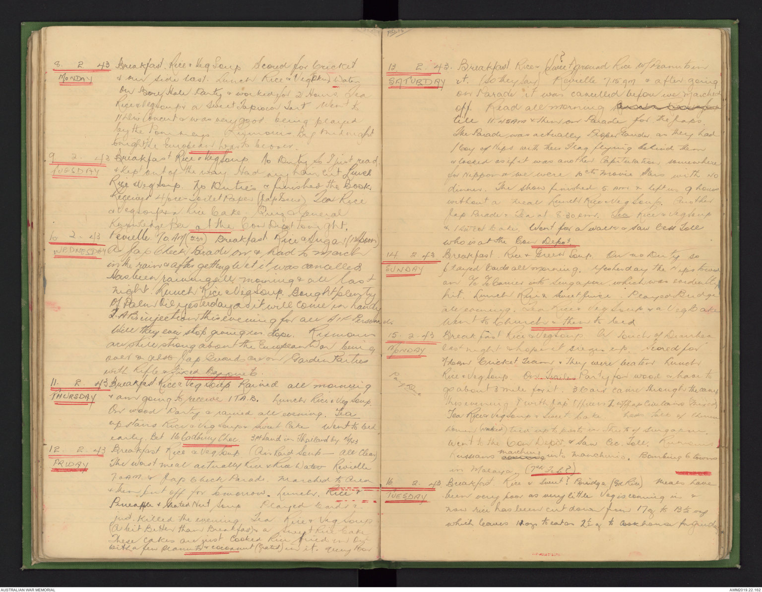 Breakfast Rice & Fish Soup very light on. Our rations have been cut down. Played out & was Guard over Pte Bailey who received 28 days Detention in the P.O.W. Camp Changi Lunch Rice & Pineapple soup. Have shifted to our new Quarters near NAAFI Building - think it will be very hot as there are 4 to a cubicle. Pt Theodore AB, Clark AE, Fox & myself & should be very quiet. Tea Rice & Veg Soup Changi today is a much different place of 2 months ago as no there are Veg Gardens everywhere & Bush overgrown on the outskirts of the Camp. More sports fields & sport today is abundant as you can watch a game ^or 2 or 3 every evening |