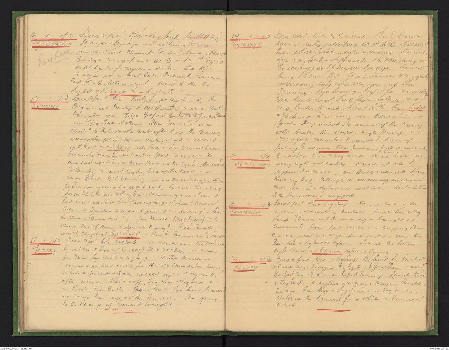 Breakfast Rice & Veg Soup. No Work in the morning so watched & scored Cricket 2/26 v 27th Bde. A Win for 2/26 Bn. Lunch Rice & Veg Soup. 2 Hrs [[?]] in evening as preparing for 26.1.43 (Foundation Day) & while a parade a Jap called in & 10 minutes after we were broken off. Tea Rice & Veg Soup & a Bully Rice Ball. Java Weed has been Scarce & a large line up at the Canteen Am going to the Change of Concert tonight |