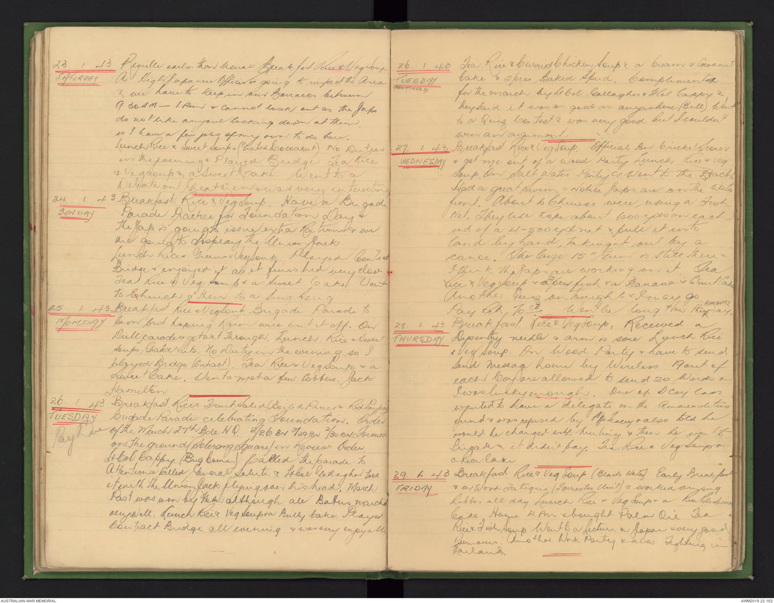 Breakfast Rice & Fruit Salad (Boiled [[?]] Red [[Paypay]]) Brigade Parade celebrating Foundation. Order of the March 27th Bde HQ. 2/26 BN 2/29 BN 2/30 BN Formed on the ground (Selerang Square) in Review Order. LtCol Cappy ([[Bug Coman?]]) Called the parade to Attention & called General Salute & LtCol Gallagher took it with the Union Jack flying over his head. March Past was won by 2/[[?]] Bn although all Battns marched very well. Lunch Rice & Veg Soup & a Bully Cake. Played Contract Bridge all evening & was very enjoyable. Tea Rice & Veg Soup |