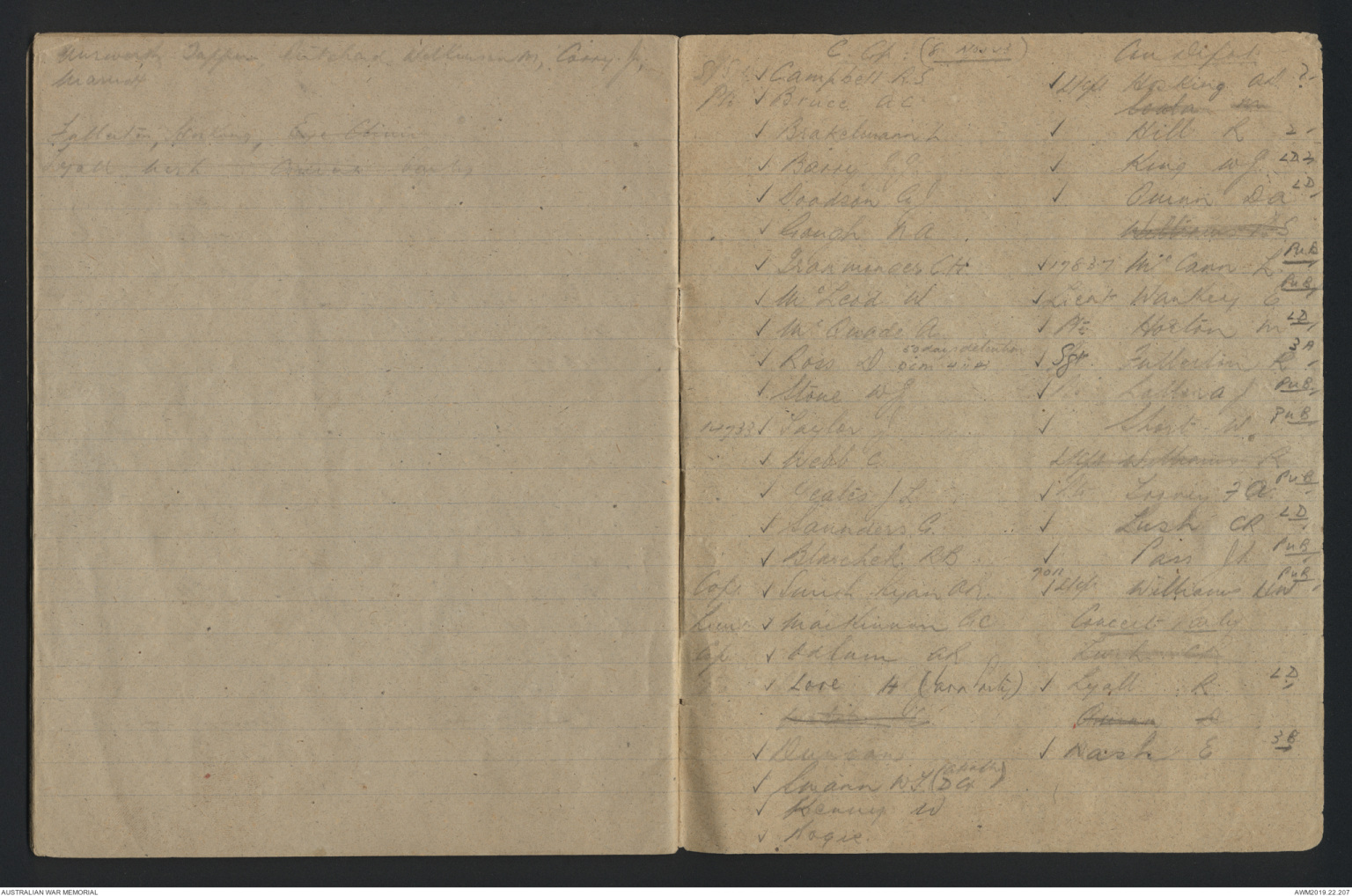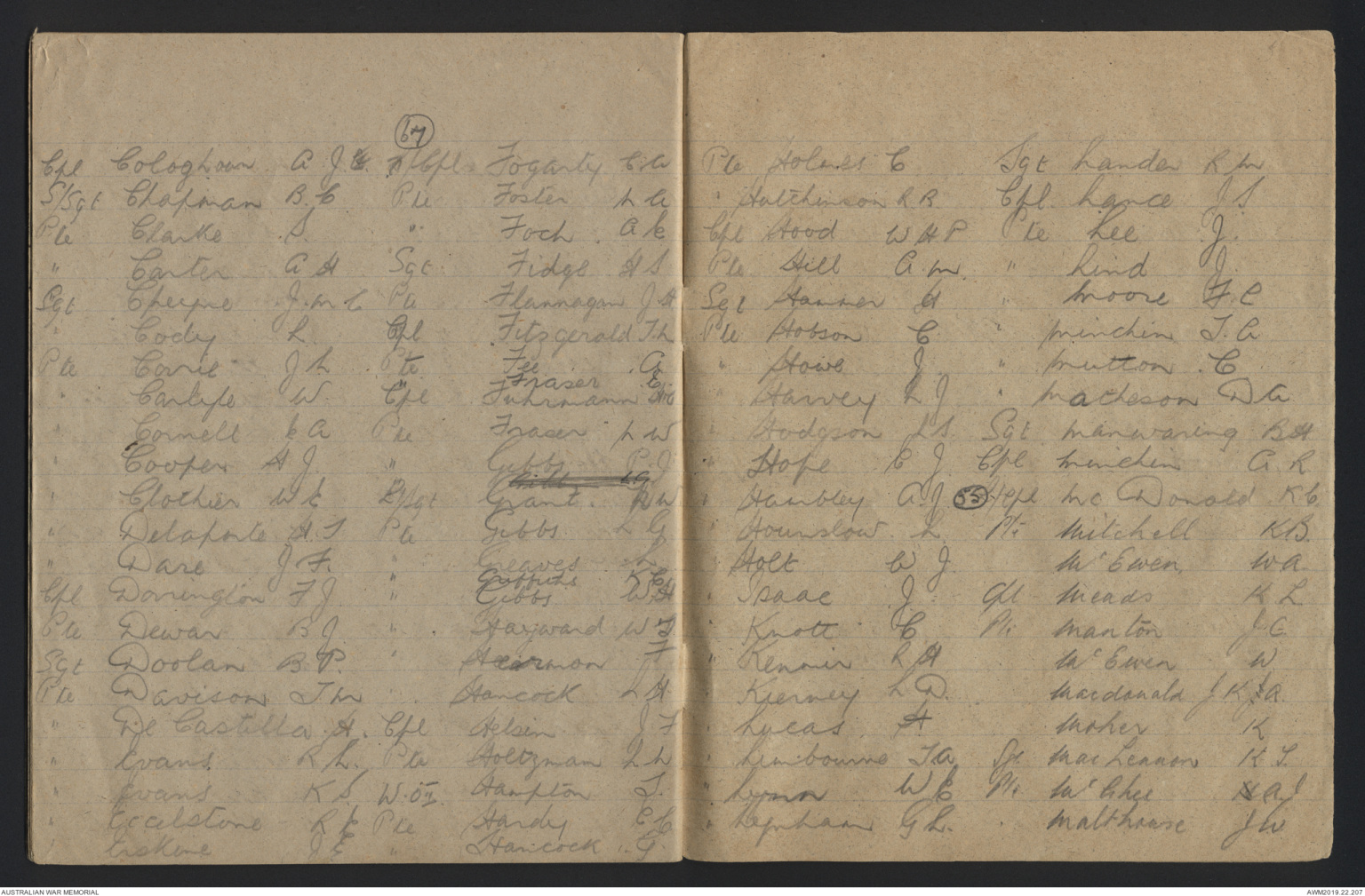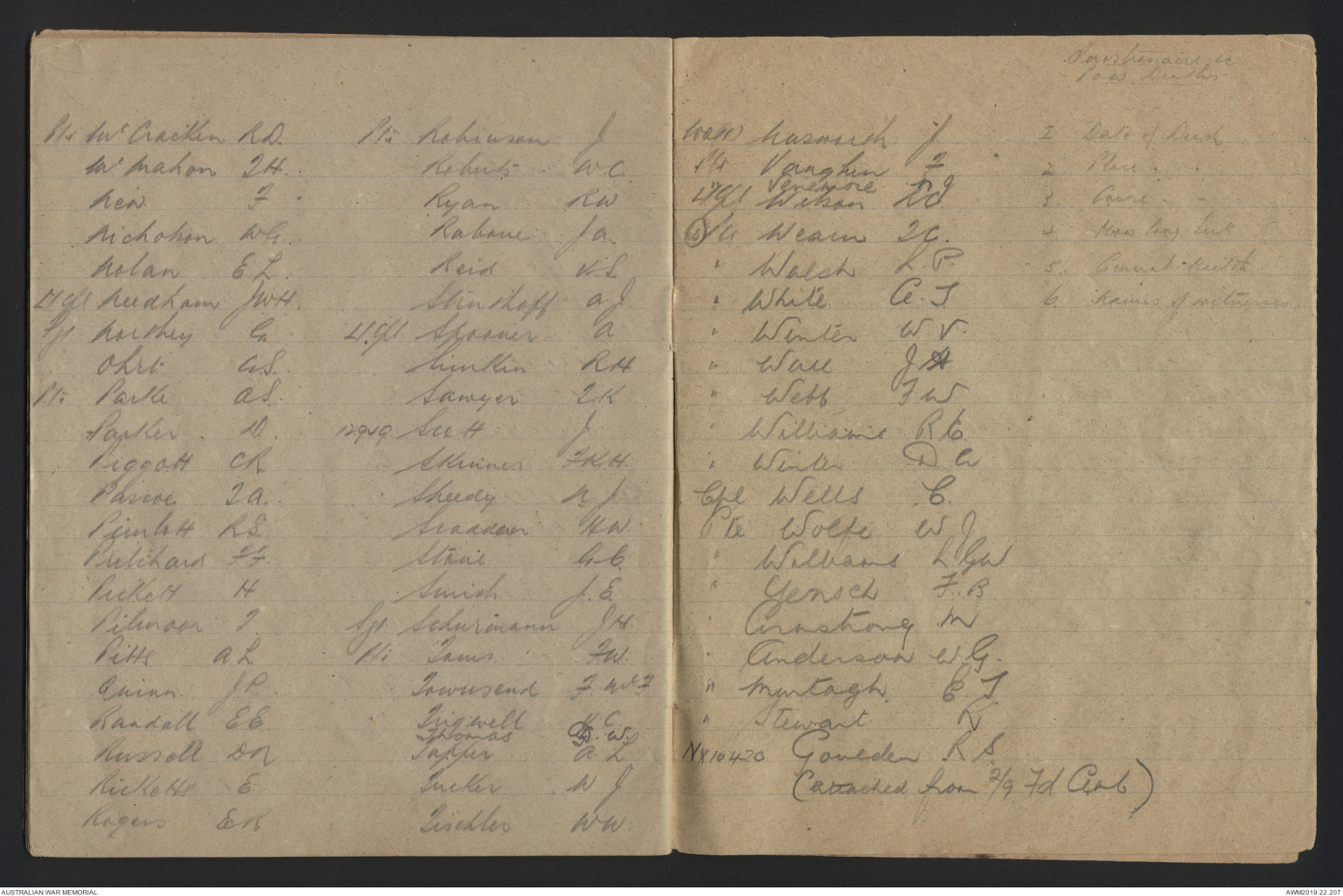 S/Sgt ✓ Campbell R.S. Pte ✓ Bruce A C ✓ Brakelmann L ✓ Barry J.J. ✓ Gough N A ✓ [[?]] G.H. ✓ McLeod W ✓ McQuade A ✓ Ross D 50 days detention D C M 4 ✓ Stone W J 14733 Taylor ✓ Webb C. ✓ Yeates J.L. Capt ✓ Saunders G Lieut ✓ Bluchek RB Capt ✓ Smith Ryan A R ✓ Mackinnon G C ✓ Odlam AR. ✓ Lore H ( [[?]] Party) ✓ Duncan D Cop) ✓ Kenney W ✓ Rogie