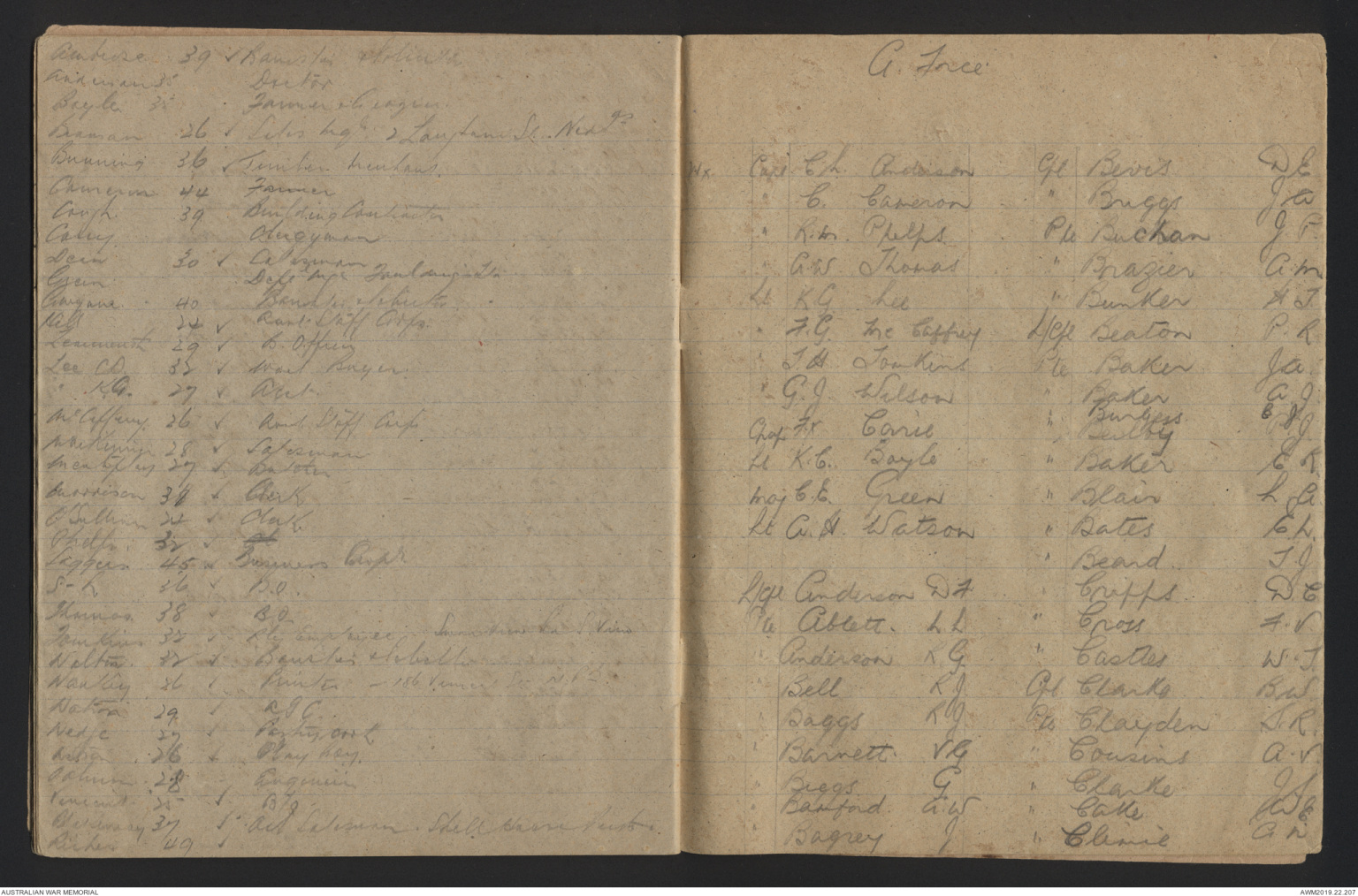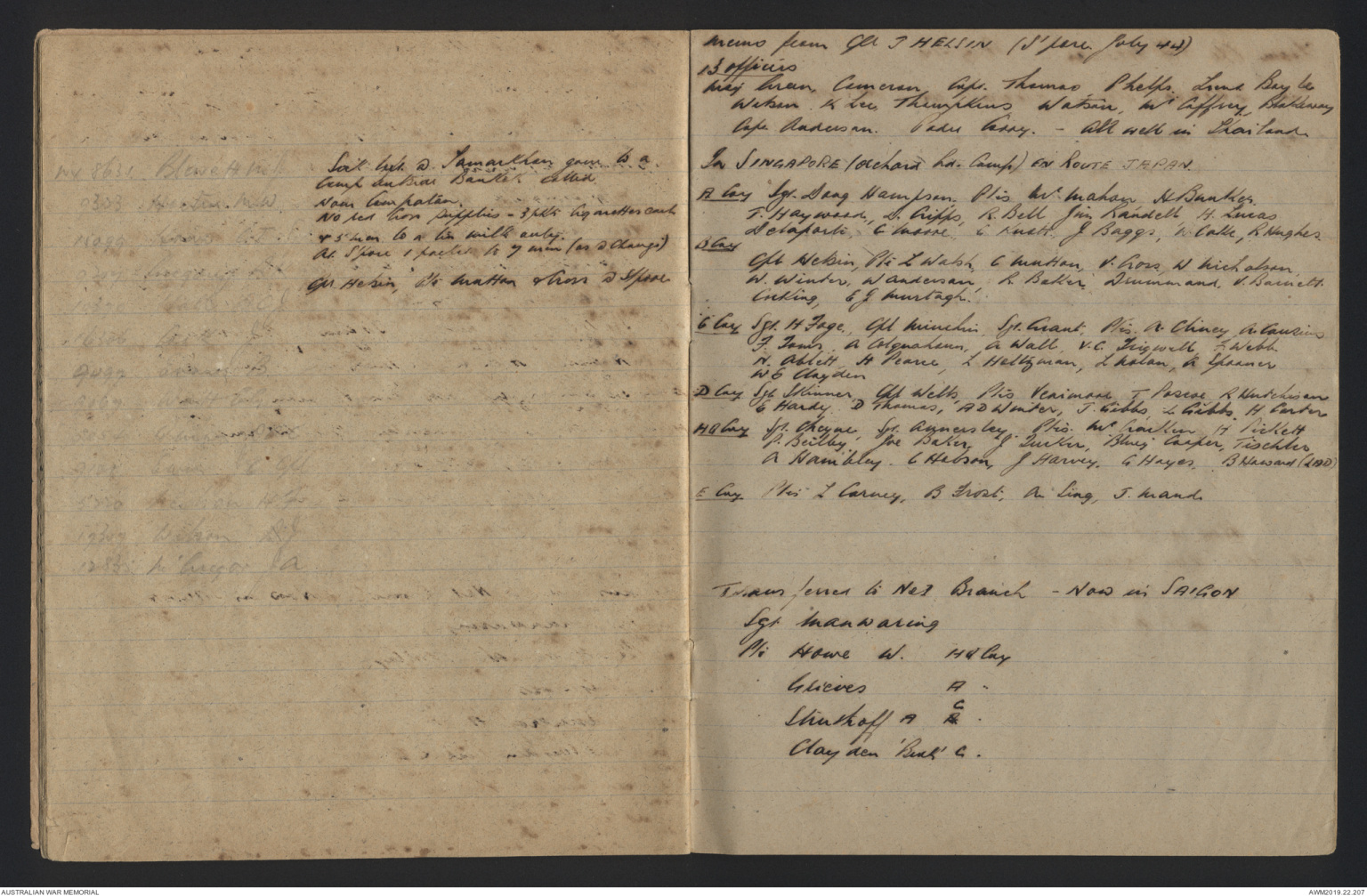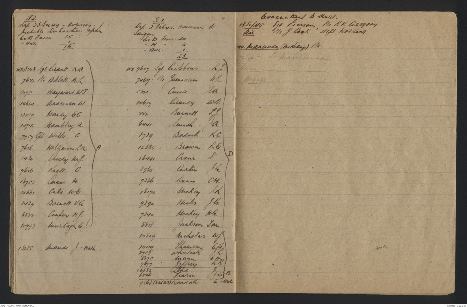 S/Sgt ✓ Campbell R.S. Pte ✓ Bruce A C ✓ Brakelmann L ✓ Barry J.J. ✓ Gough N A ✓ [[?]] G.H. ✓ McLeod W ✓ McQuade A ✓ Ross D 50 days detention D C M 4 ✓ Stone W J 14733 Taylor ✓ Webb C. ✓ Yeates J.L. Capt ✓ Saunders G Lieut ✓ Bluchek RB Capt ✓ Smith Ryan A R ✓ Mackinnon G C ✓ Odlam AR. ✓ Lore H ( [[?]] Party) ✓ Duncan D Cop) ✓ Kenney W ✓ Rogie