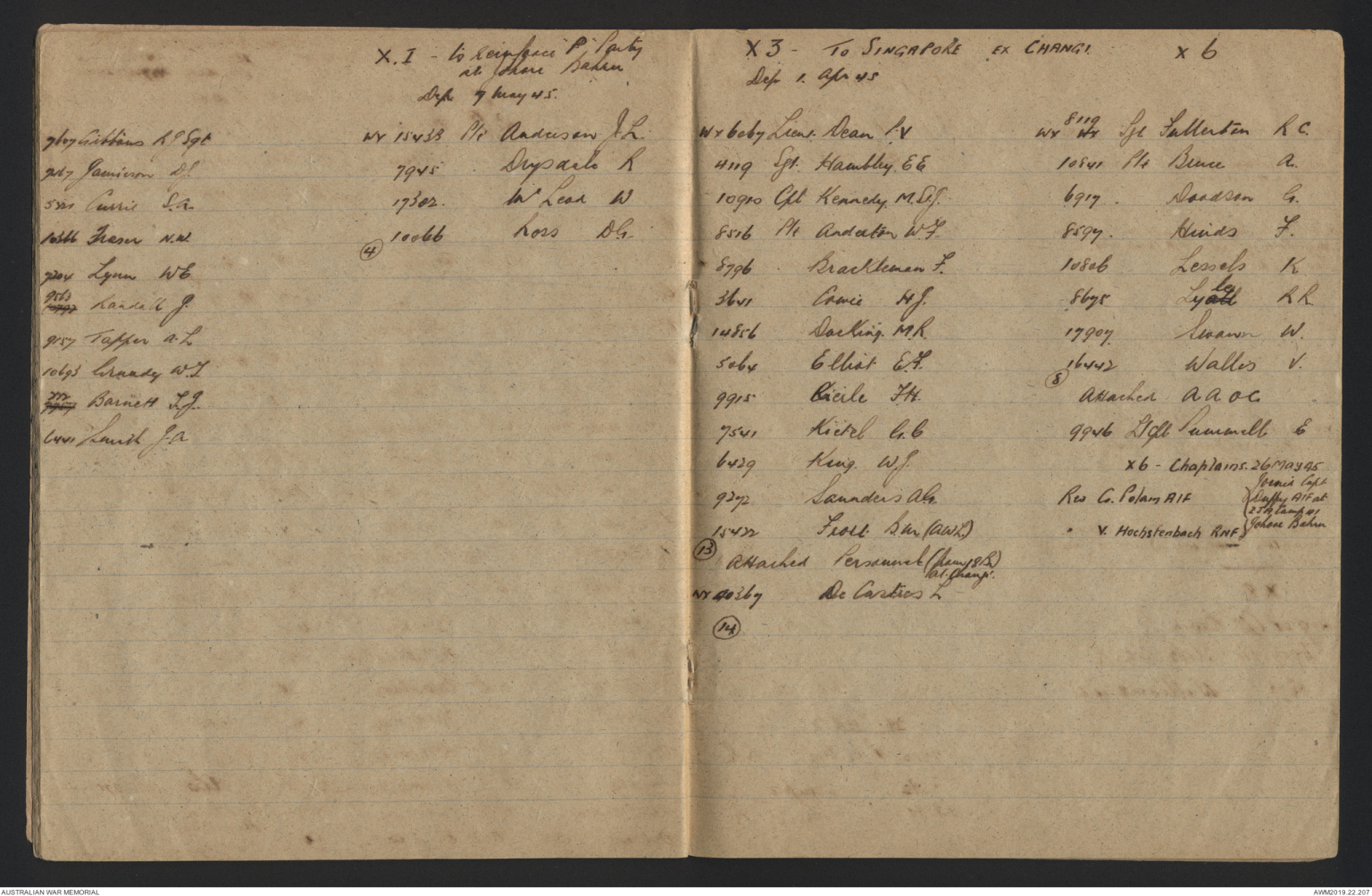 WY 6067 Lieut Dean P.V. 4119 Sgt Hambley E E 10910 Cpl Kennedy M.St J. 8796 Brackleman F 3641 Cowie H.J. 14856 Docking. M.R. 5064 Elliot E.F. 9915 Keirle F.H. 6429 King. W.J. (13)Attached Personnel (from 18 Bn) at Changi. (14) |
