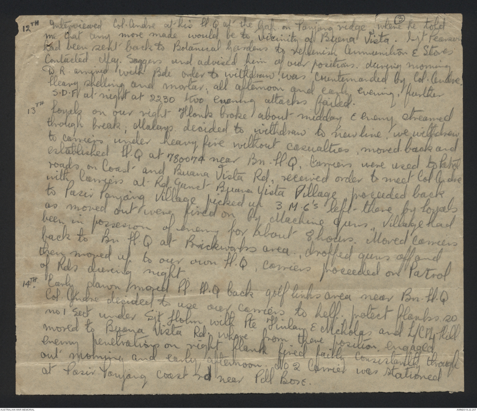 [*12TH*] Interviewed Col. Andre at his H.Q. at the Gap on Panjang ridge where he told