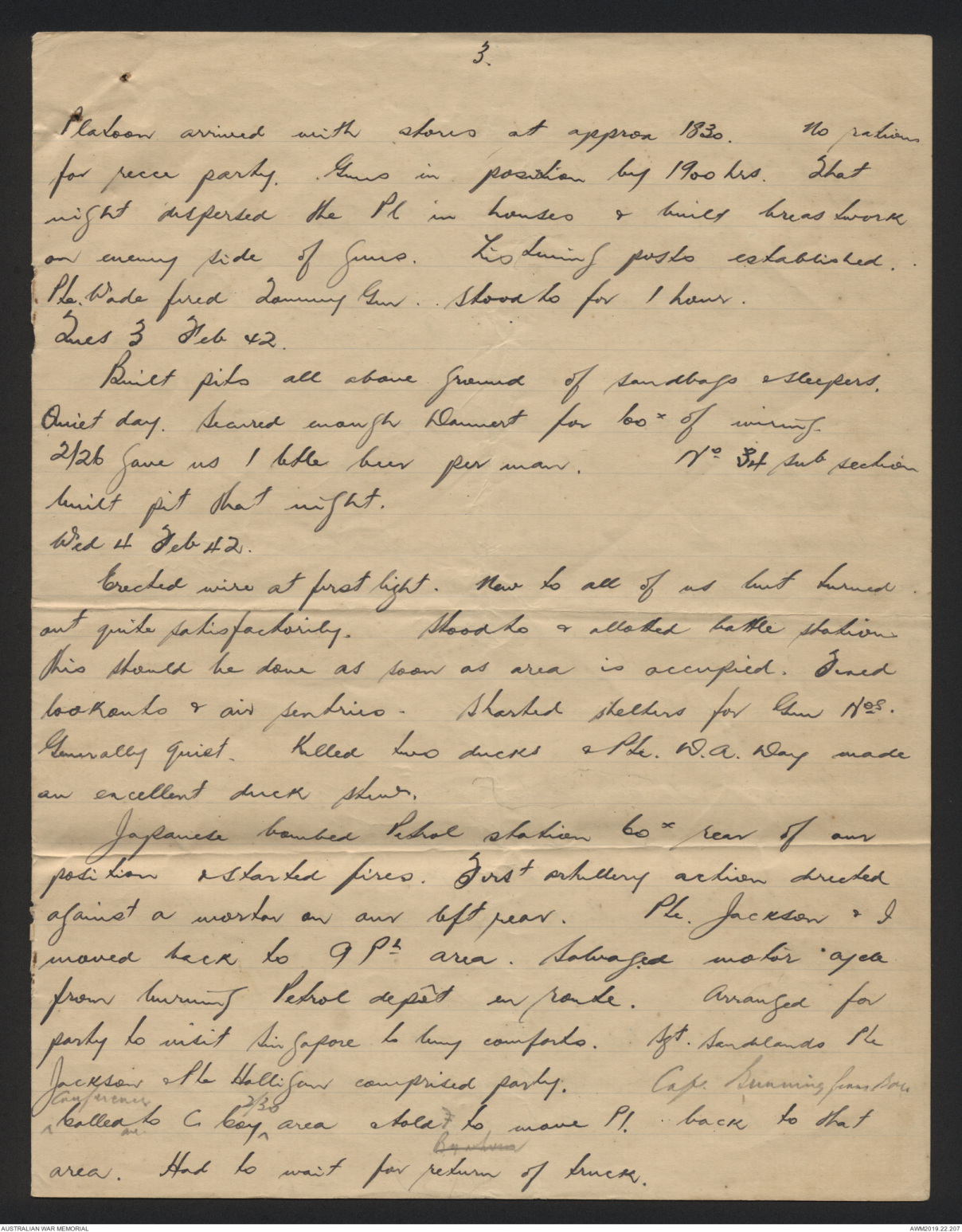 Fri 6 Feb 42. into shed. Breakfasted & dispersed platoon to