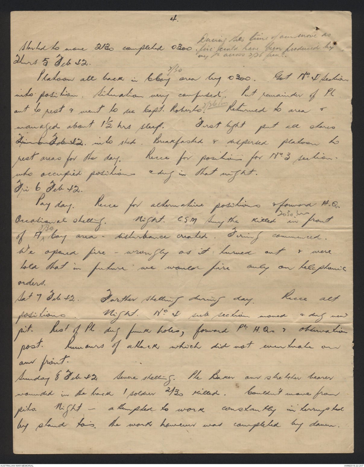 Sat 7 Feb 42. Further shelling during day. Recce alt