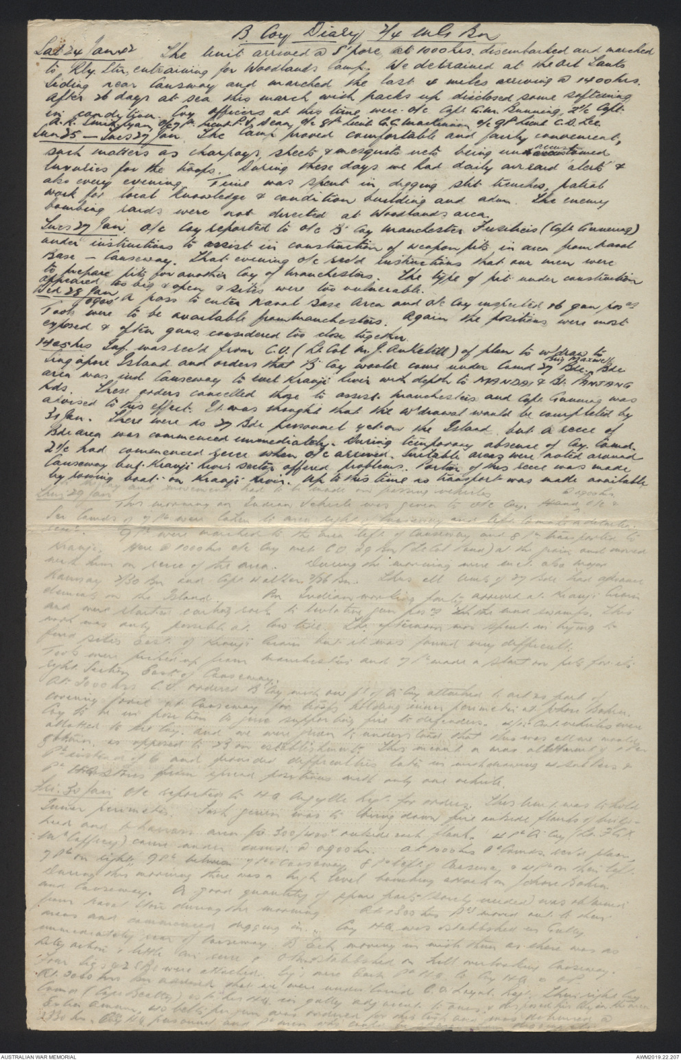 Sat 24 Jan 42 The Unit arrived @ S'pore, at 1000hrs disembarked and marched