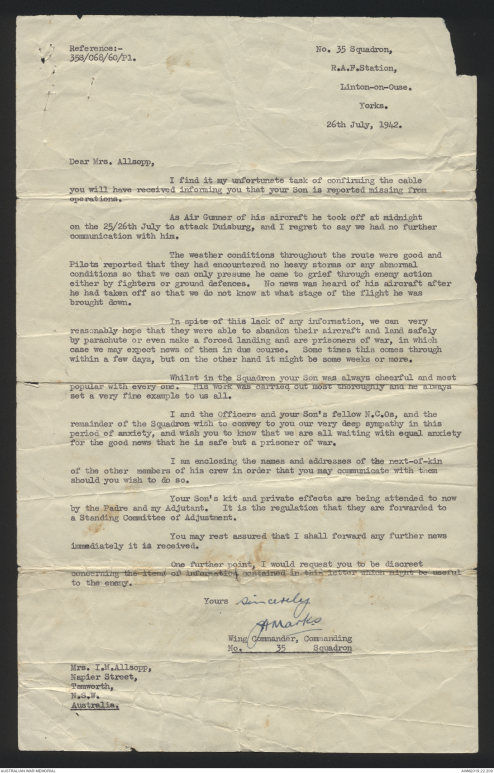 remainder of the Squadron wish to convey to you our very deep sympathy in this period of anxiety, and wish you to know that we are all waiting with equal anxiety for the good news that he is safe but a prisoner of war.