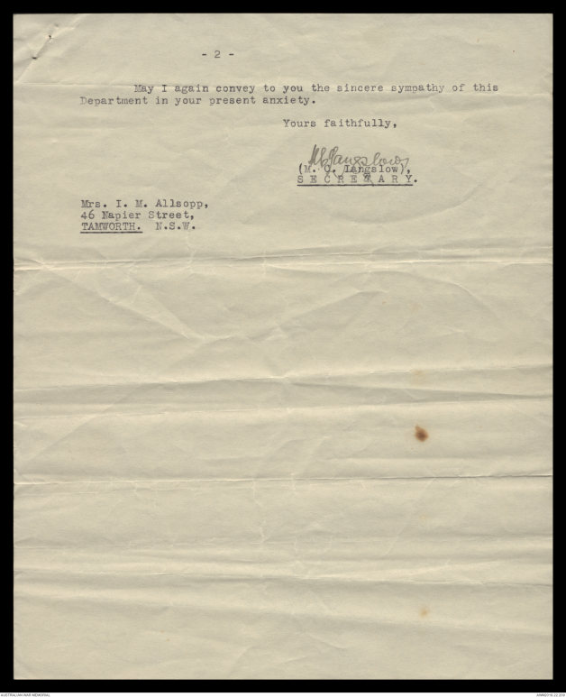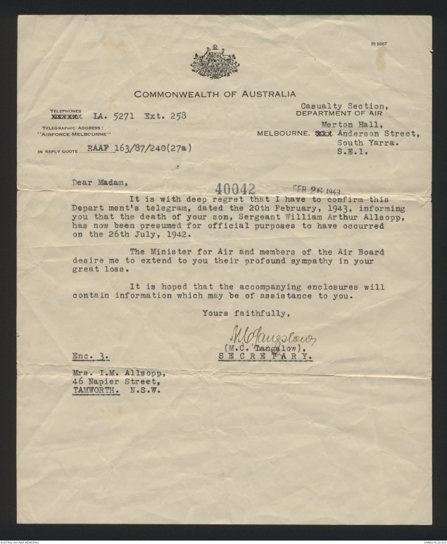 you that the death of your son, Sergeant William Arthur Allsopp,