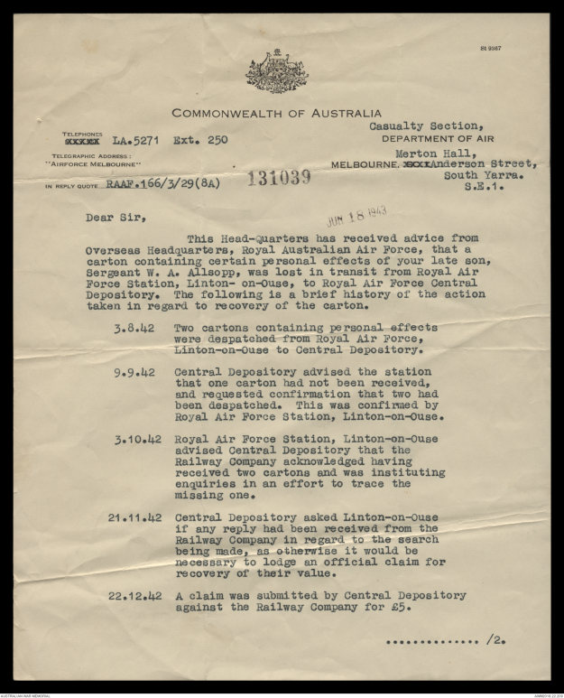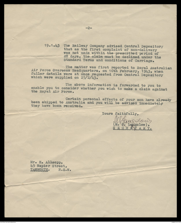 Sergeant W. A. Allsopp, was lost in transit from Royal Air