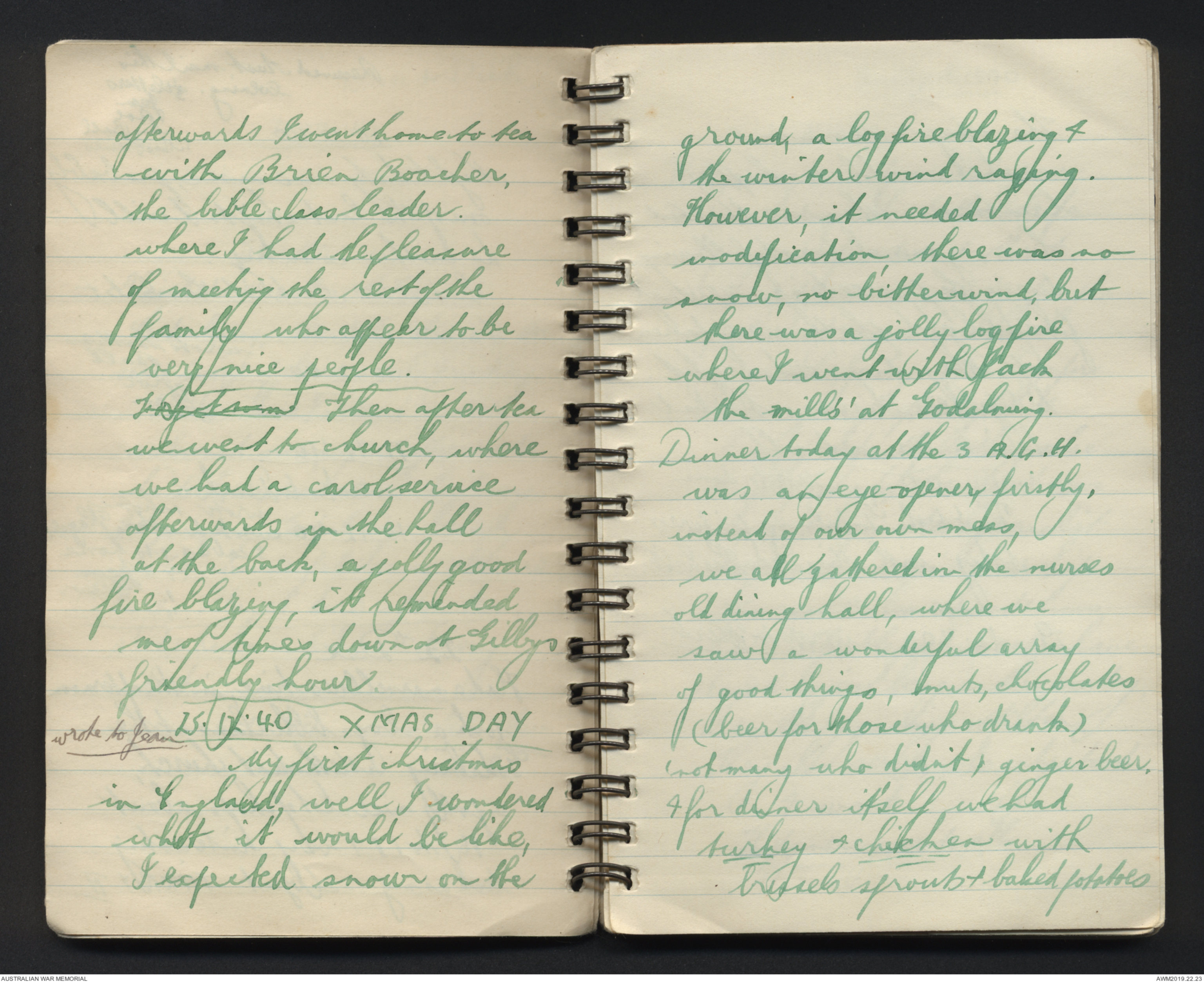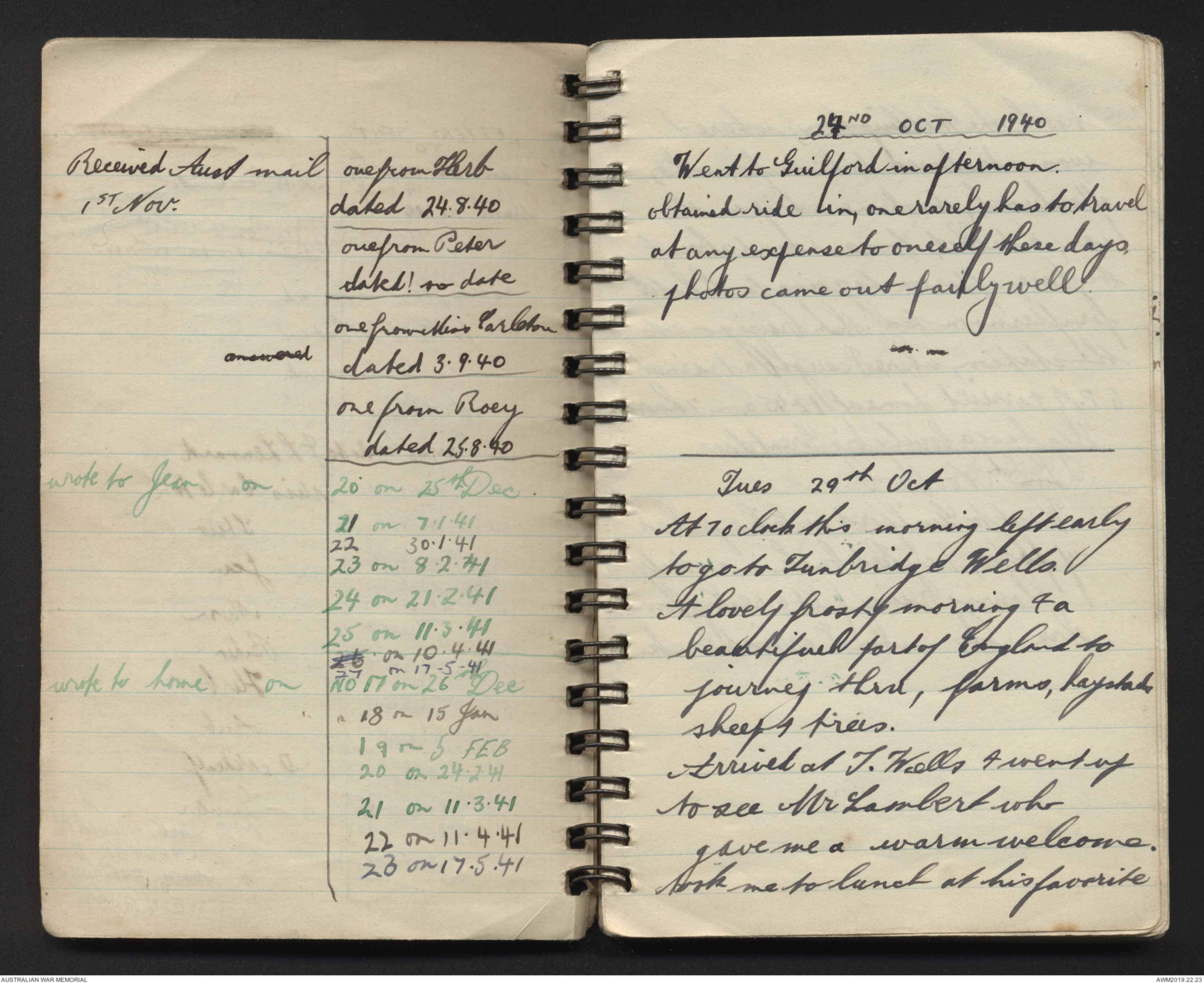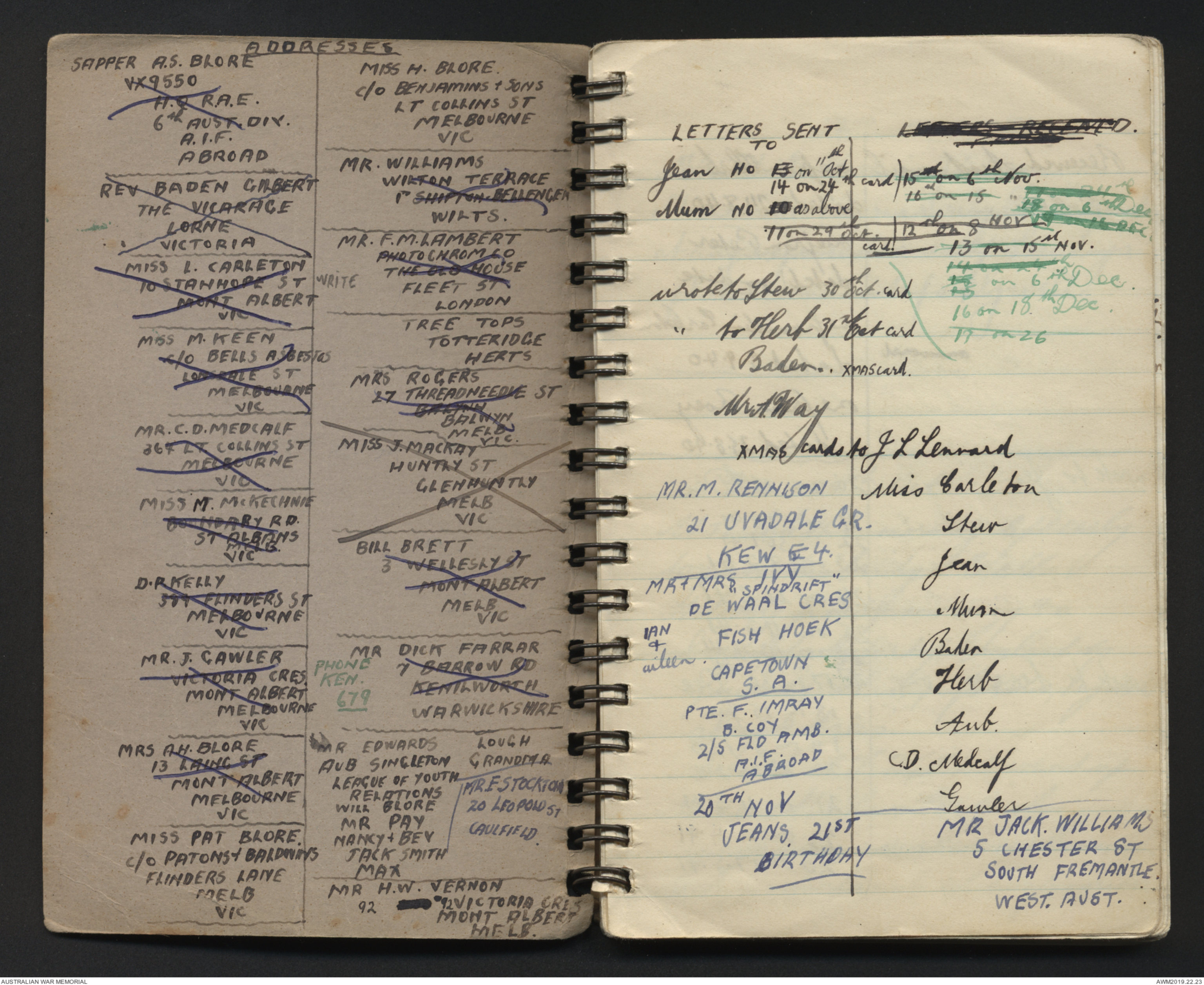 Received Aust mail One from Herb 1st Nov dated 24.8 40 _________________ one from Peter dated ! no date _______________ one from Miss Carleton answered dated 3.9.40 _________________ one from Roey dated 25.8.40 __________________ wrote to Jean on 20 on 25th Dec 21 on 7.1.41 22 on 30.1.41 23 on 8.2.41 24 on 21.2.41 25 on 11.3.41 wrote to home on NO 17 on 26th Dec " 18 on 15 Jan 19 on 5 Feb 20 on 24.2.41 21 on 11.3.41 22 on 11.4.41 23 on 17.5.41