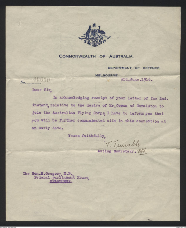 instant, relative to the desire of Mr. Cowan of Geraldton to
