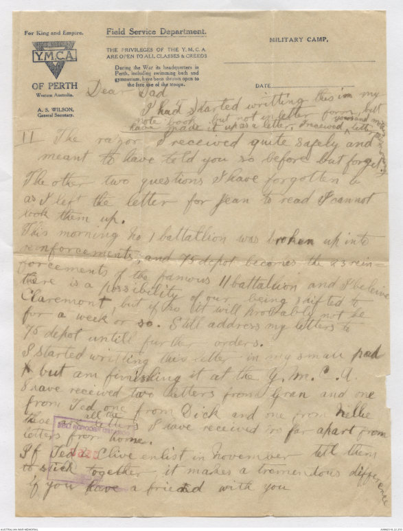 I started writting this letter in my small padx but am finishing it at the Y.M.C.A.