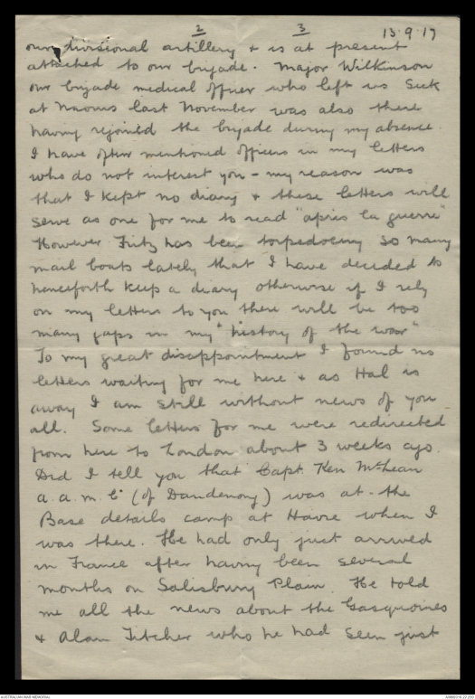 However Fritz has been torpedoing so many mail boats lately that I have decided to henceforth keep a diary otherwise if I rely on my letters to you, there will be too many