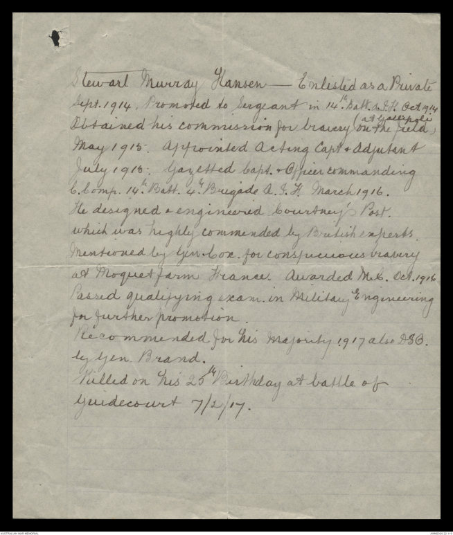 Papers relating to the service of Stewart Murray Hansen, 1915 - 1917 - Part 1