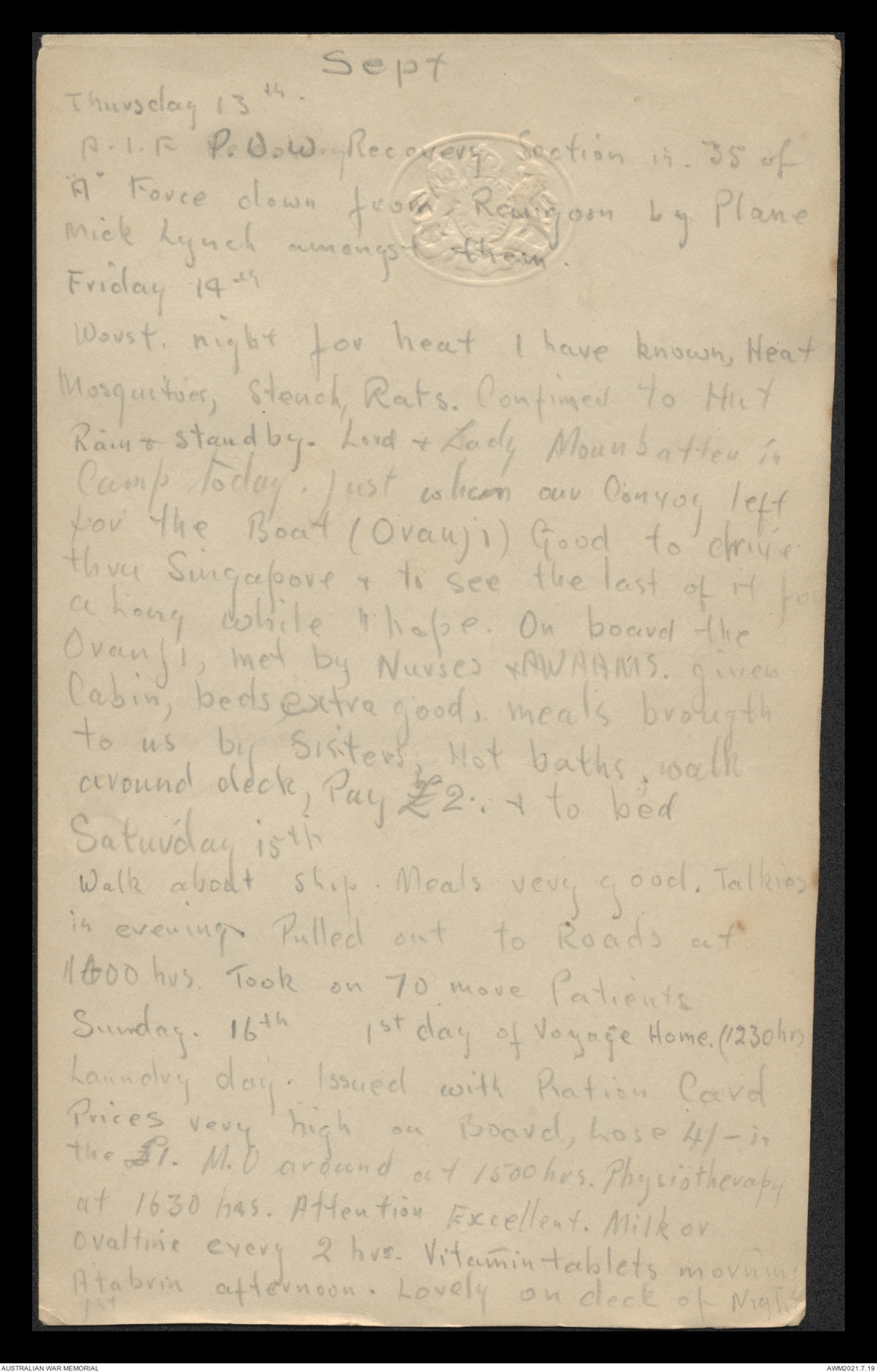 Sunday. 16th 1st day of Voyage Home. (1230 hr)